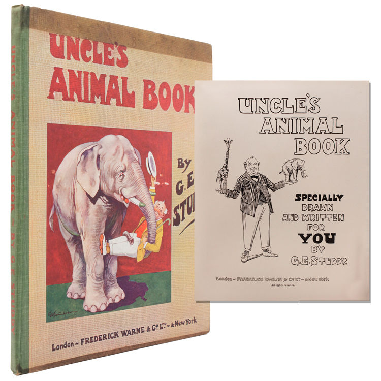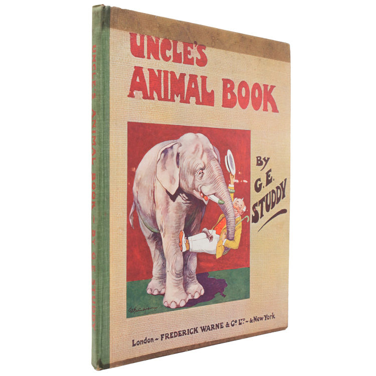 London & New York: Frederick Warne & Co. Ltd, 1920. First edition. 48] pages, illustrated by G. E. Studdy (including eight full-page color plates). 4to. Front cover is moderately browned at top and bottom edges (circa 3/4 inches in width along length of top edge and 1/8 inch at bottom edge), small, light brown stain on rear cover (at top edge, circa 3 by 1/2 inches), light wear and few nicks at tips of corners, else a very good copy, with the front cover otherwise bright, text and plates very fresh and clean. First edition. 48] pages, illustrated by G. E. Studdy (including eight full-page color plates). 4to. G. E. Studdy (1878-1948) studied art at Heatherley's Art School in London and animal anatomy and drawing at Calderon's Animal School. At the turn of the century he began to submit drawings for publication and contributed to numerous periodicals including Comic Cuts, The Big Budget Comic, Boy's Own, etc. He is best know for his creation of Bonzo, which brought him international fame. A scarce, early, title by G. E. Studdy [no copy located on OCLC].