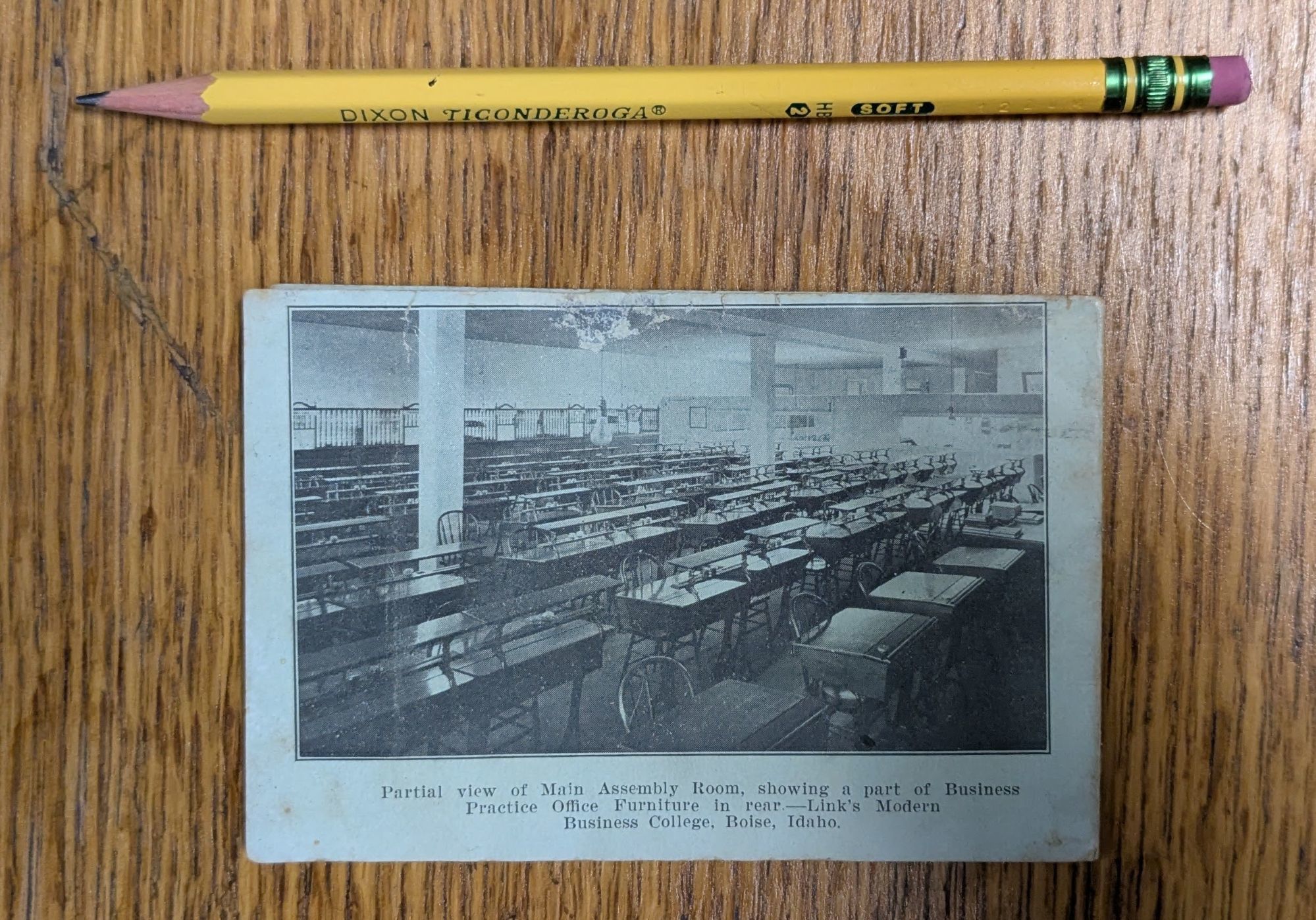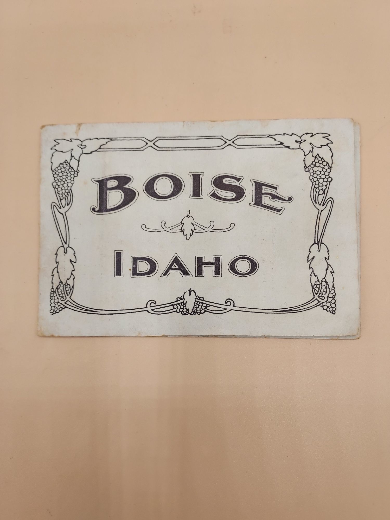 1907. Ephemera. [12 cm x 8 cm] Scenes printed on a sheet of paper folded accordion-style and mounted to printed green wraps. There is an advertisement for "Link's Modern Business College" printed on the verso of the front wrap. Light wear from wraps. With 6 pages of informative text. Views include: Longfellow School; O. R. & N. Depot; The Cox Residence; Barber Lumber Co. Mills; Rear View of Natatorium.