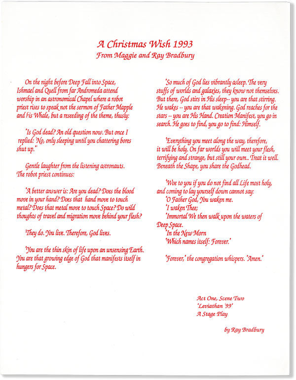 [Los Angeles: Privately Printed by Ray Bradbury, 1993]. First Edition. Broadside, with text printed in red in two columns on white laid paper, measuring 8.5" x 11". A Fine copy. Late Christmas broadside produced by Bradbury and his wife, a holiday tradition maintained by the family, sent to family and friends. This one prints Act One, Scene Two of his stage play Leviathan 99.