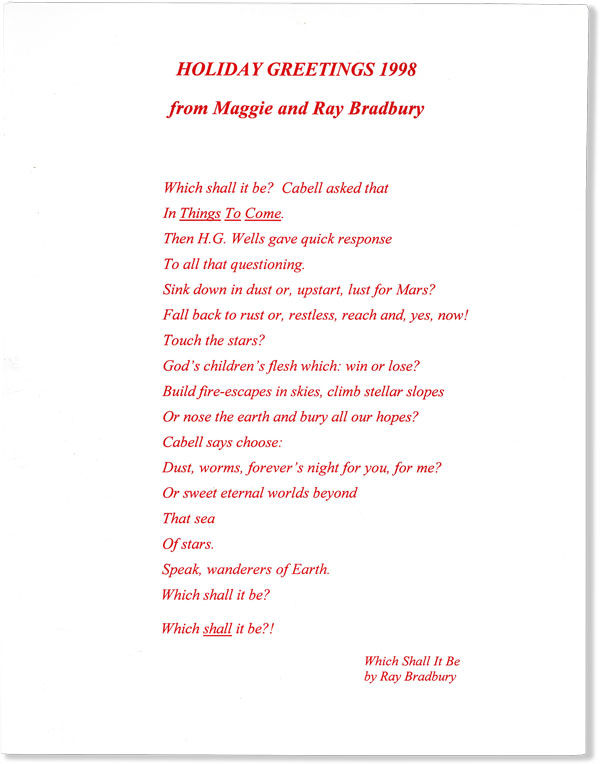 [Los Angeles: Privately Printed by Ray Bradbury, 1998]. First Edition. Broadside, with text printed in red on white laid paper, measuring 8.5" x 11". Mild handling, else a Fine copy. Late Christmas broadside produced by Bradbury and his wife, a holiday tradition maintained by the family, sent to family and friends. This one prints his poem "Which Shall It Be.
