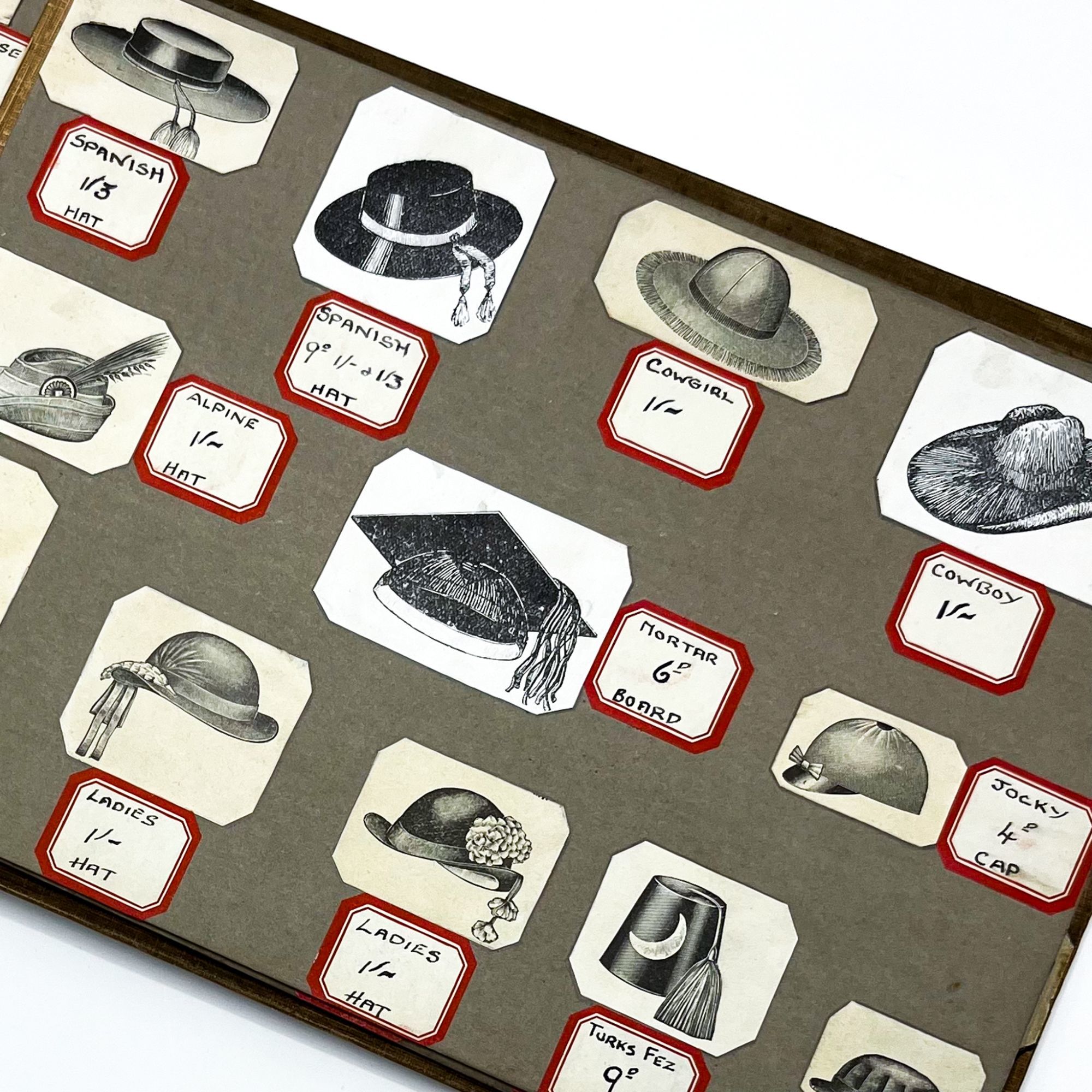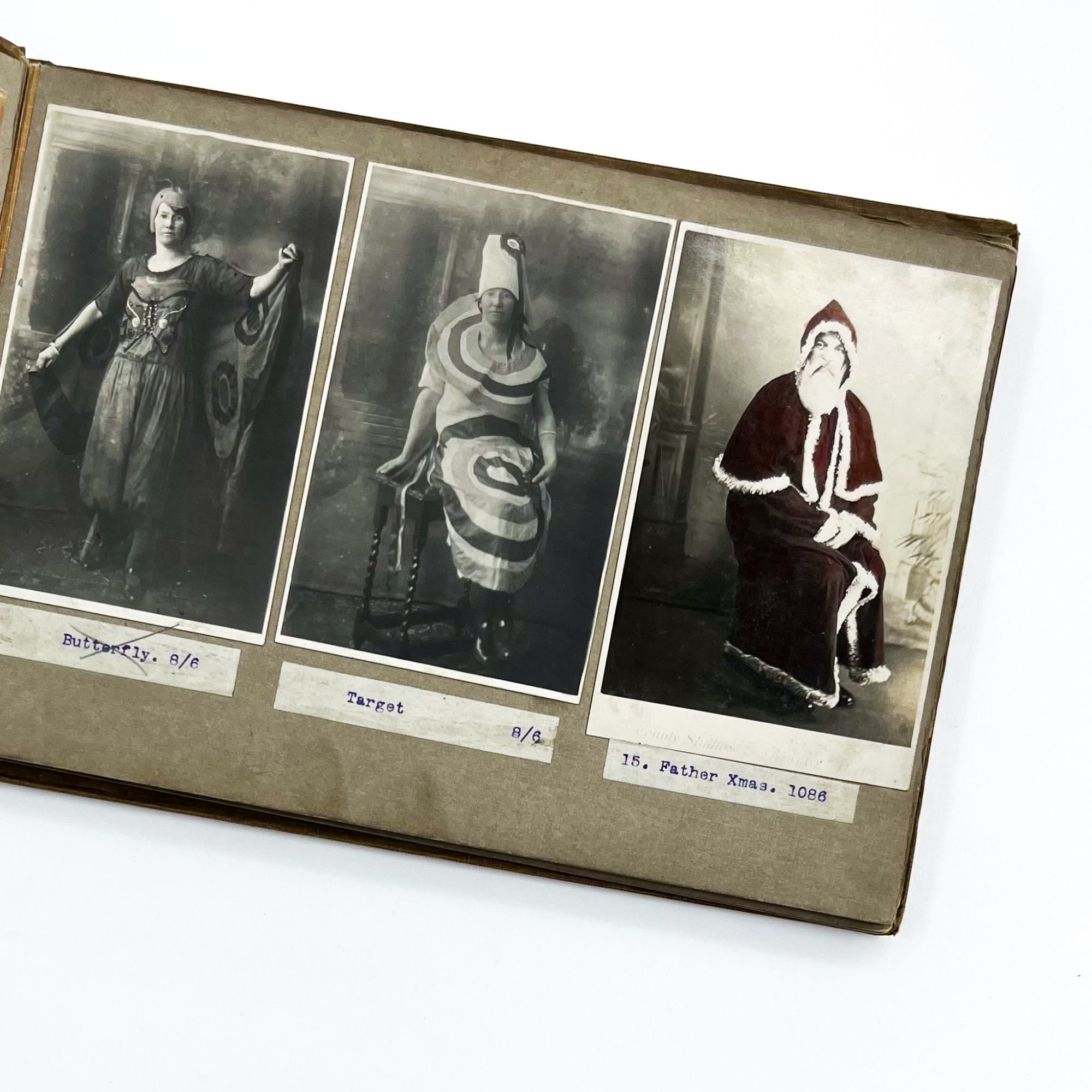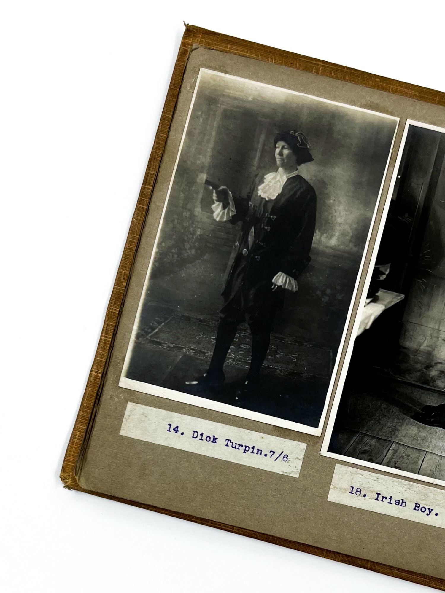 Derby: n.p., 1920. Very good plus.. Original photograph album of a variety of costumes and accessories able to be rented from a photography studio in Derby, England, including outfits emblematic of the Imperial mindset of the 1920s. Clowns, court pages in awfully short shorts, and a powder puff are just a few of the variety of fancy dress costumes to be rented from the County Carnival Stores (and photograph studio) in Derby – "an unlimited selection at reasonable prices" as described by the DERBY DAILY TELEGRAPH in September 1921, intended to be worn to events and celebrations. The outfits in this album range from the charming (a butterfly costume with wings and a matching hat with antennae) to the strange (who wants to dress up like a target?!) to the nationalist (the helmet, trident, and Union Flag-emblazoned shield of Britannia). Most notably, several costumes are of cultural dress, including a "Hindoo Rajah" and a "Spanish Gipsy," as well as "Scotch Dress," with a kilt and sporran. The accessories continue this theme: alongside fezzes, Native American headdresses, and turbans there are no fewer than 12 British military hats and helmets. The inclusion of these costumes speaks to the prevailing nationalism of the British Isles at the time, rebounding from the traumas of WWI while suppressing the rising volume of protests in the British Raj and elsewhere around the Empire.