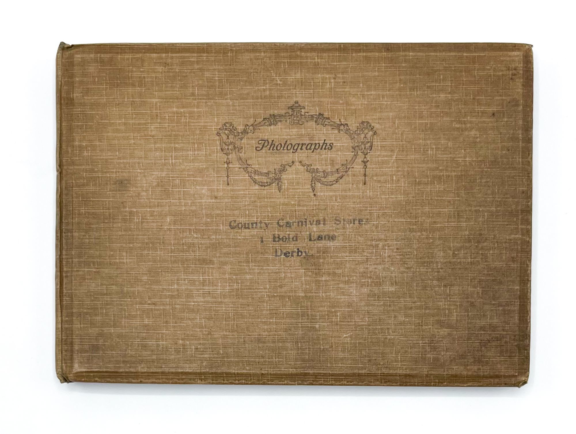 The photograph studio predates the costume arm of the business, with this album likely being produced around 1920 and then stamped with the County Carnival Stores name sometime after; we find the earliest mention of the carnival name in 1924. This is reinforced by the label and price changes over the years. An attractive snapshot of both a cultural mindset and the history of having fun. 5.25'' x 3.25'' (most photographs); 7'' x 10.25'' (album). Original brown cloth boards with title stamped in black to front and rear. 26 photographs laid onto leaves recto and verso, 11 hand-colored, many with printed location "County Studios 1 & 2 Bold Lane Derby" printed to lower edge; 108 small black-and-white illustrated cutouts of hats and other accessories. Photos and illustrations all with captions, many on printed labels pasted over earlier captions. [8] thick leaves. Scattered pencil annotations. Binding with light edgewear, some soil; a bit shaken. Leaves with scattered faint soil, some photos with mild rubbing. Firm.