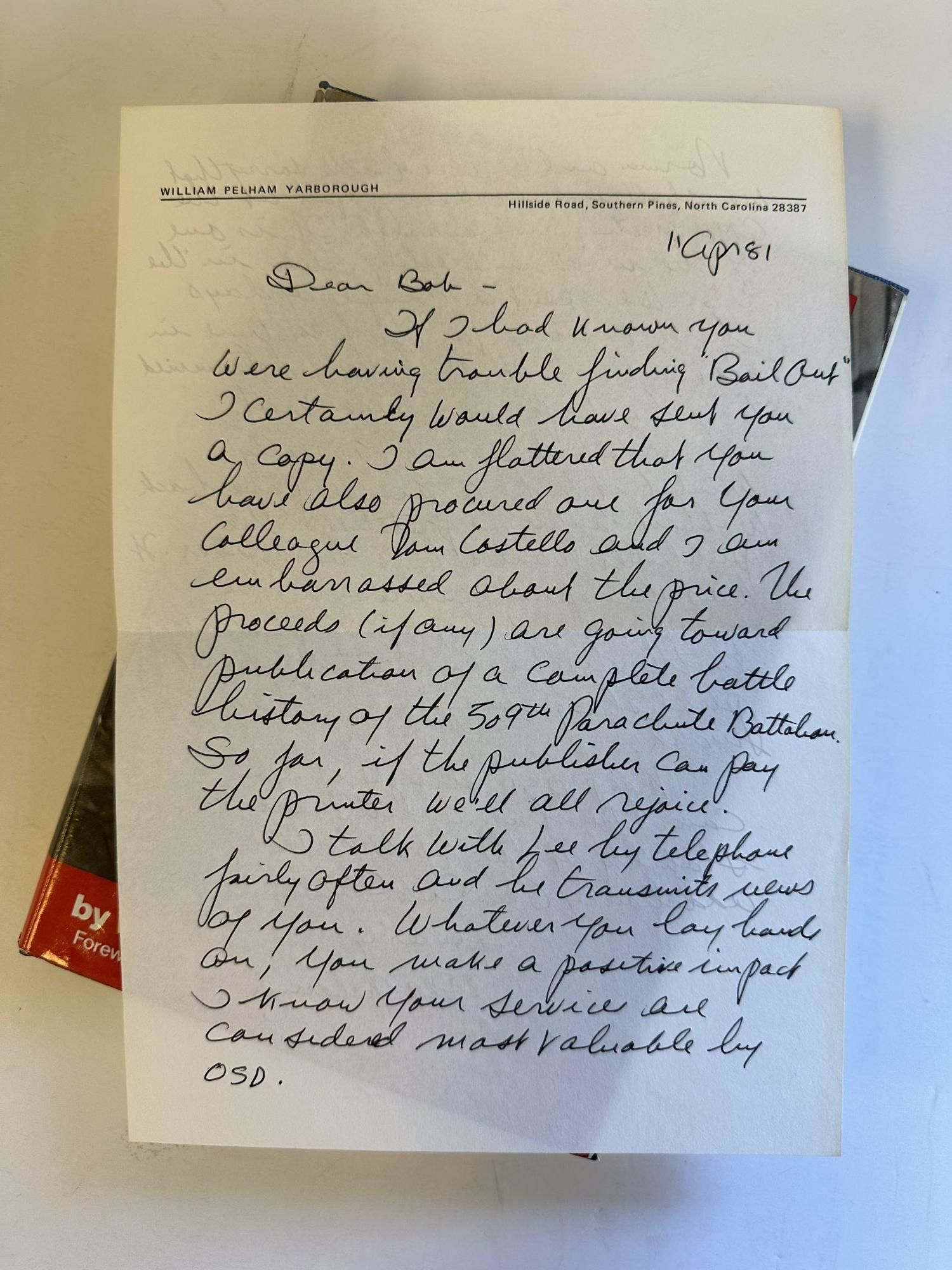 Williamstown, NJ: Phillips Publications, 1979. First Edition, First Printing. Hardcover. Octavo; v, 180 pages; VG/VG; spine greyscale photographic with red and white text; dust jacket protected with mylar; price unclipped reading "$14.95", mild shelfwear to dust jacket including small chips and a few small tears to the top of the rear cover; textblock clean; inscribed by Yarborough to Robert Silano on title reading "To Bob Silano – a rare combination of soldier and scholar. With respect and warm regards"; five items of ephemera loose within, one publisher's errata card, one promotional pamphlet from the 82nd Airborne Division War Memorial Museum, two scans of a news article on the "Yarborough Knife", and one ALS from Yarborough to Silano about the book and Silano's work at the Office of the Secretary of Defense. Shelved in Room G. 1361455. Special Collections.