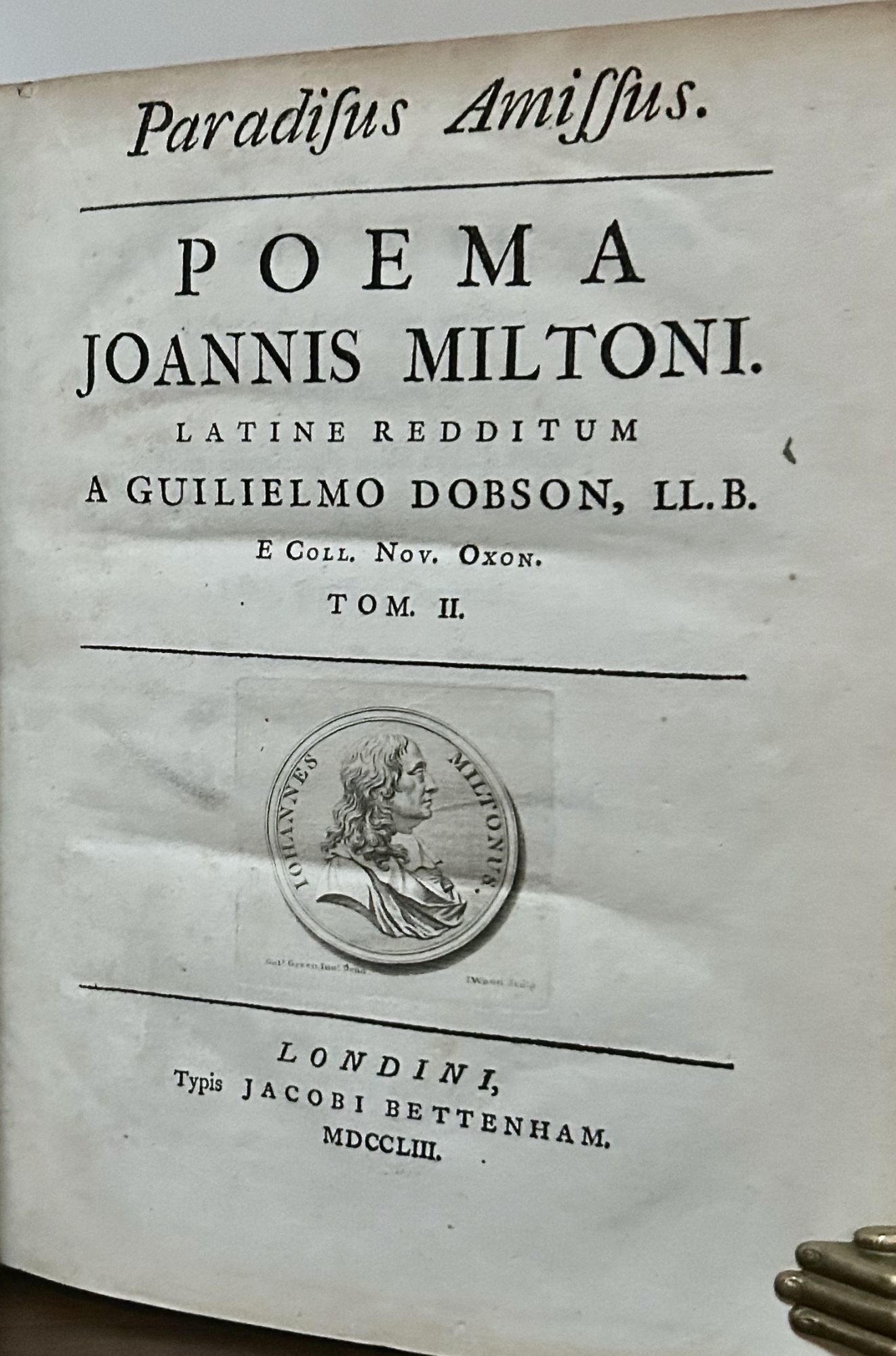 Oxford: E Theatro Sheldoniano, 1753. leather_bound. Contemporary full brown calf rebacked. Very good. 2 Vols.. 304, 303 pages. 26 x 21 cm. Errata. Latin and English text with latter in smaller type at the foot of each page. Translated by William Dobson. Dobson was an academic from New College, University of Oxford, and his translation written on commission. One theory as to the need for a Latin translation: "an attempt by the English middle-class intelligentsia to reclaim from the popular masses the preeminent English non-Biblical religious text." Interior contents very clean and fresh. Owner inscription title page of Vol. I and free endpaper of Vol. II. Raised bands, leather spine labels. small scrape front covers of both Vols. Small bookplate of R.J.W. Milton Library, Wickenheiser.