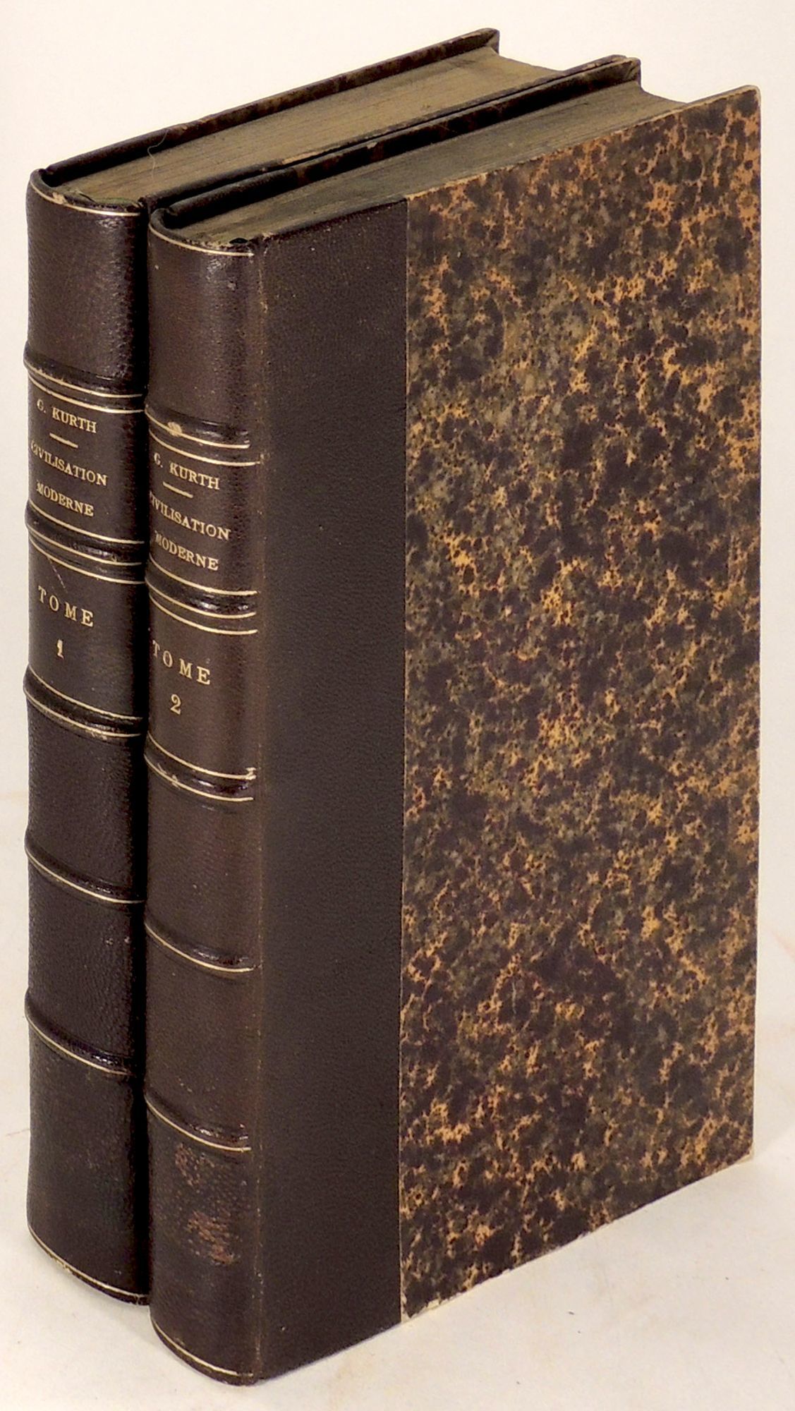 Paris: Pierre Téqui, 1912. Hardcover. Very Good. Hardcover. Sixth edition. This work discusses the formation of modern Europe. Author Godefroid Kurth (1847 - 1916) was a Belgian historian with strong Catholic views. Bound in dark brown leather over marbled paper covered boards with gilt titles and volume numbers to spines. Ex-library with evidence of stickers removed from spines and library stamps to endpapers and title pages. Light wear to corners and edges of boards. Small dampstain to top corners of first few pages of first volume. Browning to interiors, but clean overall. Marbled endpapers. Volume I: 340 pages; Volume II: 304 pages. FRE/112122.