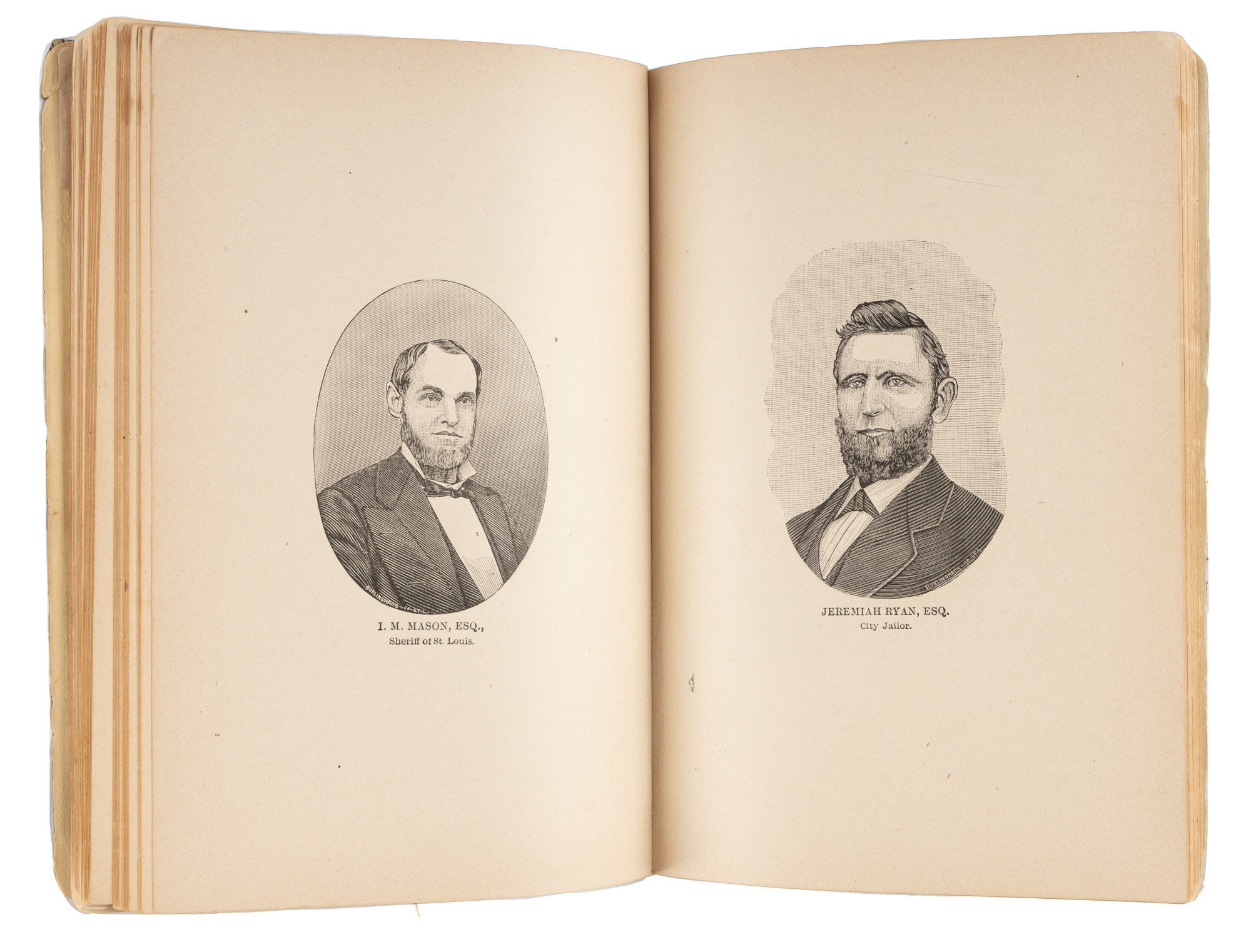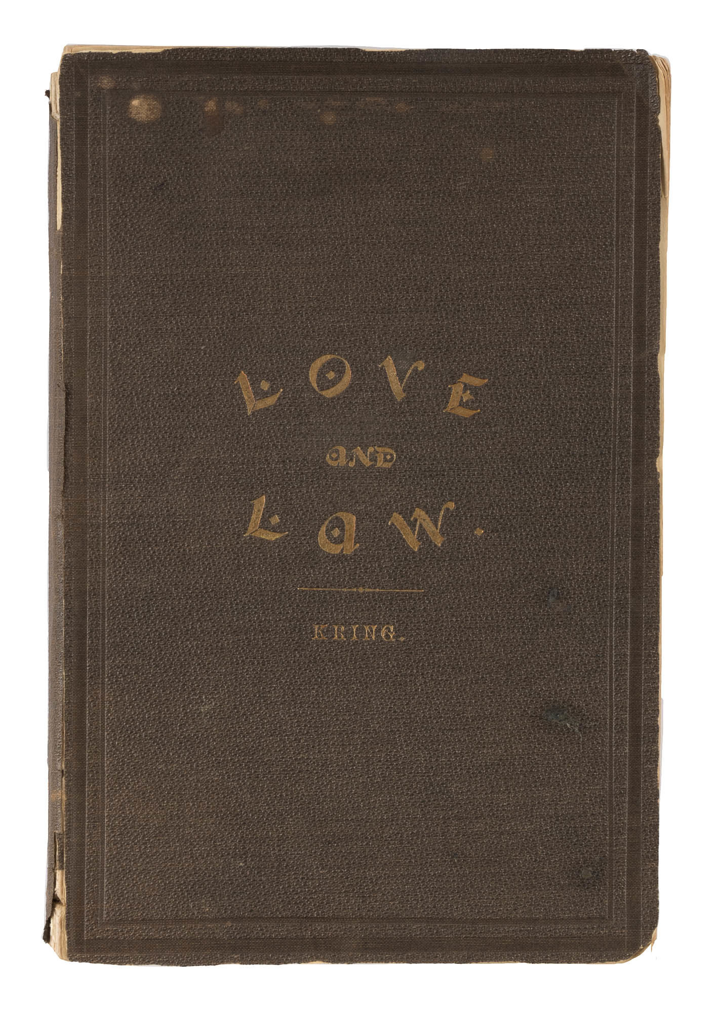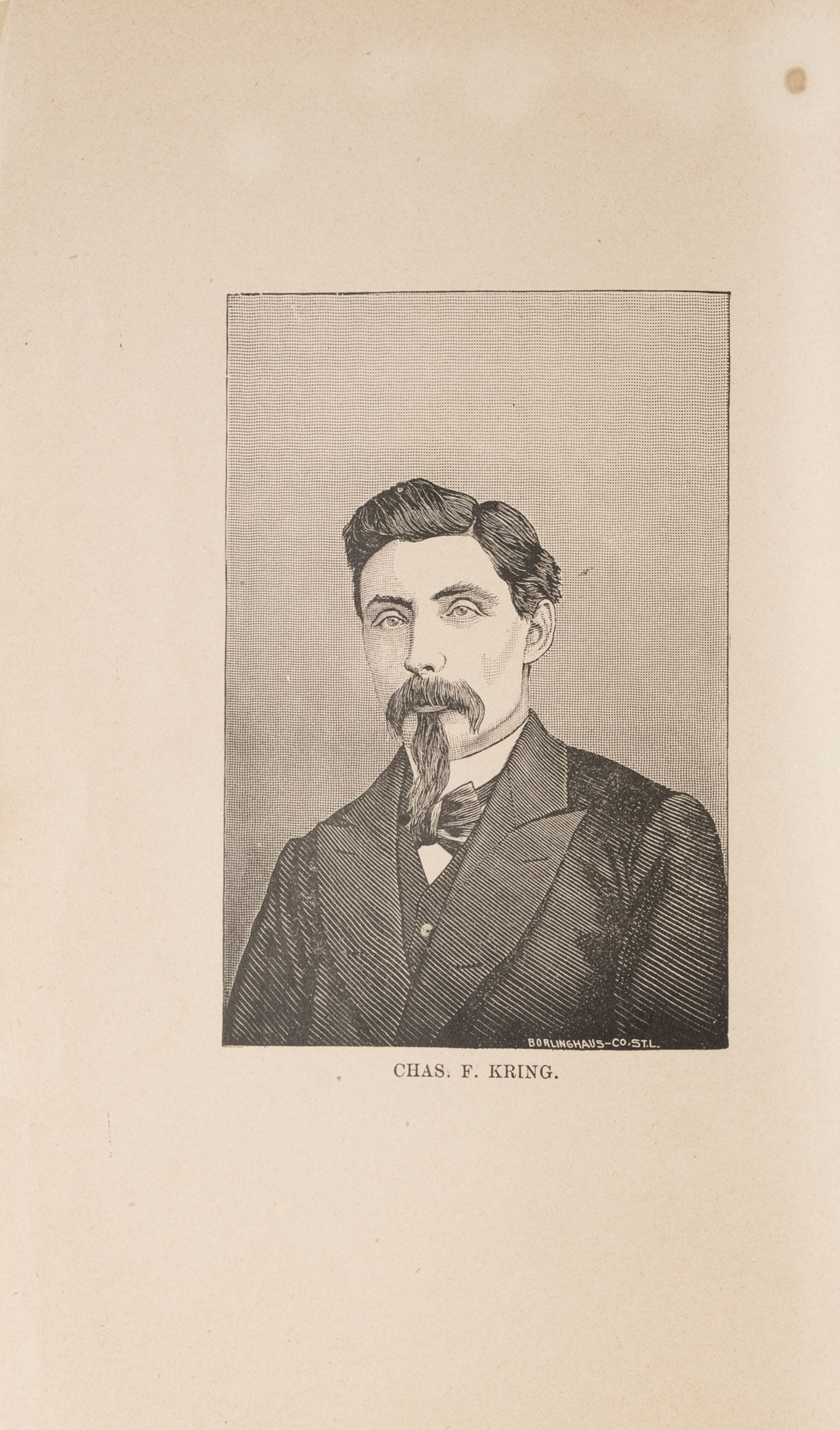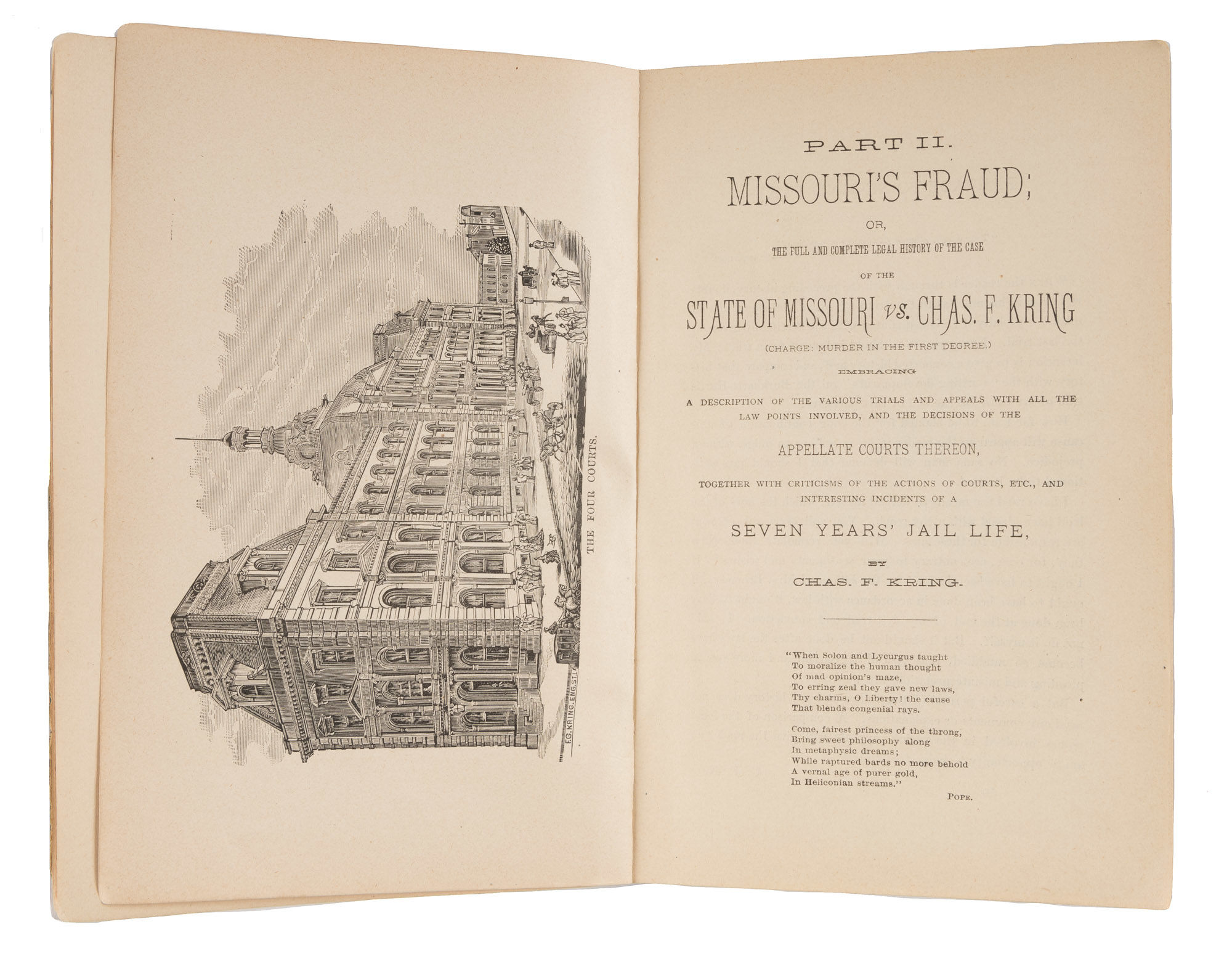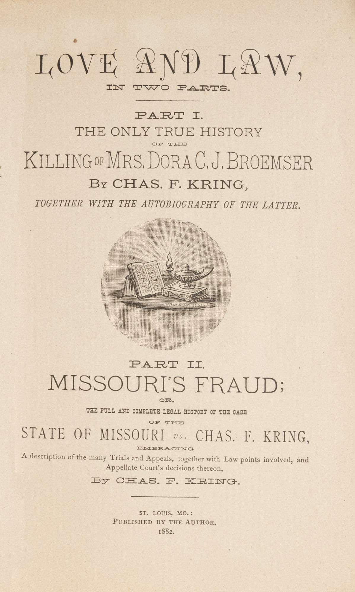 1882. St. Louis: Published by the Author, 1882.. St. Louis: Published by the Author, 1882. "One of Those Legal Marathons Peculiar to the United States": McDade 576 [Trial]. Kring, Charles F. [1845-1883], Defendant. [Kring, Eugene]. Love and Law, In Two Parts. Part I. The Only True History of the Killing of Mrs. Dora C.J. Broemser, by Chas. F. Kring: Together with the Autobiography of the Latter: Part II. Missouri's Fraud; Or, The Full and Complete Legal History of the Case of the State of Missouri vs. Chas. F. Kring: Embracing a Description of the Many Trials and Appeals, Together with Law Points Involved and Appellate Court's Decisions Thereon. St. Louis: Published by the Author, 1882. 200, [6] pp. 2 woodcut frontispieces. 14 woodcut plates. Final 5 pp. are advertisements. Octavo (9" x 6"). Publisher's flexible cloth, blind frame and gilt title to front cover, which is detached. Light rubbing and a few spots to covers, heavier rubbing to extremities with wear to spine ends, early owner bookplate of T.J. Silvius to front pastedown, his signature to front free endpaper. Moderate toning to interior, light foxing to a few leaves, fold lines and small chips to upper outside corners of preliminaries and first four leaves of main text. $450. * Only edition. "Kring's case is one of those legal marathons peculiar to the United States. Infatuated with but rejected by Mrs. Broemser, he shot her on January 4, 1875. The death sentence in trial number 1 was reversed. Trials number 2 and 3 were mistrials. At trial number 4 Kring pled guilty to second-degree murder, but, after receiving a twenty-five-year sentence, he got that reversed. At trial number 5 he received his second death sentence, which the United States Supreme Court reversed in October, 1882, by a five-to-four vote" (McDade). This copy probably belonged to the T.J. Silvius who was a printer and publisher in Sunbury, Pennsylvania, Thomas J. Silvius [1854-1937]. OCLC locates 3 copies in law libraries (Columbia, Harvard, St. John's University). Bell, History of Northumberland County, Pennsylvania 845-46. McDade, The Annals of Murder 576.