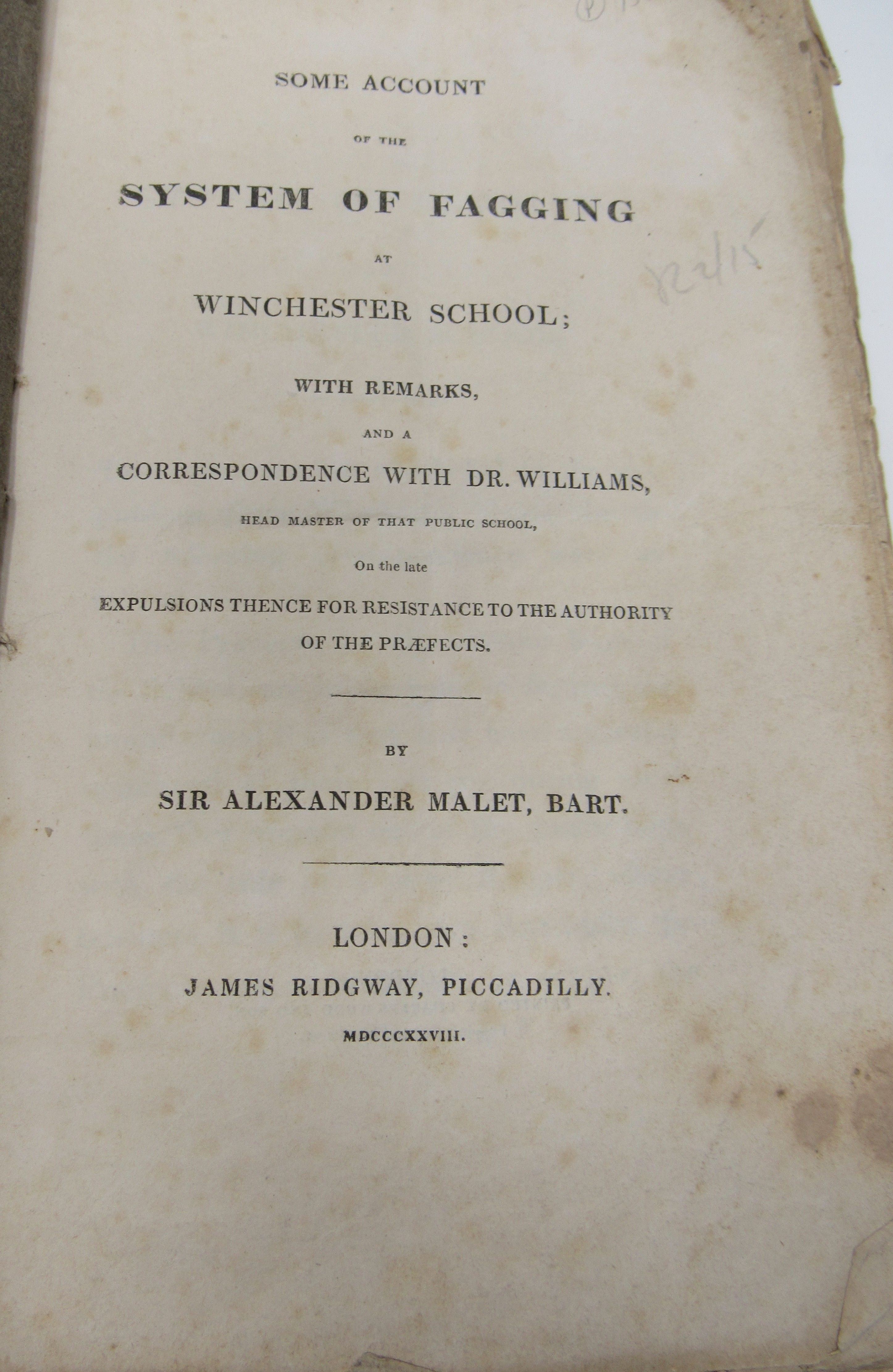 Some account of the system of fagging at Winchester school; With remarks, and a correspondence with Dr. Williams, head master of that school, on the ... resistance to the authority of the præfects.