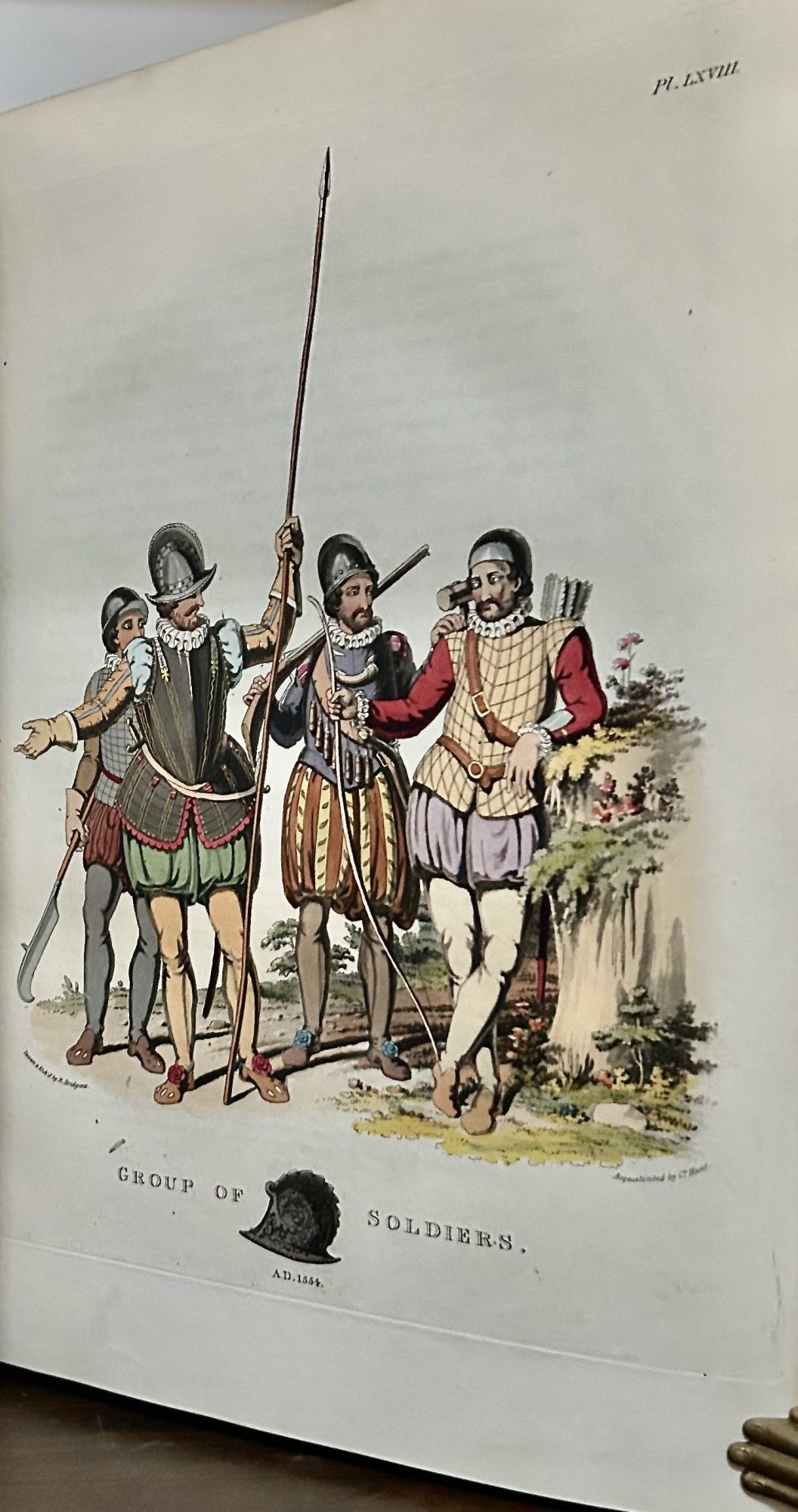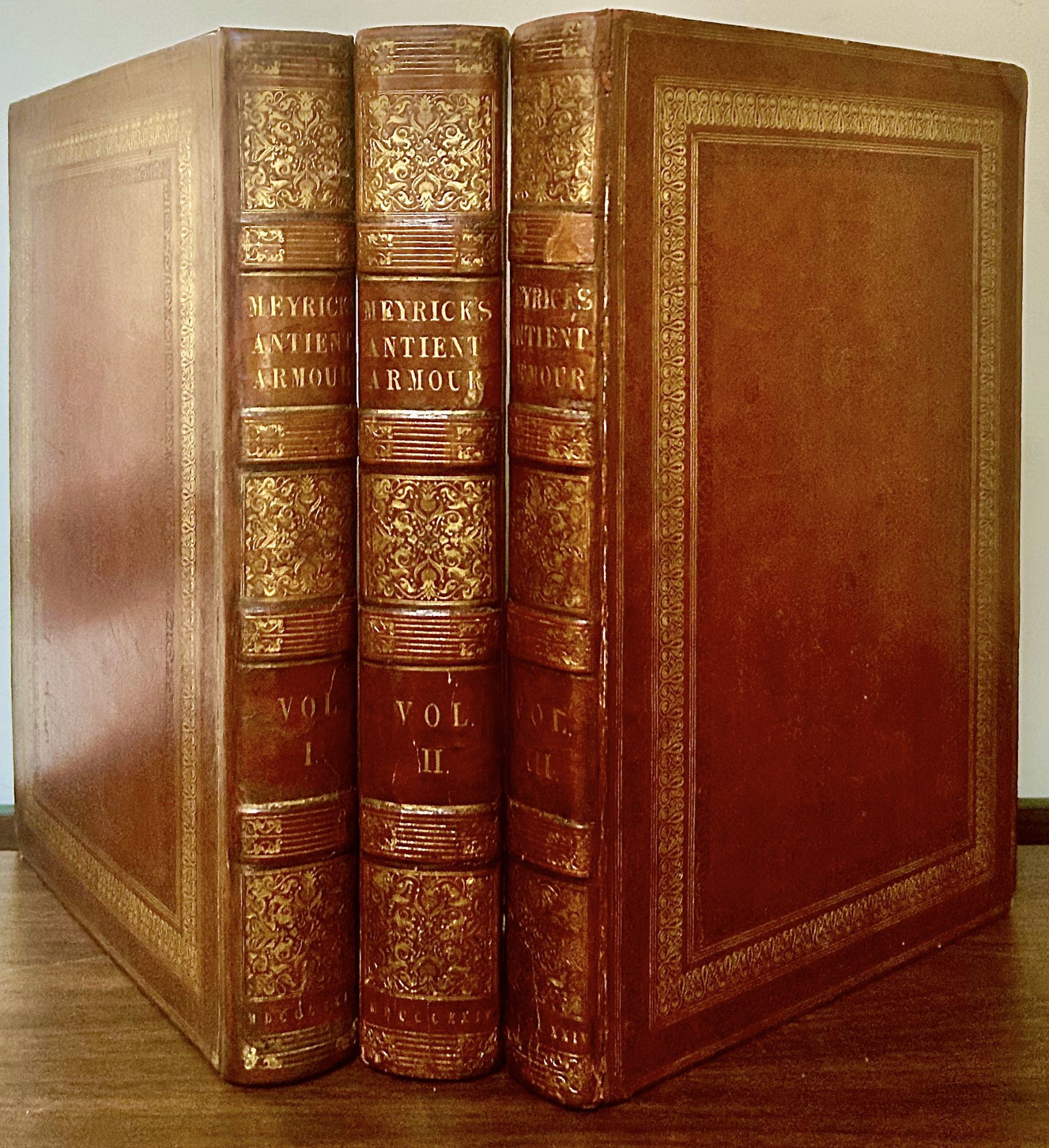 London: Robert Jennings, 1824. First edition. leather_bound. Full diced brown morocco. Aeg. Near fine. 3 Vols.. [2], 20, [2], lxxviii, [2], 206.; vi, 297, vi, 147, [1], [134] pages. 39 x 27.5 cm. 80 engraved plates, 70 are hand-colored embellished with gold or silver. and with historiated hand-colored initials heightened with gold for each chapter throughout. Extra engraved title pages. The book was illustrated in colour with Meyrick's own paintings, beautifully gilded, and solidified his reputation as an authority in the study of arms and armour. Meyrick practiced as an advocate in ecclesiastical and admiralty courts. A contemporary review of his book in the Edinburgh Review described the illustrations as "Plates as fine as the monuments of Westminster Abbey. Really and truly the work is admirably executed, and deserves every eulogy". Some have called this work, the greatest color plate book ever produced on the subject. Raised bands, spines elaborately decorated in gilt with cover arabesque panels in gilt and blind. Yellow endpapers. Vol. III spine at head with small loss. Plate offsetting to blank adjacent pages. All plates and text clean and crisp.
