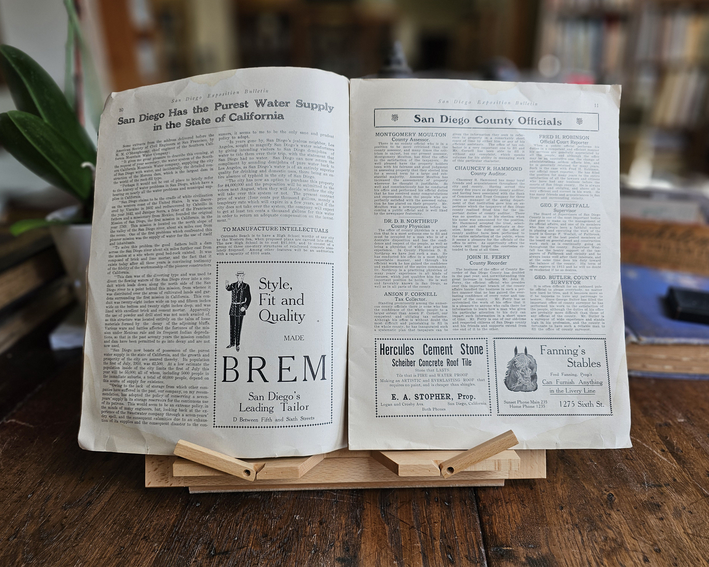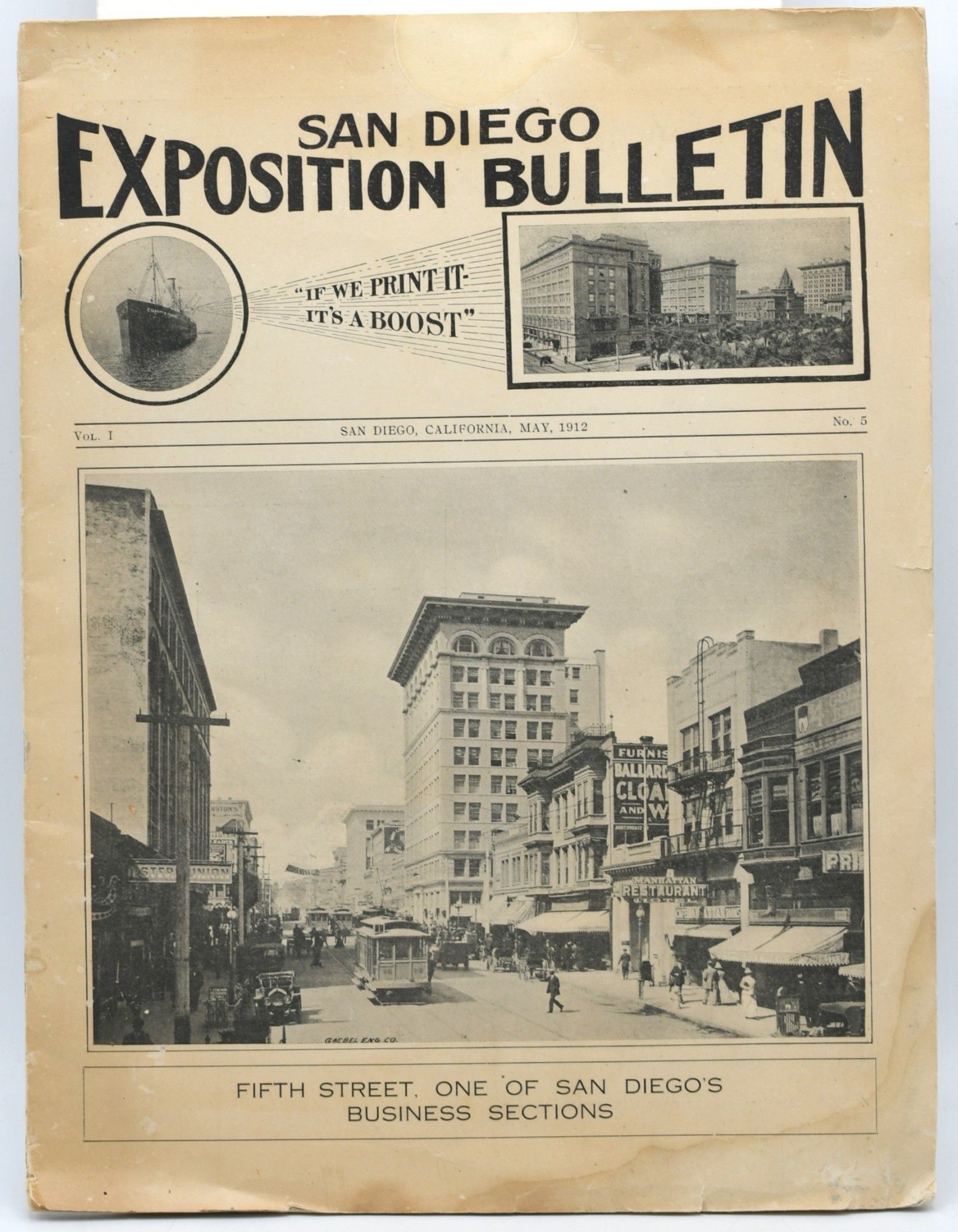 [San Diego Exposition News Pub. Co.], 1915. Soft Cover. near Very Good binding. Stapled magazine; in printed wrappers; [1], 26 pages; “An Independent Journal Containing Reliable Information About the Panama-California Exposition and Devoted to the Interests of the Stockholder, Homeseeker and Tourist”.~~With advertisements, and a photographic illustration on the cover: “Fifth Street, One of San Diego’s Business Sections”.~~With a rather “Babbitt-like” slogan: “If we print it it’s a boost”.~~This periodical “boosting” the Exposition is most uncommon; at this time we are able to locate but two institutional holdings, both in California. near Very Good binding.