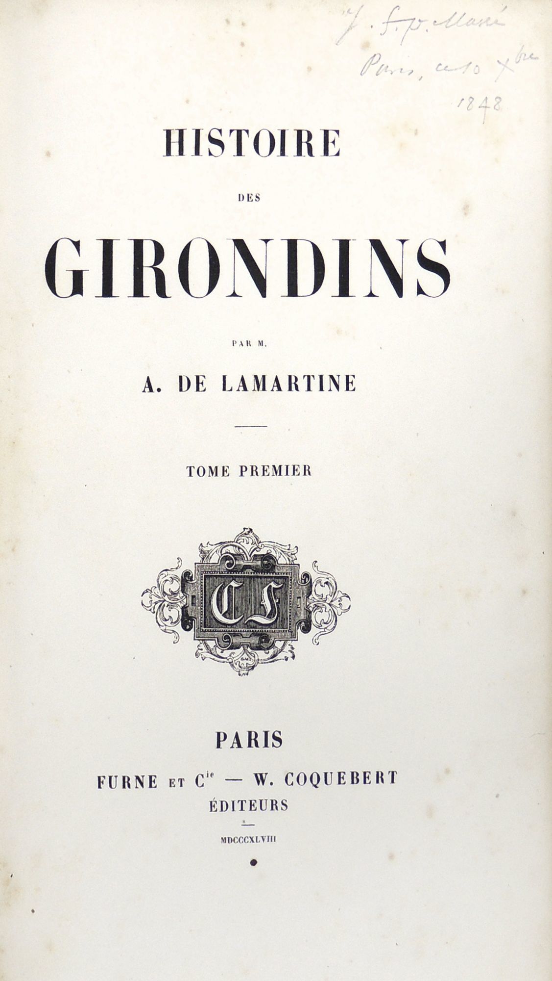 Paris: Furne et Cie, 1848. Hardcover. Very Good. Hardcover. French author, poet, and statesmen, Lamartine (1790 - 1869) was instrumental in founding the Second Republic of France in which he worked to abolish slavery and the death penalty. This set offers a history of the Girondins, members of a political faction during the French Revolution. It includes many full page portraits of important French figures such as Louis XVI, Lafayette, Mirabeau, Robespierre, Orleans, etc. This attractive set is bound in three-quarter dark brown leather over dark brown pebbled cloth covered boards with gilt title, author, and volume to spines. Wear and rubbing to hinges, corners, spines, and edges of all volumes. Occasional spots of foxing to interiors, but clean overall. Handwritten table of portraits to rear of each volume with a comprehensive table at the end of the first volume. Antiquated ownership penned markings to title page and half title page of first volume dated 1848. Evidence of sticker removed from foot of spines; however, no library stamps to interiors. Full marbled edges and marbled endpapers. An attractive set despite noted wear. Text in French. Volume I: 463 pages; Volume II: 421 pages; Volume III: 404 pages; Volume IV: 395 pages; Volume V: 416 pages; Volume VI: 416 pages; Volume VII: 409 pages; VIII: 384 pages. FRE/112223.