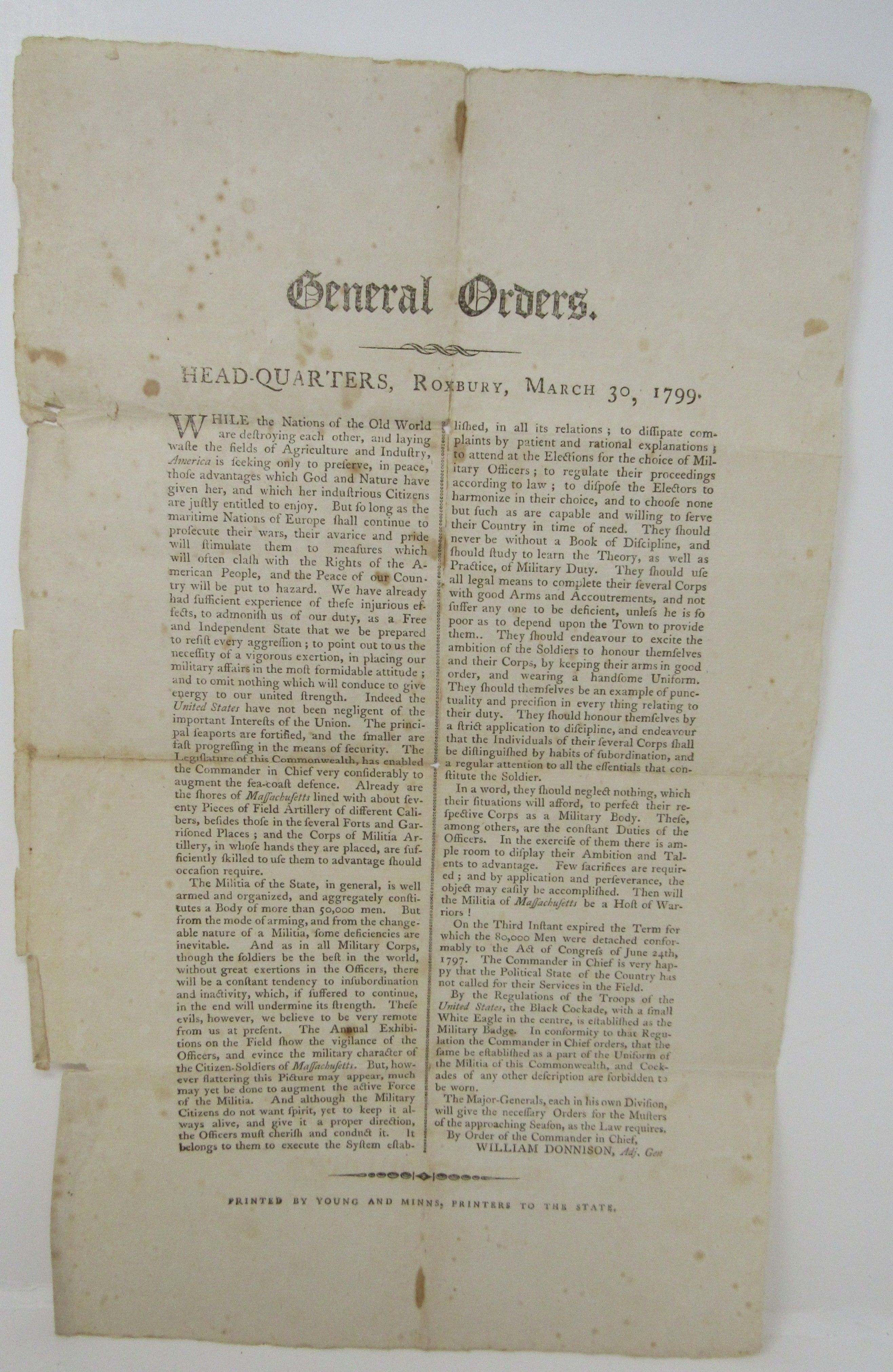 Broadside. 8" x 13 1/4." Edges worn and the piece has folds with minor tears and foxing. A general state on the preparedness of the Massachusetts militia to protect the interests of the state and nation.