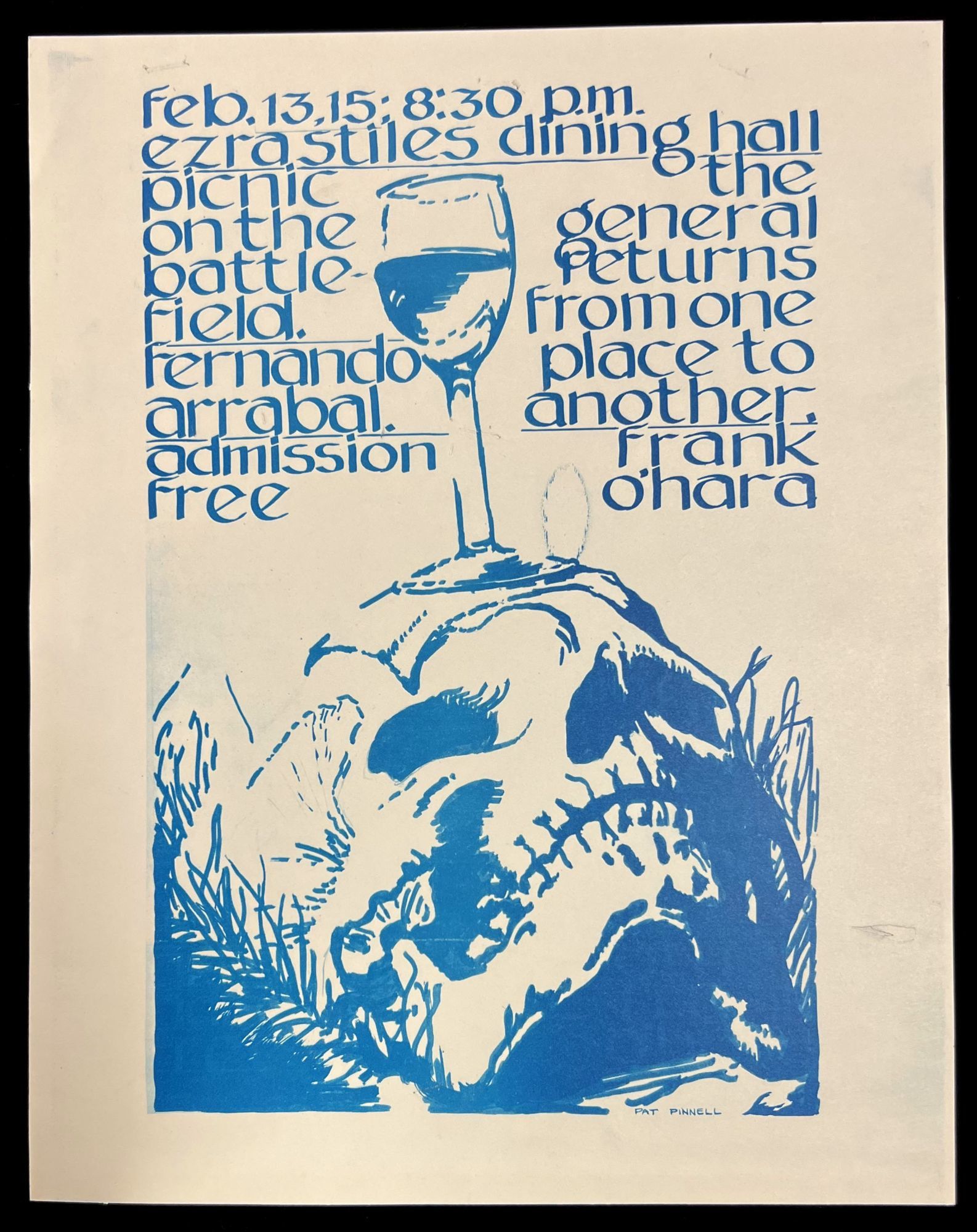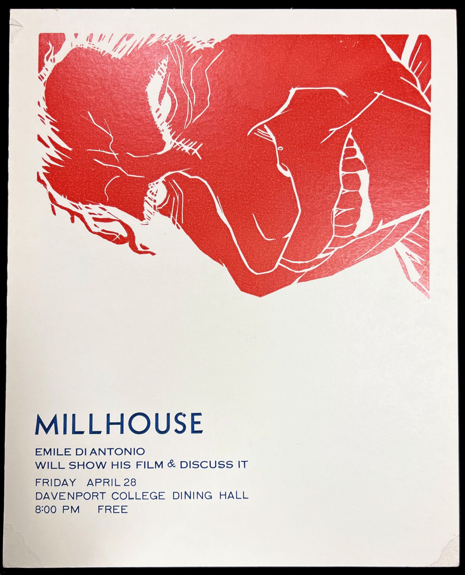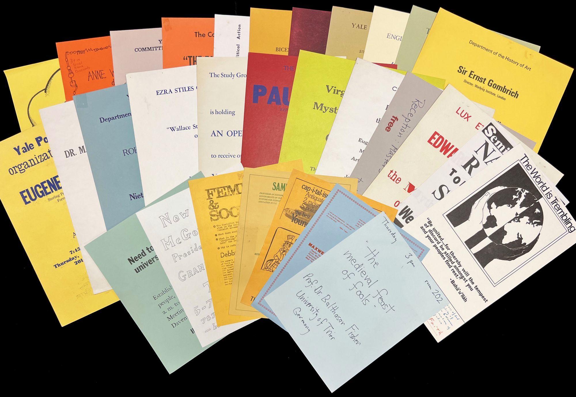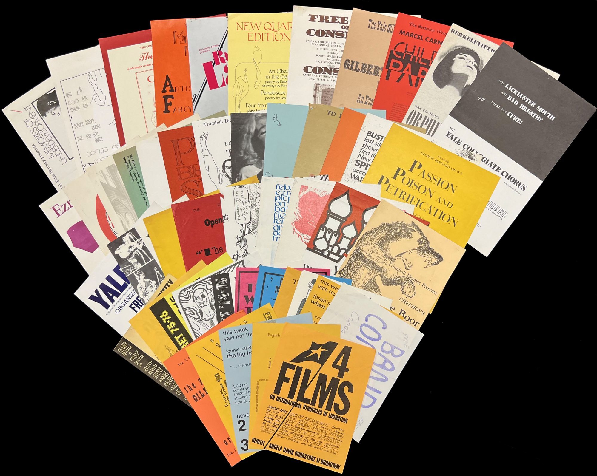 Two of the posters ("The Lustre of Apelles" and "Viva La Muerte") have red crayon or colored pencil corrections, leading us to believe that at least some of the posters originated from a local New Haven printer and are printer's proofs. Many have evidence of adhesive, staples, or tape, however, which would indicate that some were used on campus. At least two of the posters have comments written in pen such as "Good" or "Excellent"; one poster promoting a feminist lecture sports a snarky annotation that reads, "B+ in Social Science Buzzwords". Many have dates in pencil or pen to the versos. All are in very good, near-fine, or fine condition.
