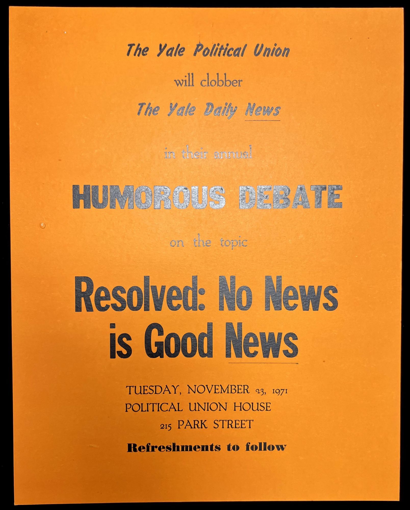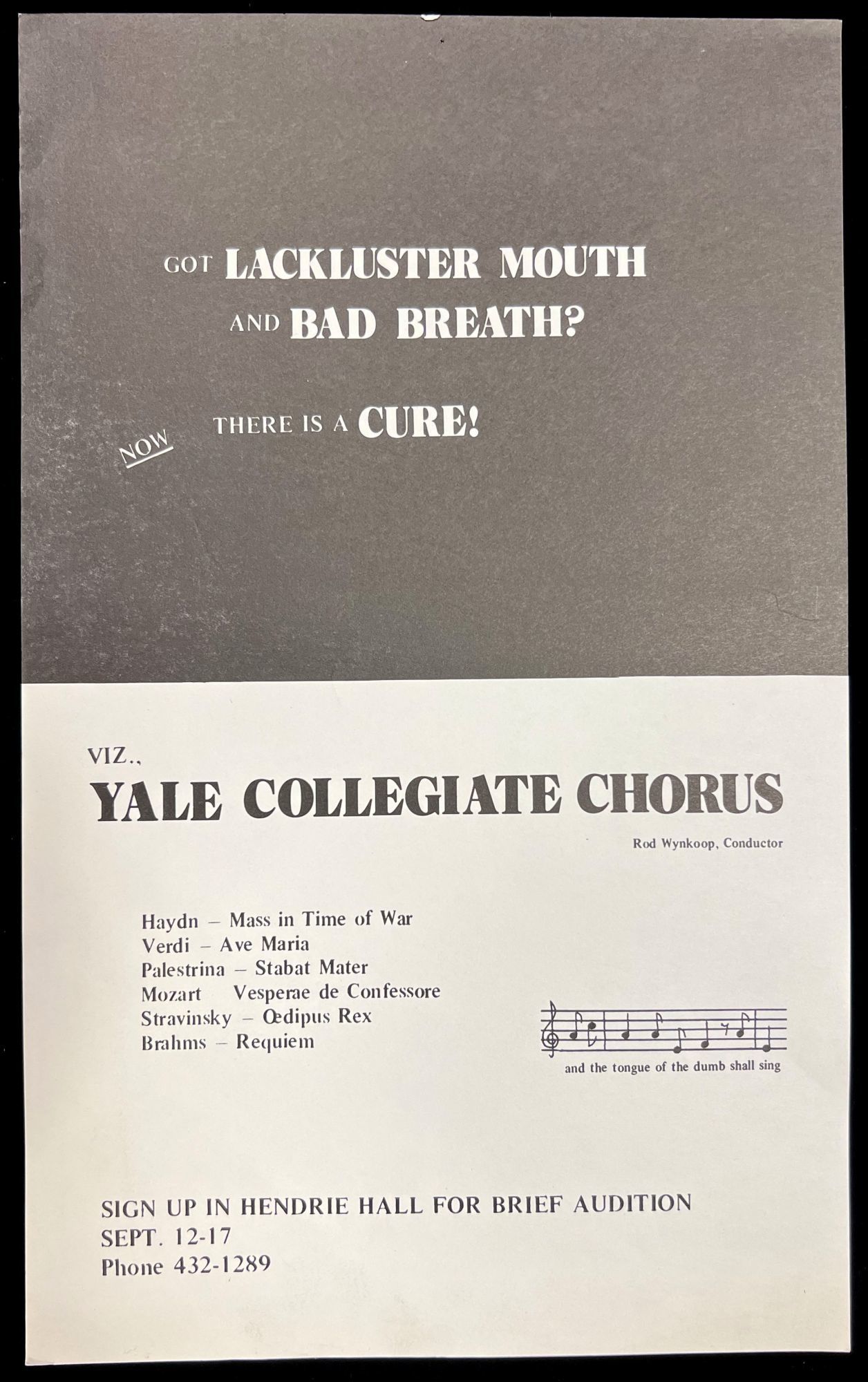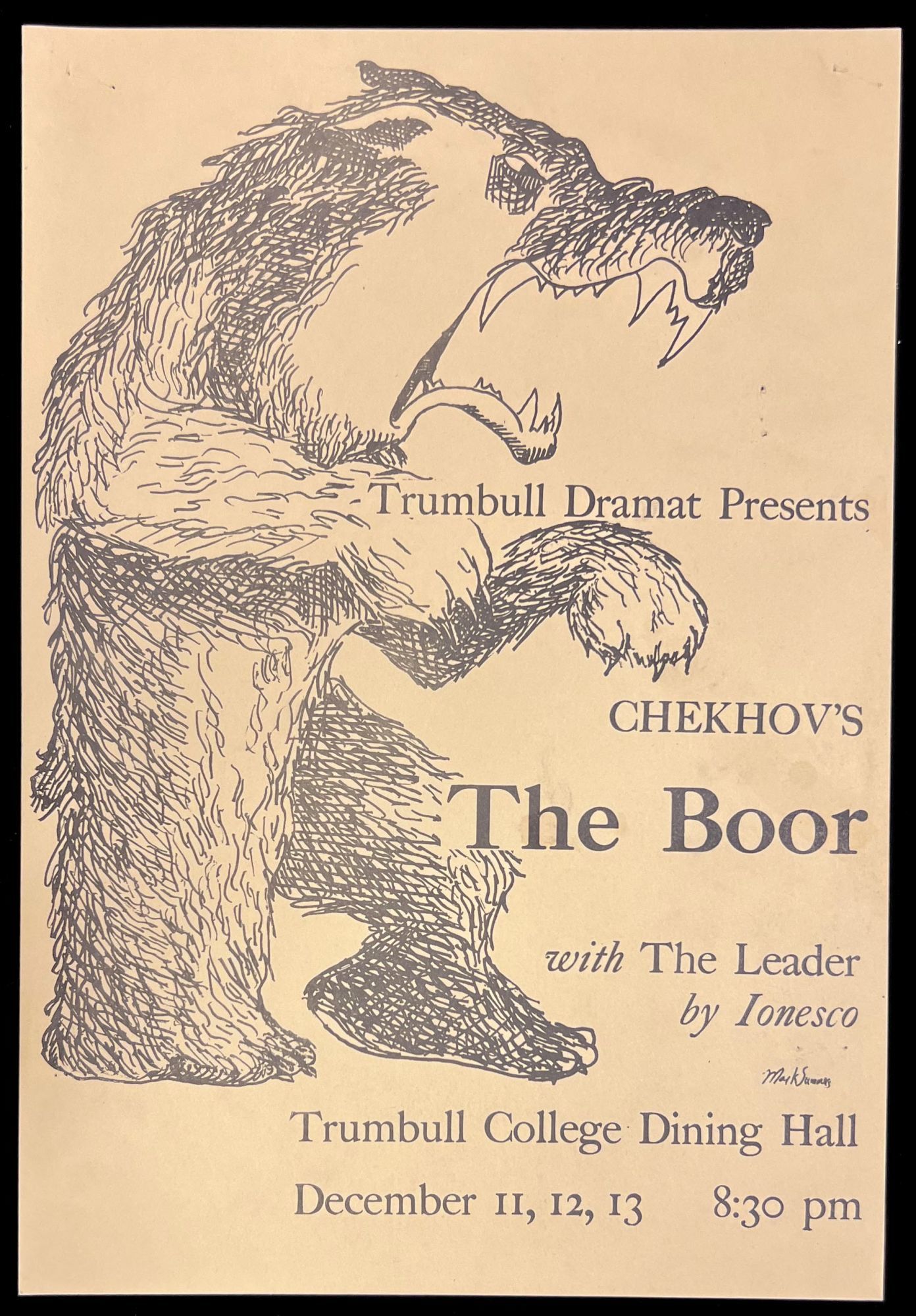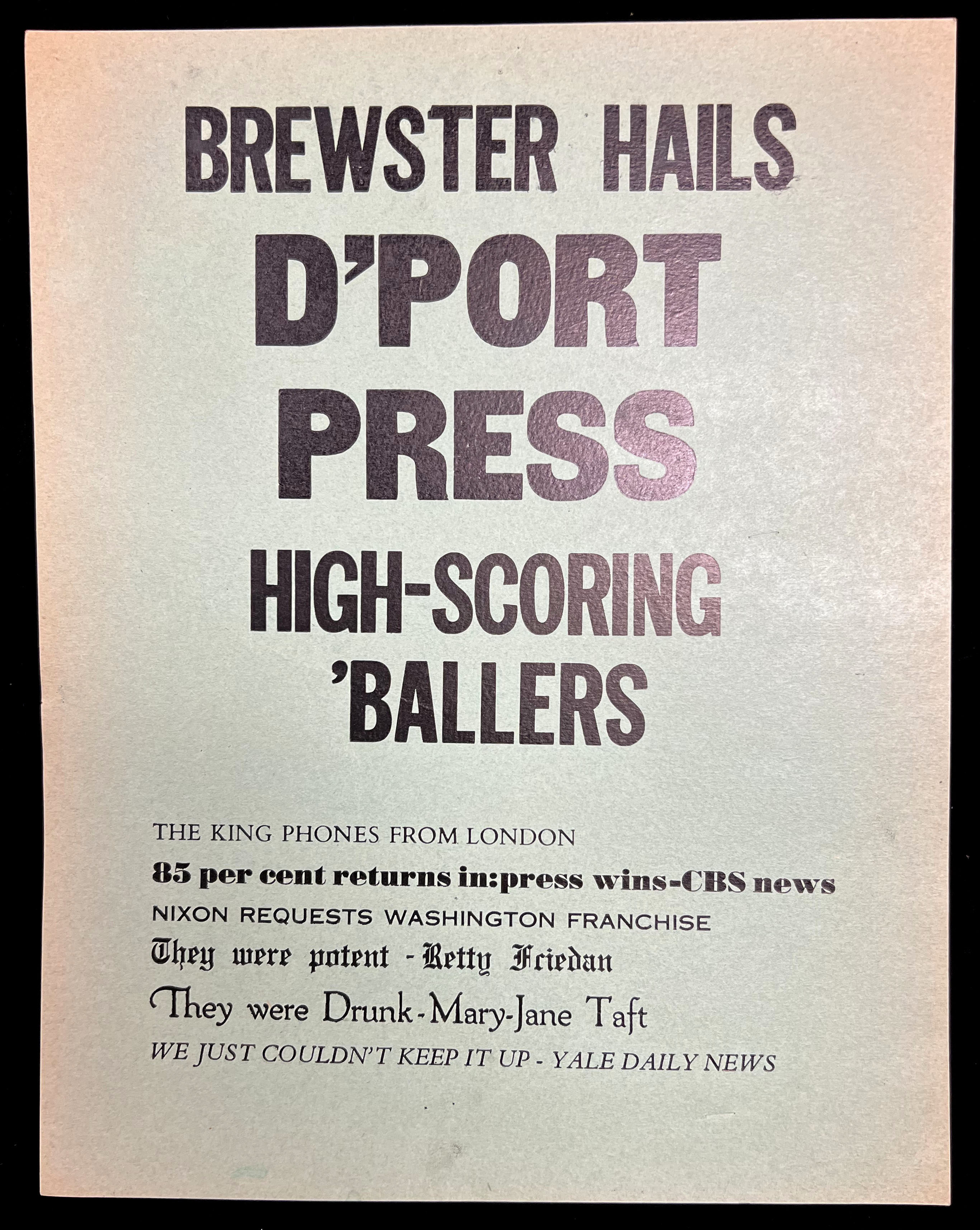 Two of the posters ("The Lustre of Apelles" and "Viva La Muerte") have red crayon or colored pencil corrections, leading us to believe that at least some of the posters originated from a local New Haven printer and are printer's proofs. Many have evidence of adhesive, staples, or tape, however, which would indicate that some were used on campus. At least two of the posters have comments written in pen such as "Good" or "Excellent"; one poster promoting a feminist lecture sports a snarky annotation that reads, "B+ in Social Science Buzzwords". Many have dates in pencil or pen to the versos. All are in very good, near-fine, or fine condition.