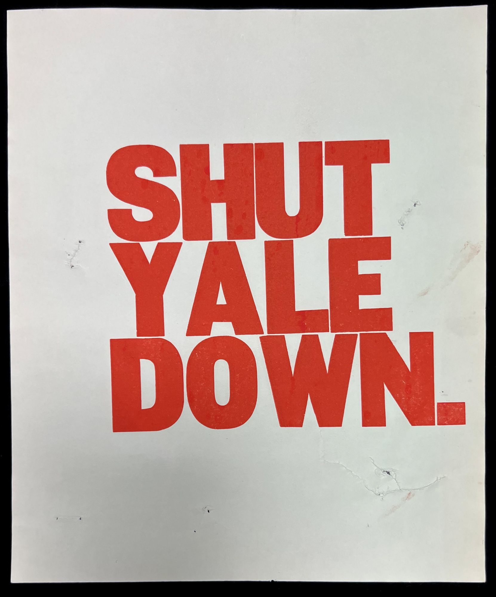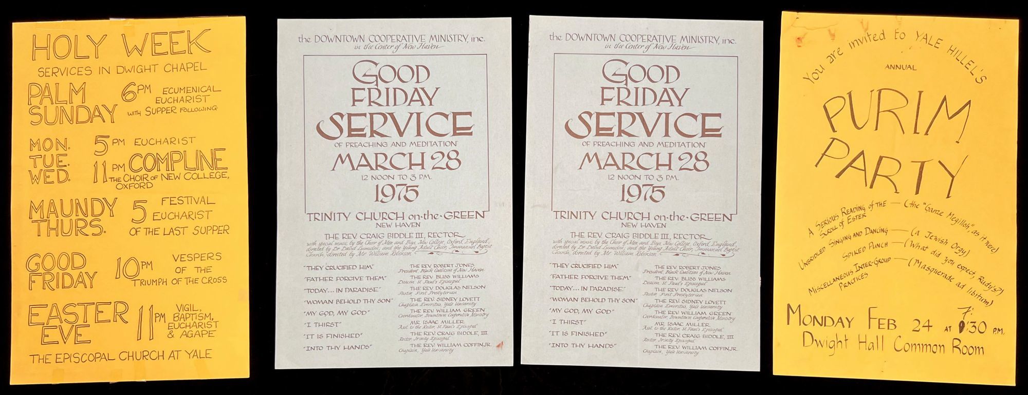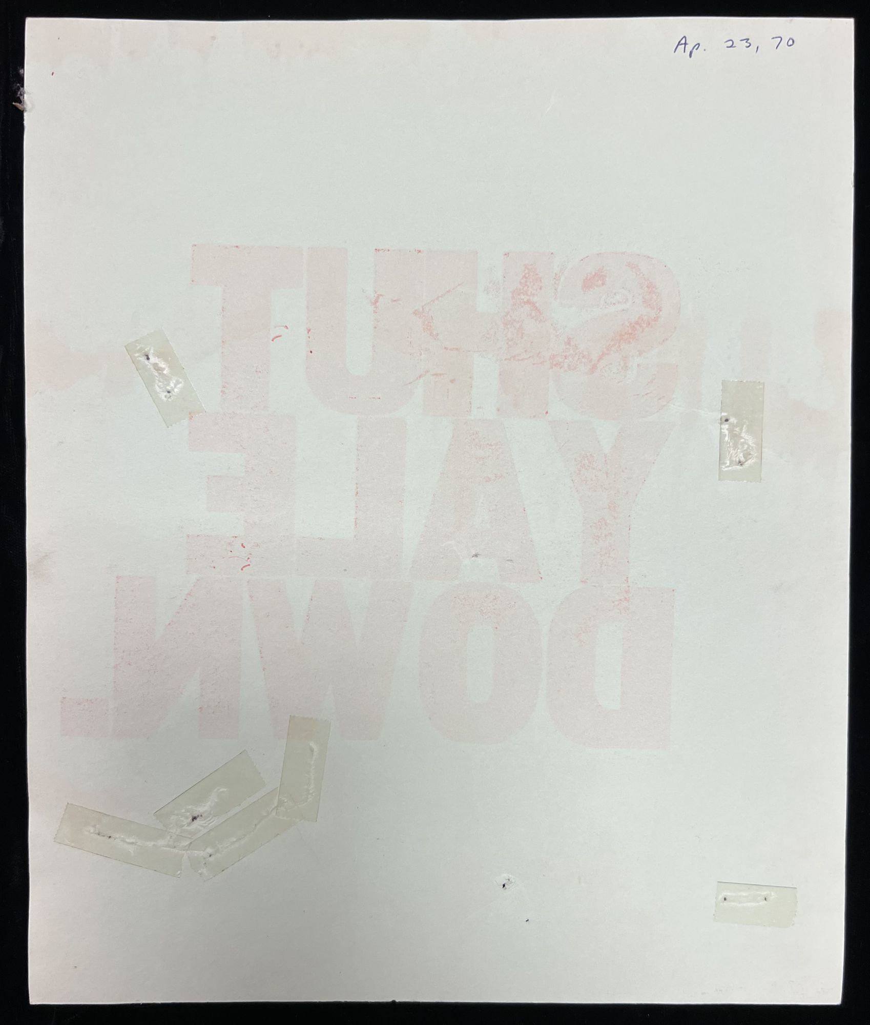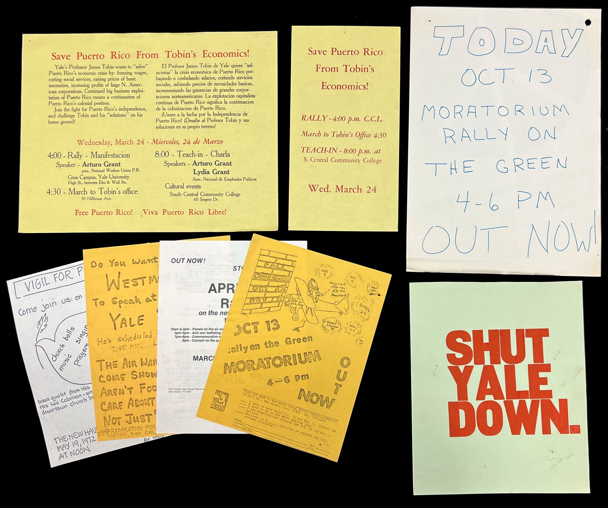 New Haven, Connecticut, 1975. Very good to fine condition. Minor flaws include toning, residue or damage from adhesive or staples, and offsetting.. A fine collection of ninety-three (93) posters, many related to social justice initiatives spearheaded by students at Yale, spanning the years 1971 and 1975. There are seven (7) categories of posters in this collection including: concerts; film screenings; lectures; meetings; plays and performances; protests; and religious services. There is also one debate represented, and a couple of miscellaneous events, such as an audition announcement and an advertising poster for a publisher. Together, the posters paint a picture of a bright young community deeply interested in social justice, feminism, arts and culture. Highlights include lectures by some of the most prominent academics of the day, several antiwar rallies, and plays put on by Yale students featuring the works of Ibsen, Chekhov, Shaw, and Sartre. Finally, there is a sign that bears a defiant anti-establishment slogan ("SHUT YALE DOWN") which we posit was one of the signs used in protest during the 1970 May Day on the New Haven Green. The event is sometimes referred to as the "New Haven Green Disorders", a day on civil unrest in which thousands of Black Panthers supporters rallied together on the New Haven Green and in the Yale colleges for teach-ins, concerts, and protest. "Shut Yale Down" is a slogan that appears frequently in oral and written accounts of that day.