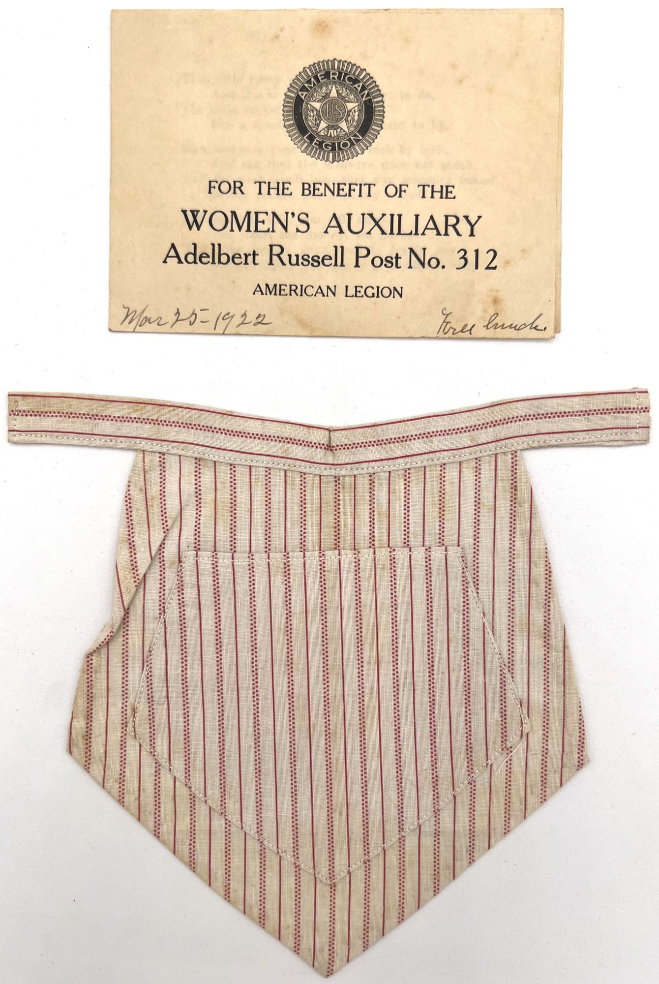 Apron measures approx. 5.25" by 6". Printed bifolium measures 3" by 4.25", printed on rectos only, with contemporary ink annotations to first leaf recto: "Mar 25 1922 Free lunch" Penny wars are a way of raising funds through nominal donations that can be afforded by most.