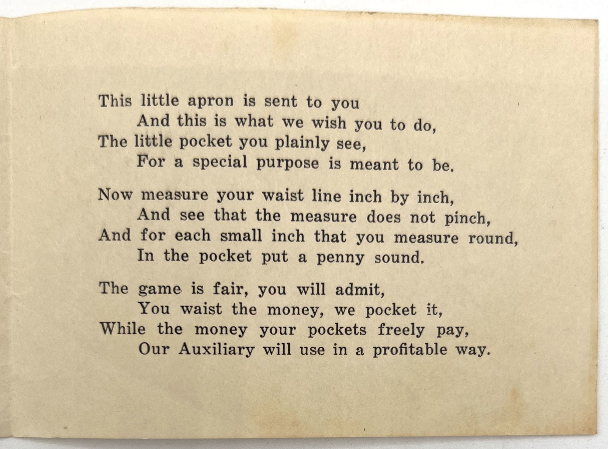 United States: American Legion, 1922. Very good to near-fine. Minor toning to paper, dust soiling to apron.. A charming, albeit unabashedly fat-phobic, bit of American Legion history, raising money for the Women's Auxiliary Adelbert Russell Post No. 312. A miniature calico apron is accompanied by a slip of paper, which asks for donations based on one's waist size: "This little apron is sent to you / And this is what we wish you to do, / The little pocket you plainly see, / For a special purpose is meant to be, / Now measure your waist line inch by inch, / And see that the measure does not pinch, / And for each small inch that you measure round, / In the pocket you put a penny sound. / The game is fair, you will admit, / You waist the money, we pocket it, / While the money your pockets freely pay, / Our Auxiliary will use in a profitable way."