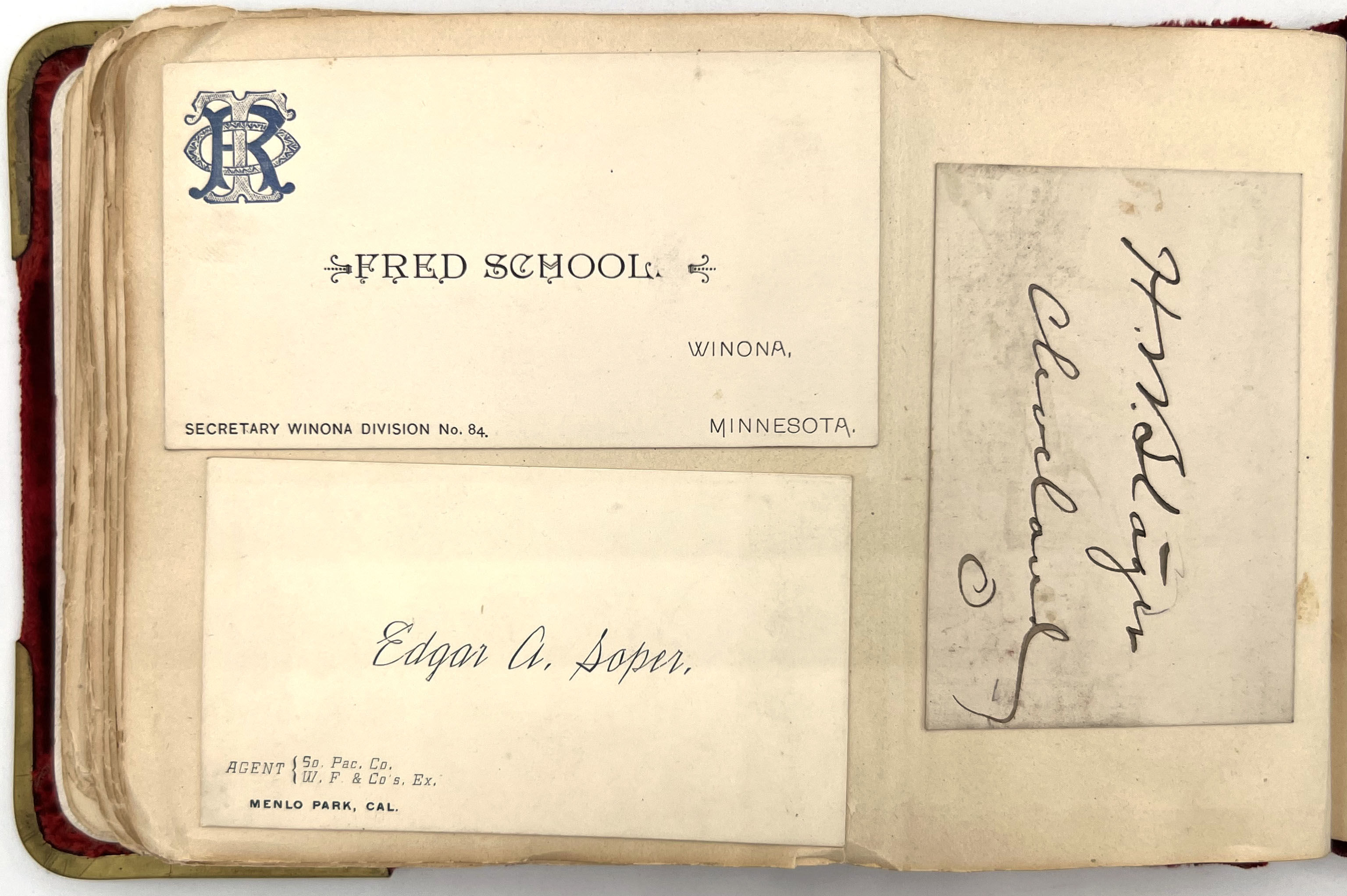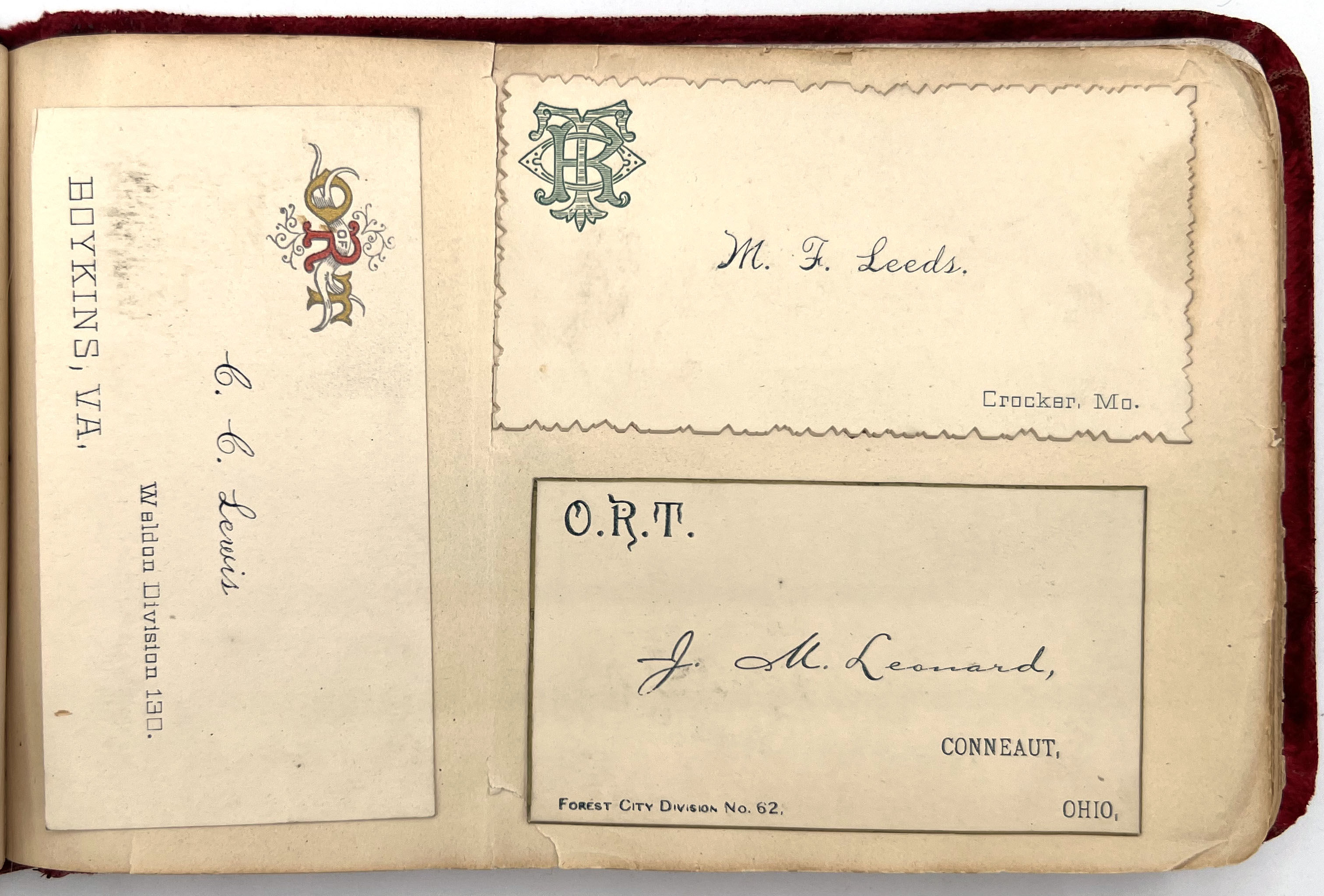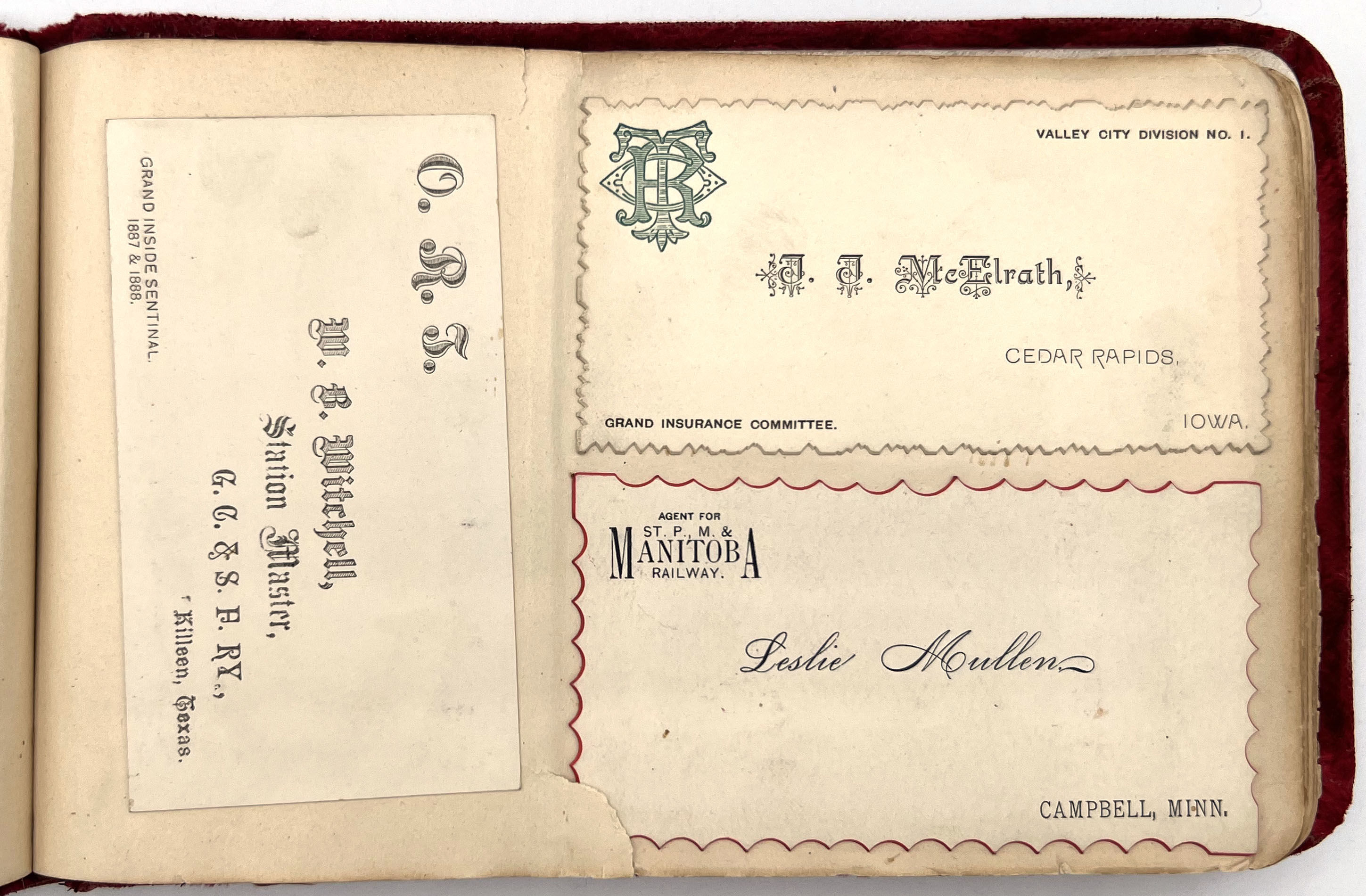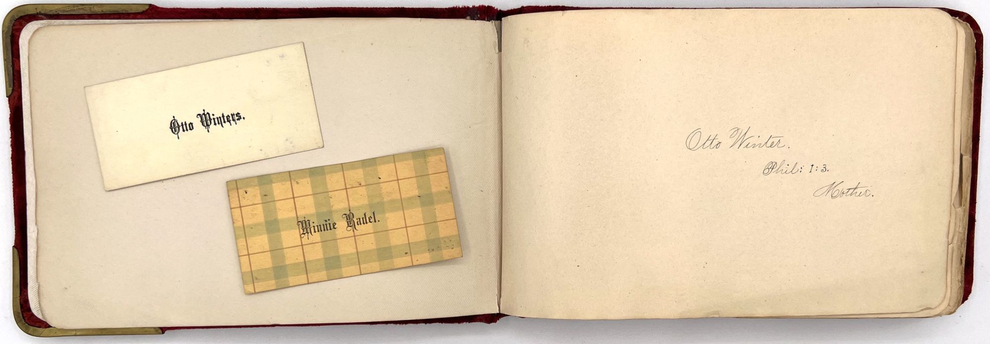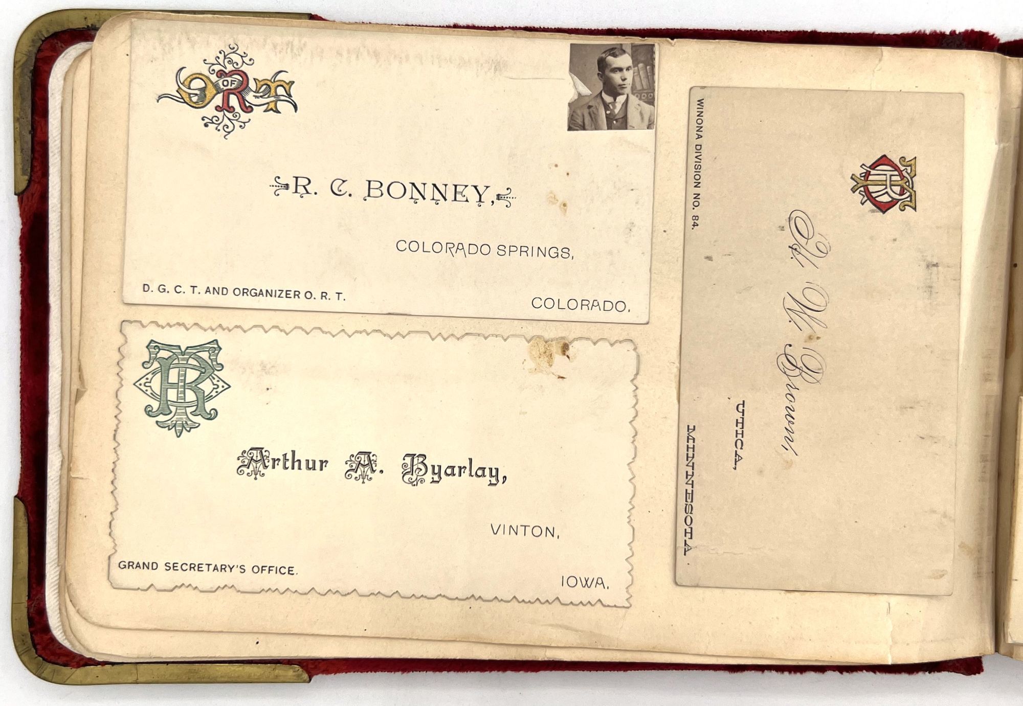 Oblong 8vo (5.25" by 7.75"), approx. 20 blank leaves, 89 business cards pasted-in. Inscribed on first leaf recto, "Otto Winters. Phil: 1: 3. Mother." Loosely inserted in the front are the two calling cards (approx. 1.75" by 3.5" each) of Otto Winters and Minnie Radel. Bound in original red velvet with rounded corners, decorative brass hardware on right-hand corners of upper board. The Collector - Otto Winters The cards appear to have been collected when Winters was a child in the late 1880s. Sadly, he died in a tragic railroad accident towards the end of his career in 1940, when he was acting as head brakeman on the Wisconsin Valley Line of the Milwaukee Railroad; the engine exploded, resulting in the deaths of him and his coworkers, engineer Richard Grorich and fireman Alvin Jantz.