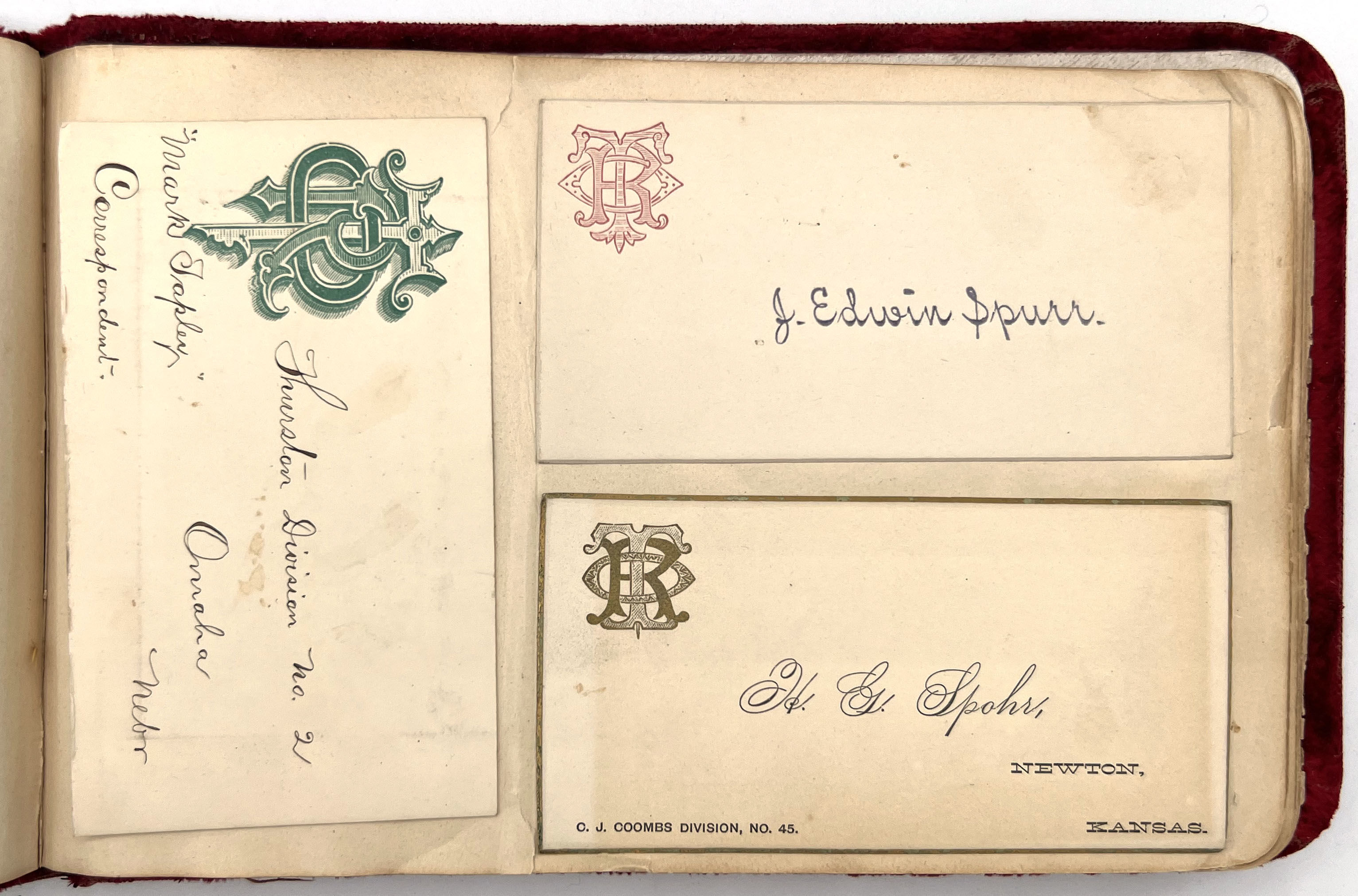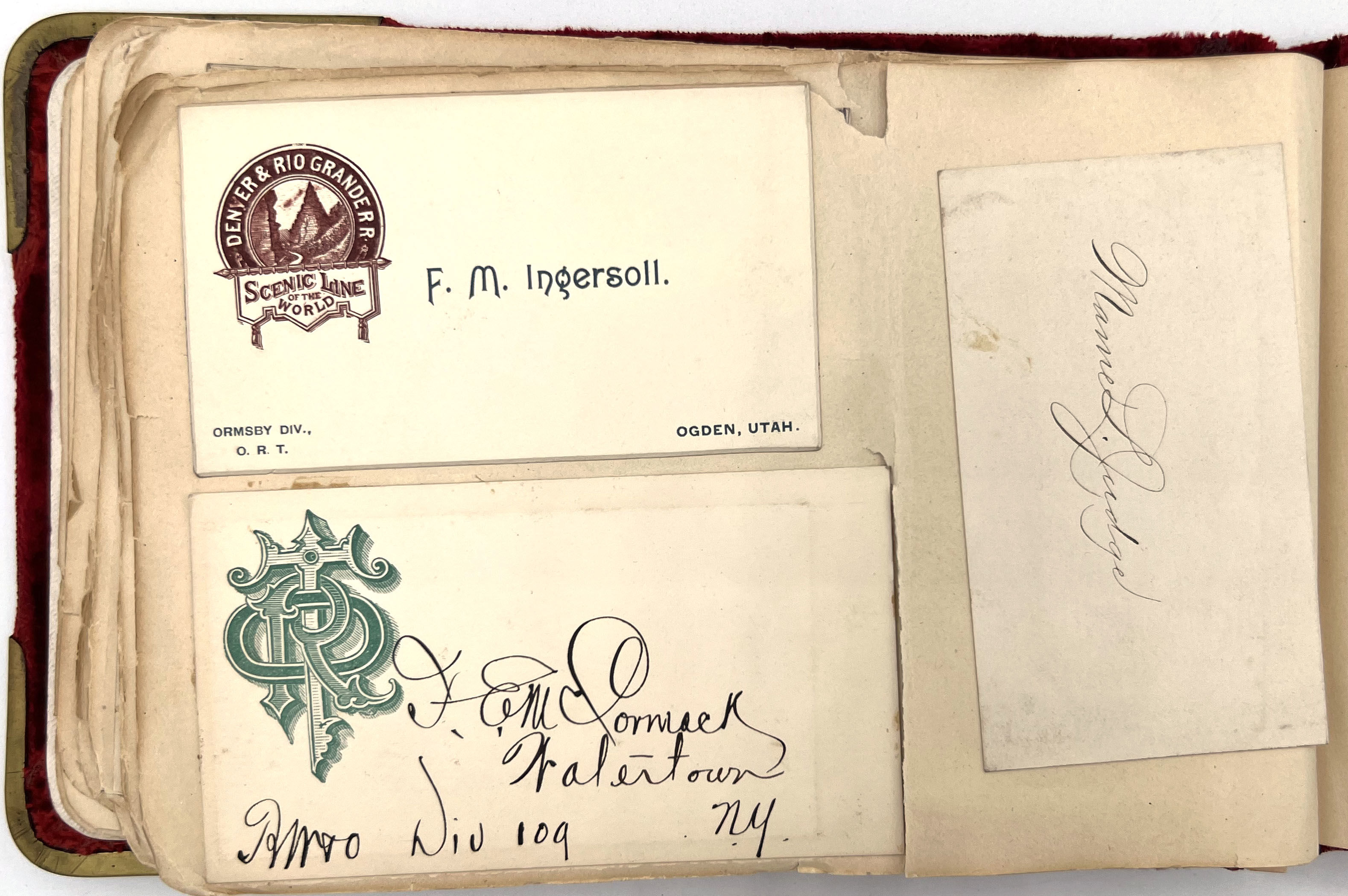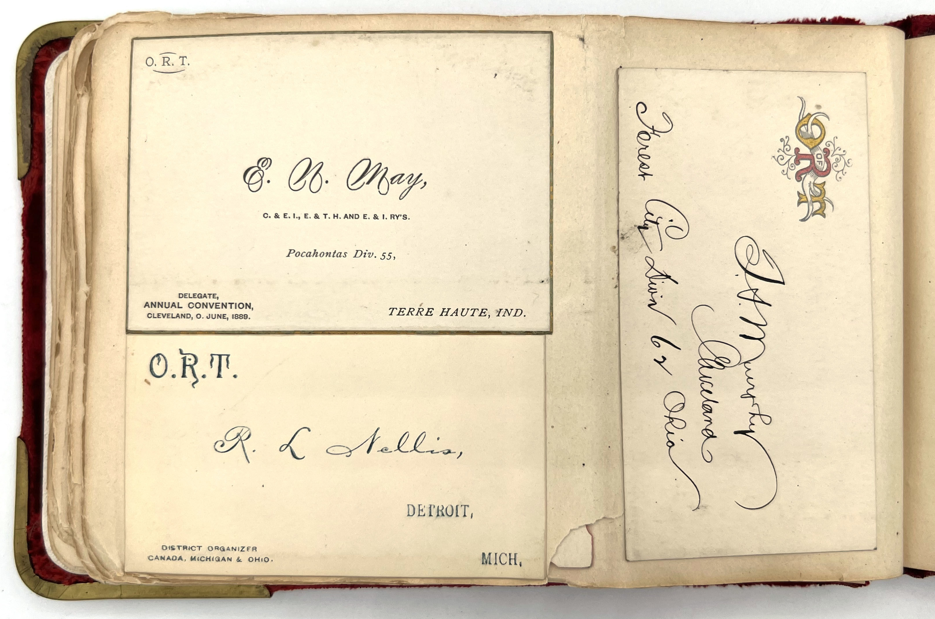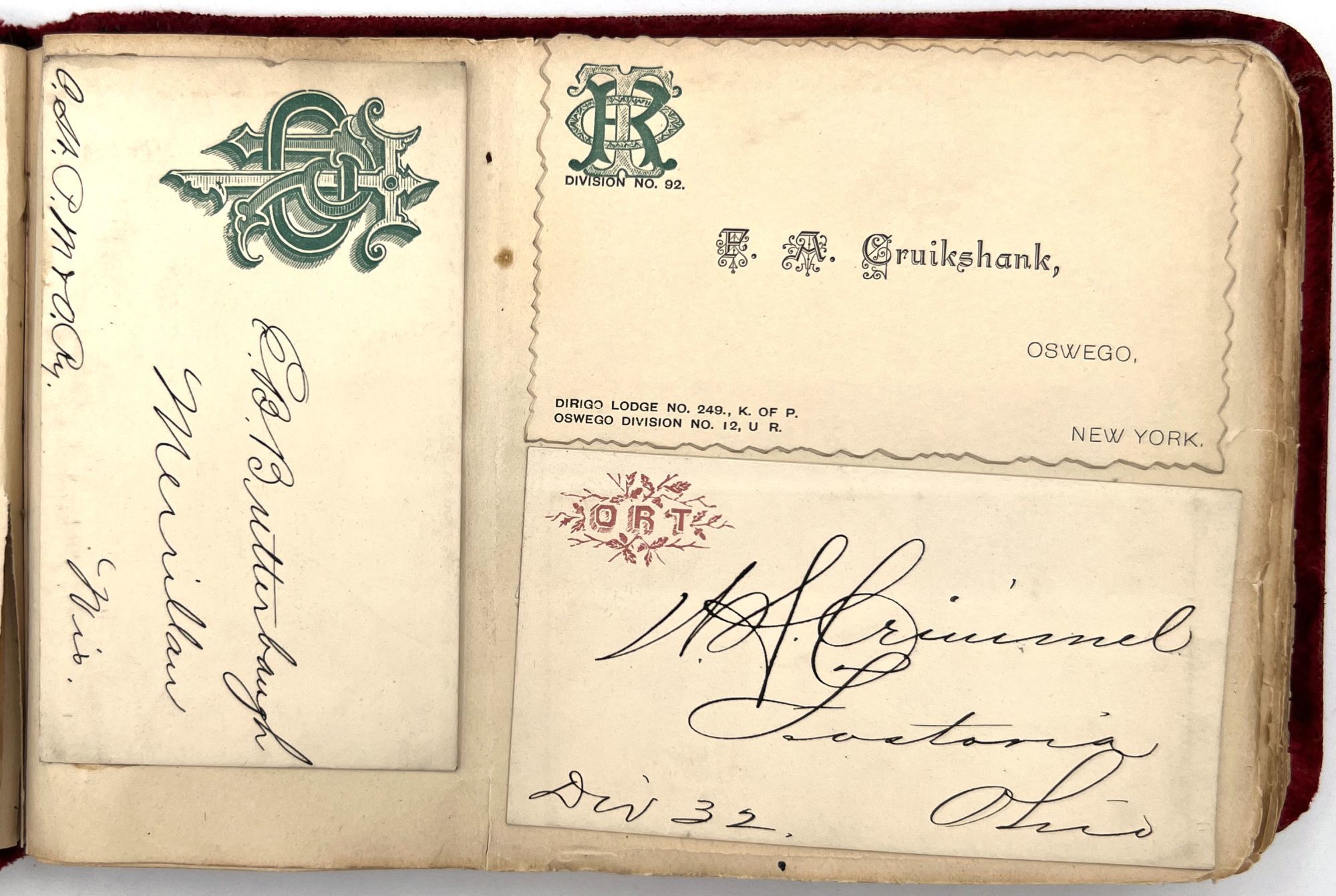 Oblong 8vo (5.25" by 7.75"), approx. 20 blank leaves, 89 business cards pasted-in. Inscribed on first leaf recto, "Otto Winters. Phil: 1: 3. Mother." Loosely inserted in the front are the two calling cards (approx. 1.75" by 3.5" each) of Otto Winters and Minnie Radel. Bound in original red velvet with rounded corners, decorative brass hardware on right-hand corners of upper board. The Collector - Otto Winters The cards appear to have been collected when Winters was a child in the late 1880s. Sadly, he died in a tragic railroad accident towards the end of his career in 1940, when he was acting as head brakeman on the Wisconsin Valley Line of the Milwaukee Railroad; the engine exploded, resulting in the deaths of him and his coworkers, engineer Richard Grorich and fireman Alvin Jantz.