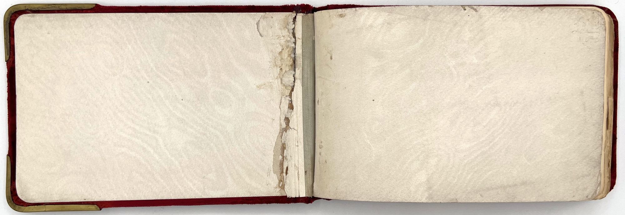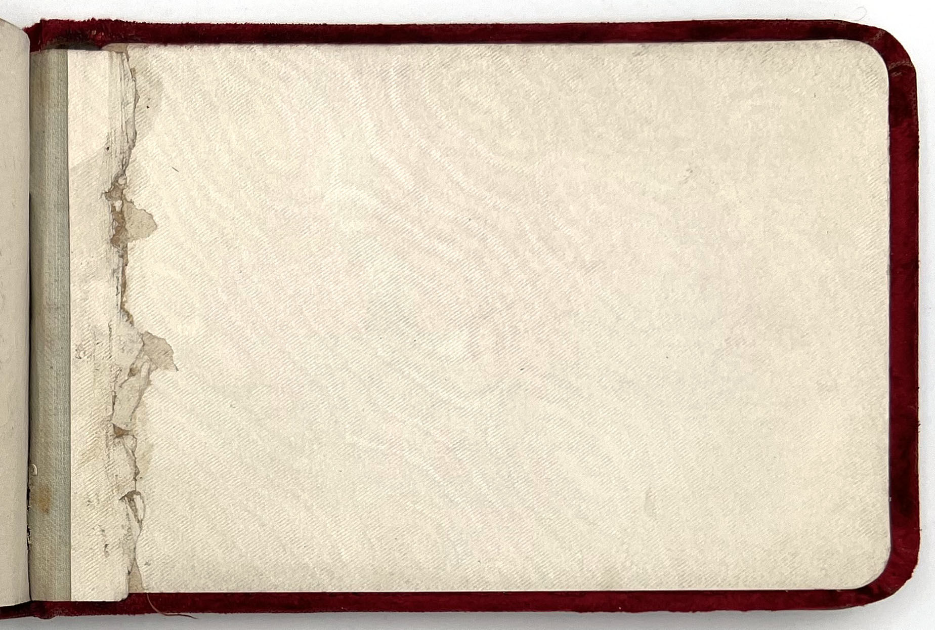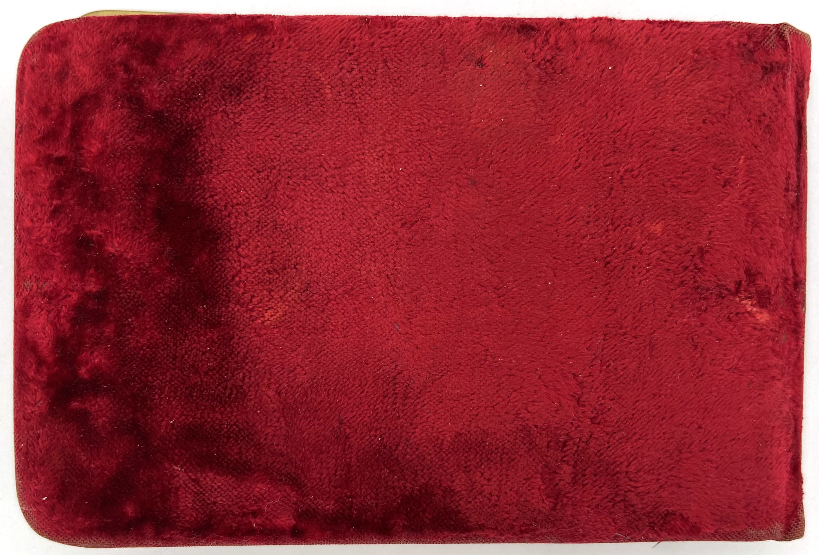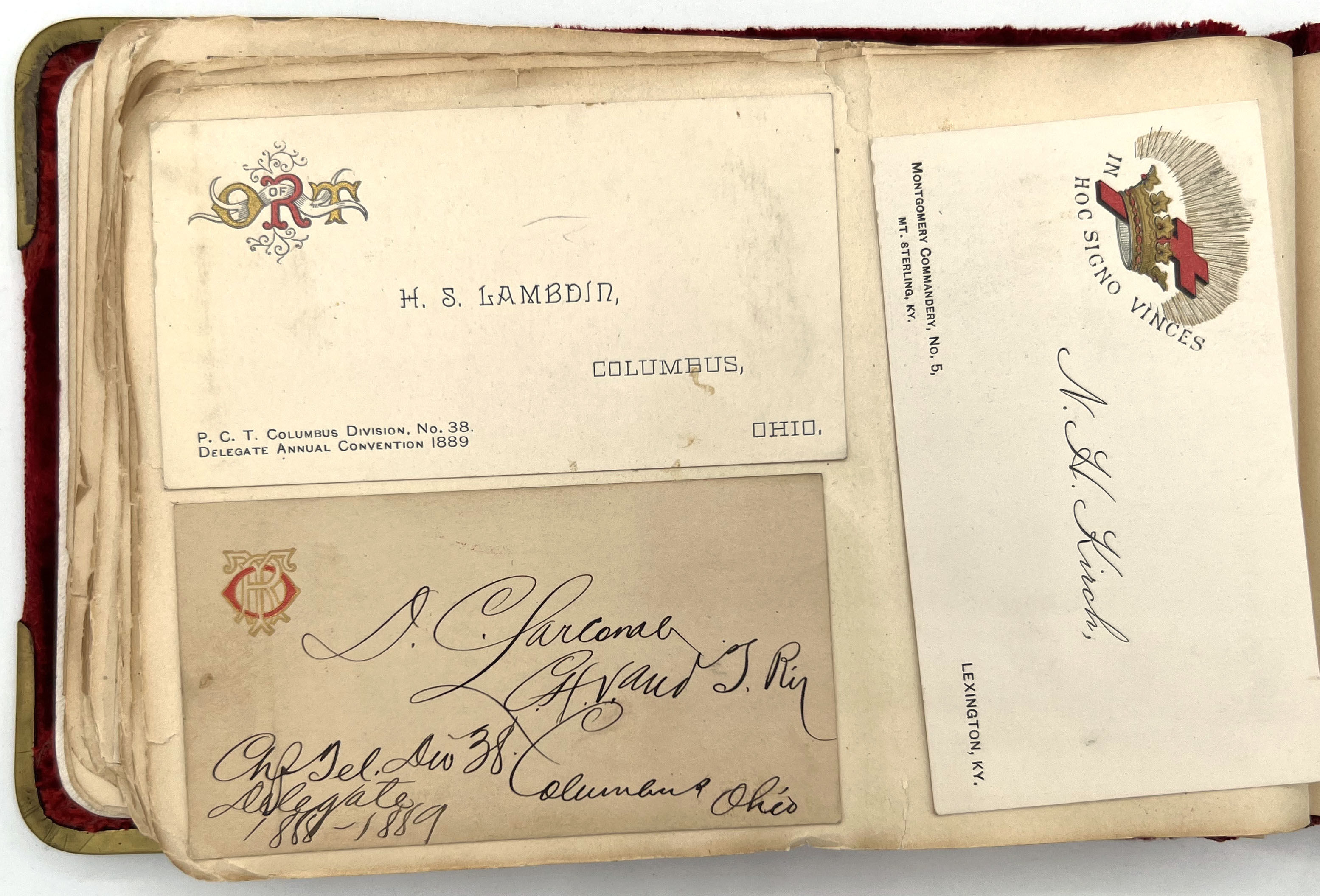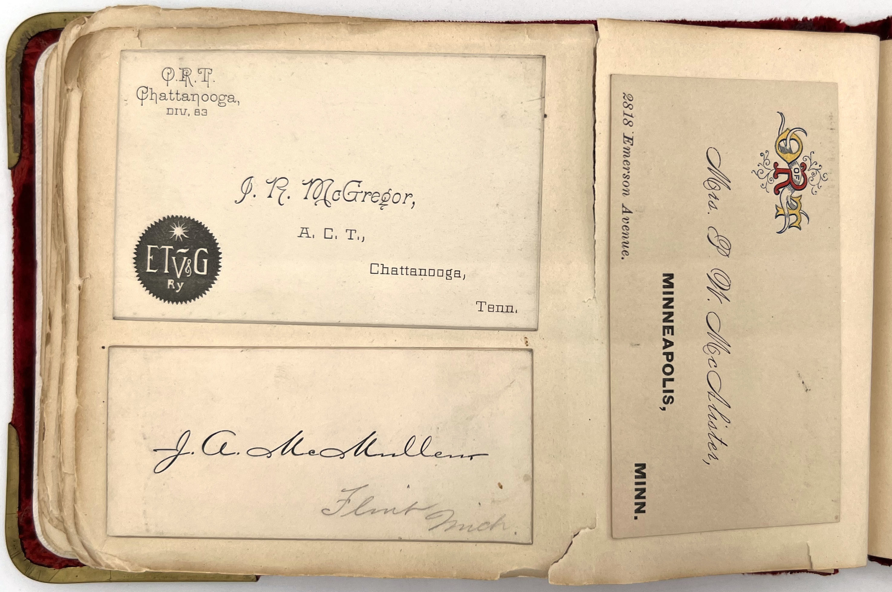 Oblong 8vo (5.25" by 7.75"), approx. 20 blank leaves, 89 business cards pasted-in. Inscribed on first leaf recto, "Otto Winters. Phil: 1: 3. Mother." Loosely inserted in the front are the two calling cards (approx. 1.75" by 3.5" each) of Otto Winters and Minnie Radel. Bound in original red velvet with rounded corners, decorative brass hardware on right-hand corners of upper board. The Collector - Otto Winters The cards appear to have been collected when Winters was a child in the late 1880s. Sadly, he died in a tragic railroad accident towards the end of his career in 1940, when he was acting as head brakeman on the Wisconsin Valley Line of the Milwaukee Railroad; the engine exploded, resulting in the deaths of him and his coworkers, engineer Richard Grorich and fireman Alvin Jantz.