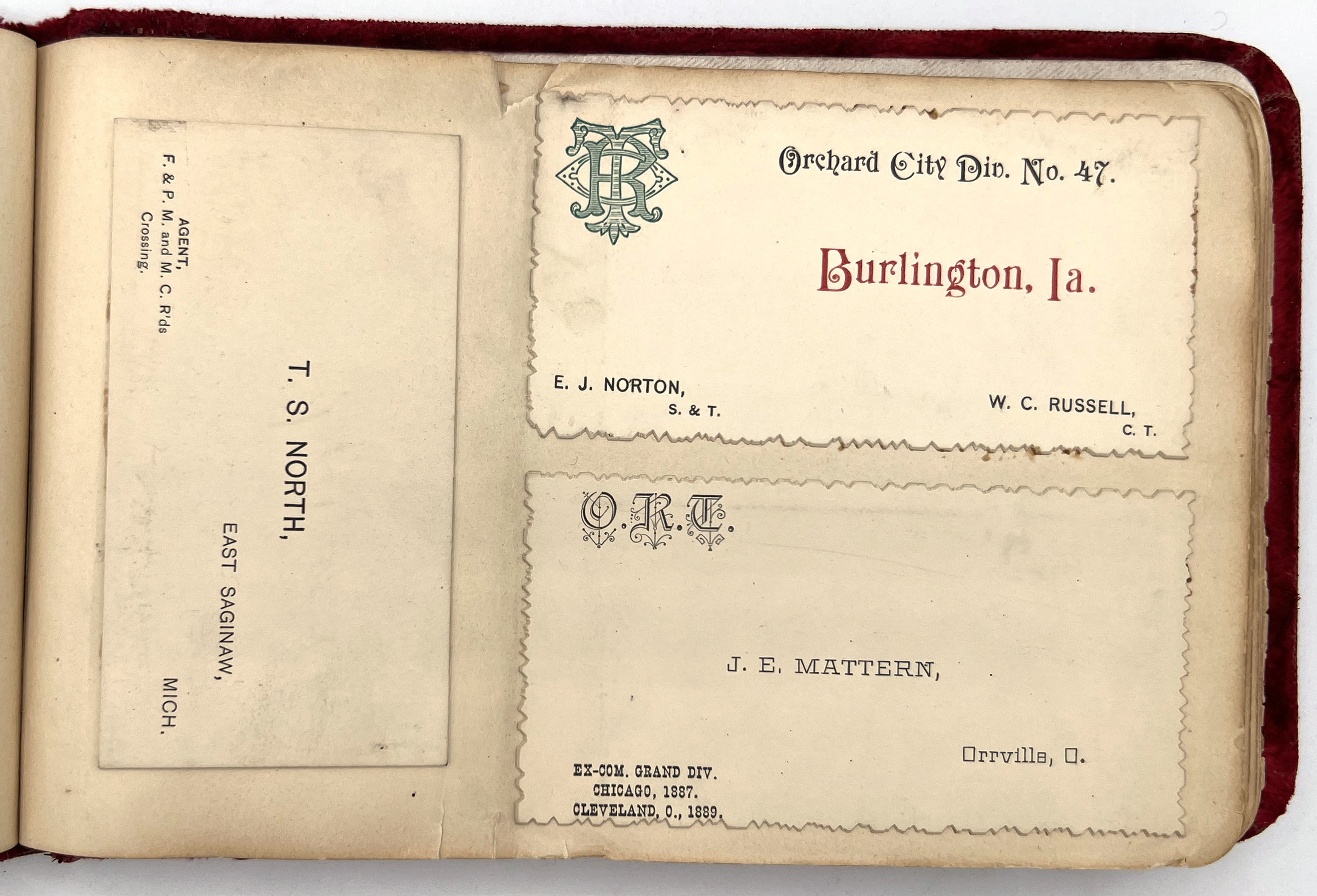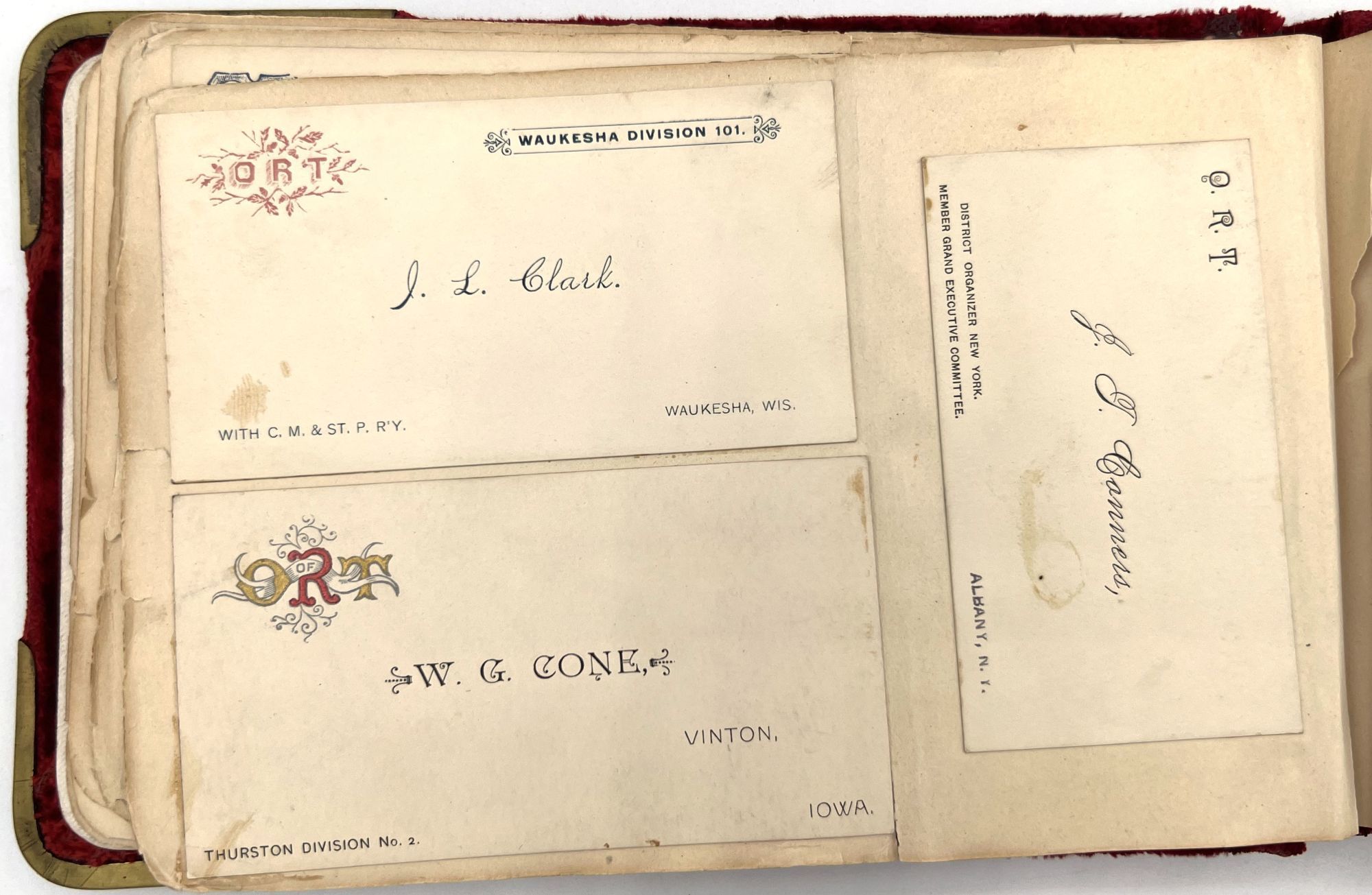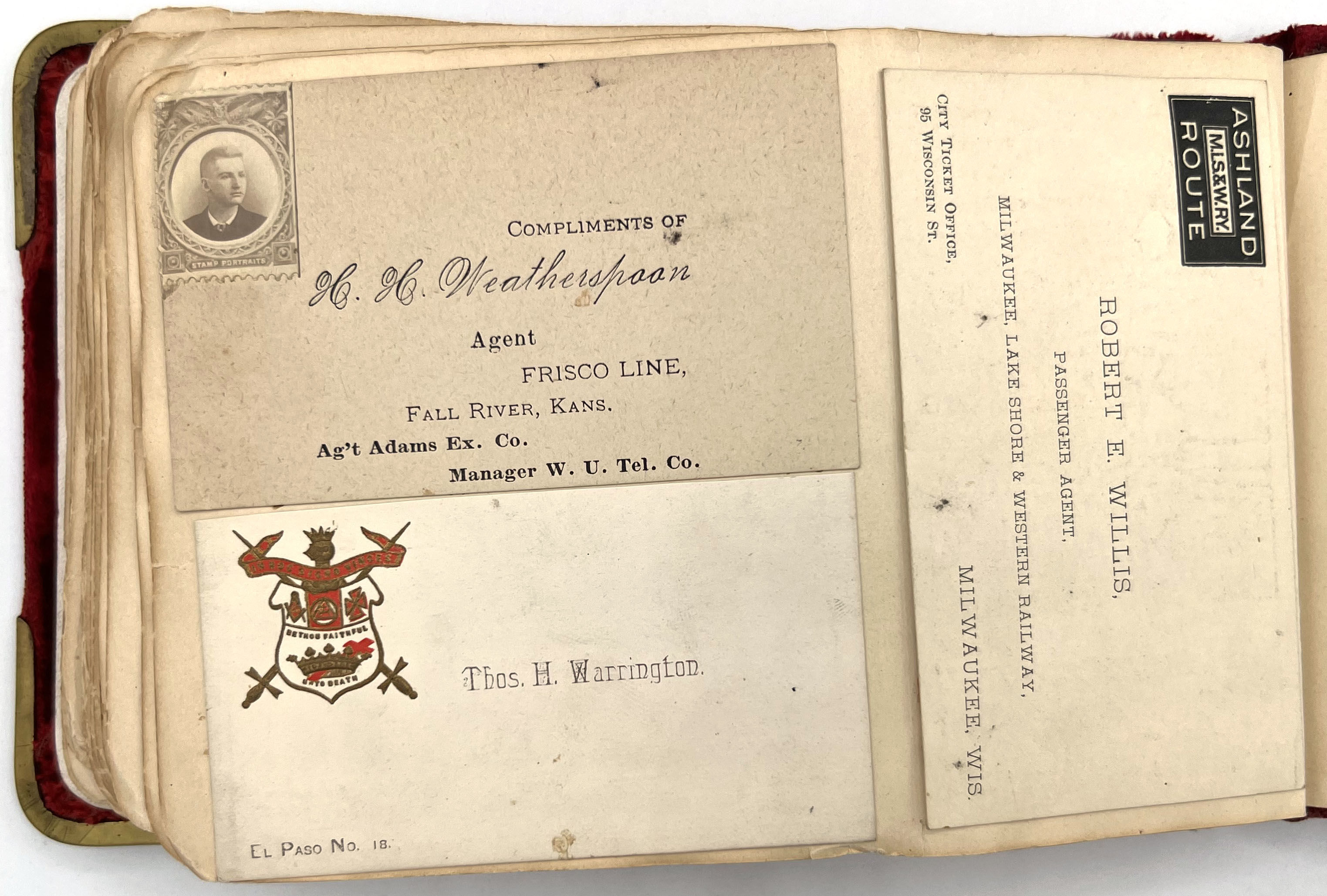 United States, 1890. Good to very good. Toned with some dust soiling, short tears, wear to edges of text block. Paper brittle/delicate, as least one leaf detached. Damage to upper pastedown.. Railroad business card album of Otto Winters, a life long railroad enthusiast including eighty-nine (89) business cards pasted-in representing train engineers, telegraphers, dispatchers, ticket agents, and others associated with the railroad industry in the late 1880s. Most are located in Wisconsin and the midwest, but other states including New York, Utah, and Texas are also represented. At least two of the cards include small stamp photo portraits (H.H. Weatherspoon and C.B. Hawley). Virtually all included were members of Order of Railroad Telegraphers.
