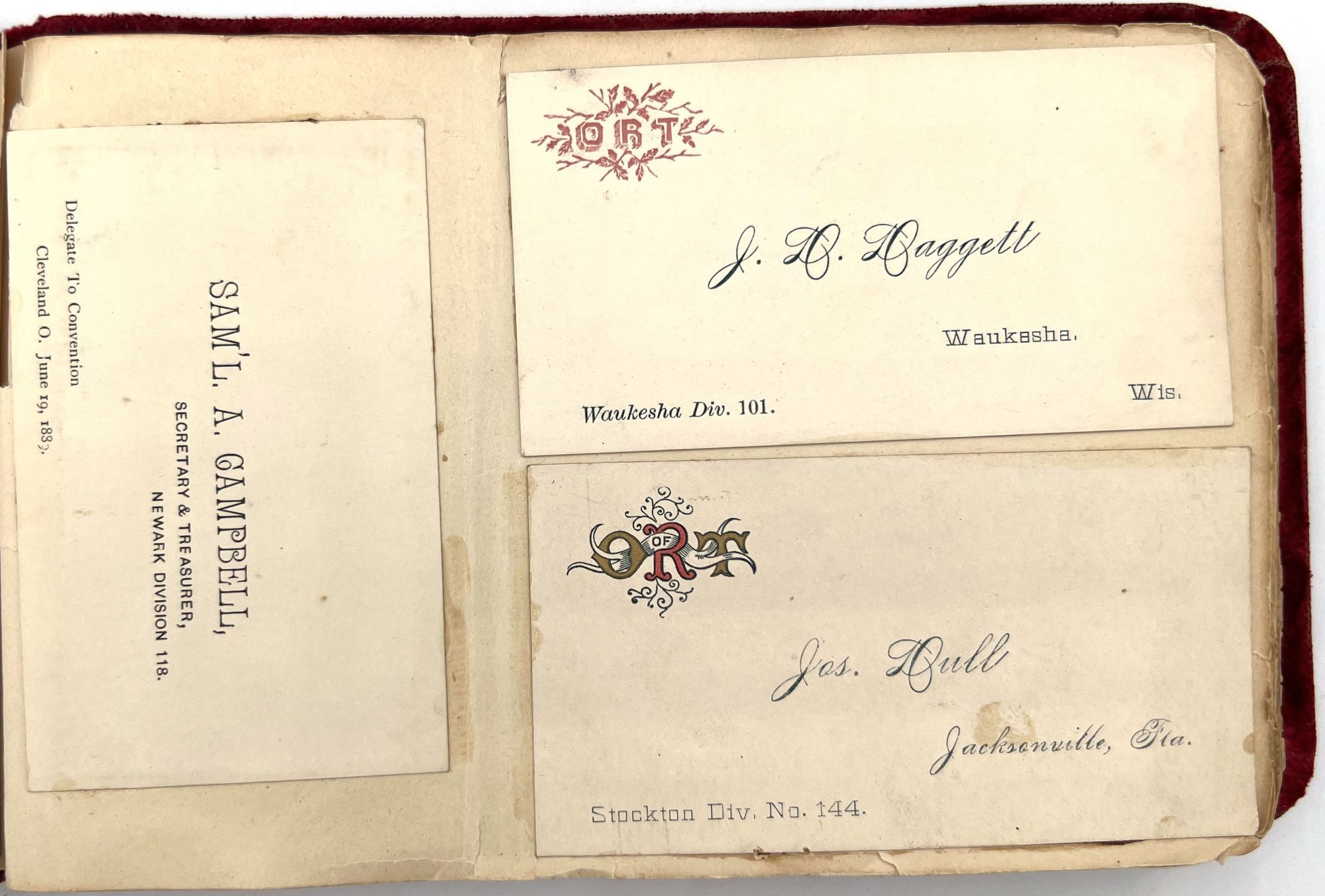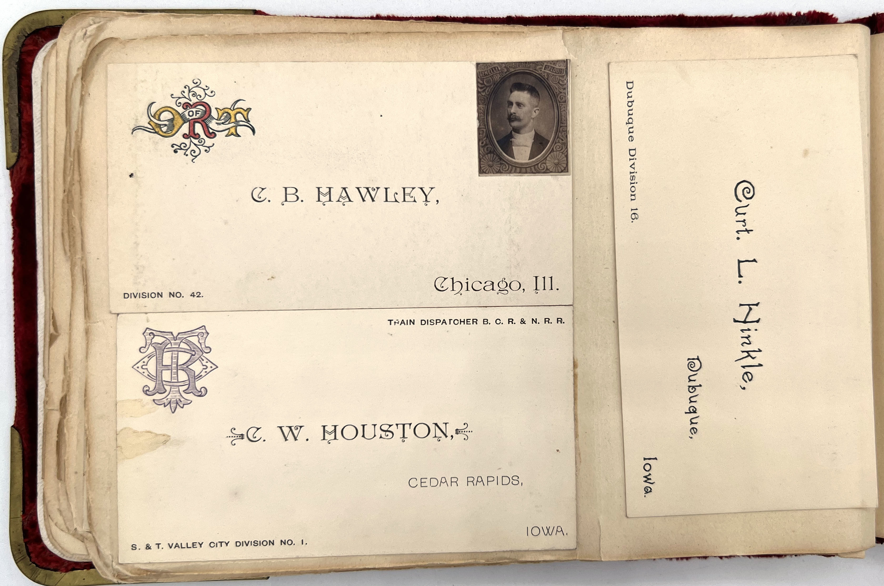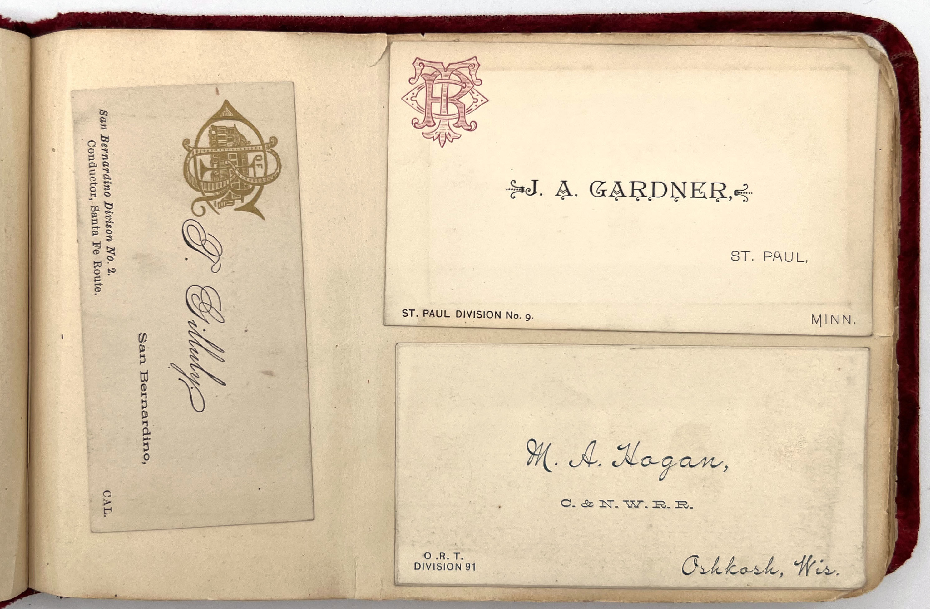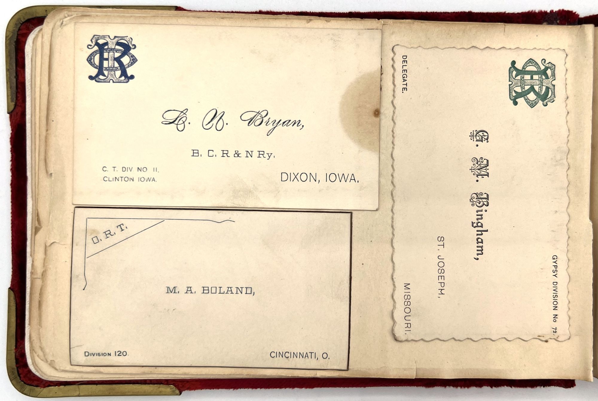United States, 1890. Good to very good. Toned with some dust soiling, short tears, wear to edges of text block. Paper brittle/delicate, as least one leaf detached. Damage to upper pastedown.. Railroad business card album of Otto Winters, a life long railroad enthusiast including eighty-nine (89) business cards pasted-in representing train engineers, telegraphers, dispatchers, ticket agents, and others associated with the railroad industry in the late 1880s. Most are located in Wisconsin and the midwest, but other states including New York, Utah, and Texas are also represented. At least two of the cards include small stamp photo portraits (H.H. Weatherspoon and C.B. Hawley). Virtually all included were members of Order of Railroad Telegraphers.