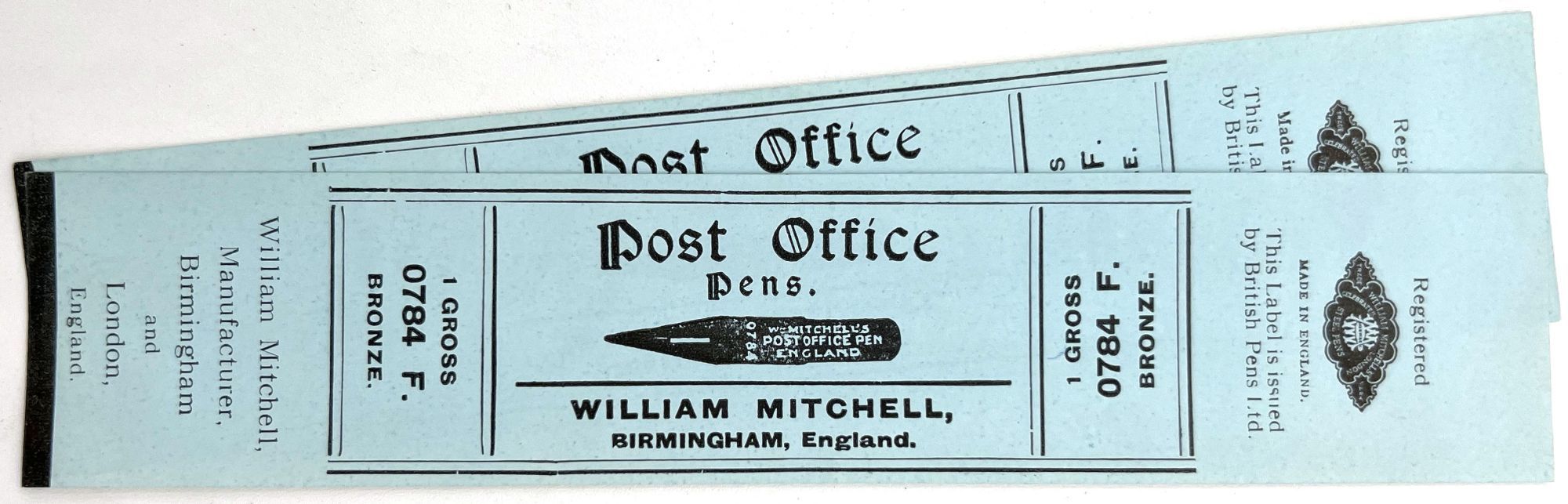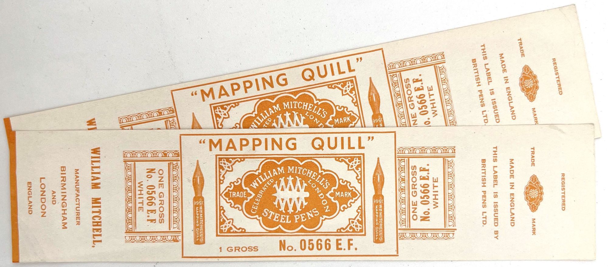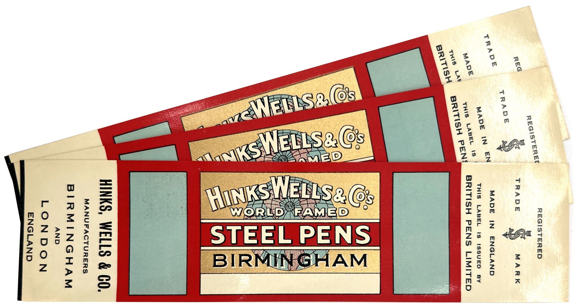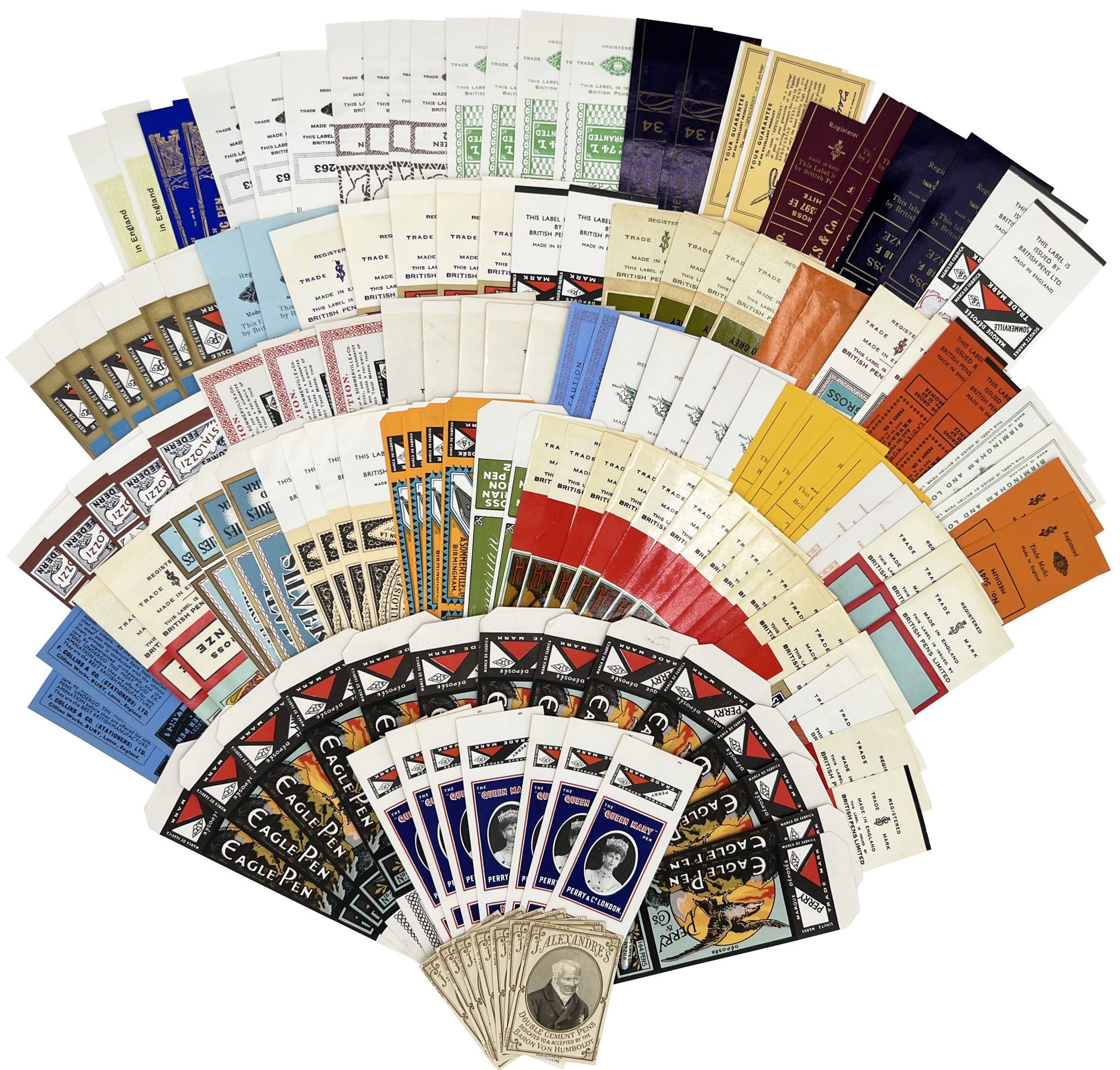 England and United States, 1910. Very good to near-fine. Minor toning, the odd spot or short tear throughout. Glassine paper design has edgewear/chipping with minor loss. Evidence of previous adhesive to some items. One pen label has remains of black paper to lower left-hand corner.. A fine collection of one hundred sixty one (161) items relating to the sale of pen nibs in Edwardian England and America, comprised of: one hundred fifty (150) chromolithographed labels for pen boxes of those 45 are unique; one (1) illustrated advertising cover; two (2) illustrated trade cards; five (5) illustrated advertising leaflets; one (1) card with twelve (12) actual Mapping Pen nibs; one (1) typewritten letter on illustrated company letterhead; a blotter, and one (1) original ink label design on glassine paper (keyline drawing for lithography). Over twenty different manufacturers and brands are represented in this collection, most based in Birmingham, London, or New York.