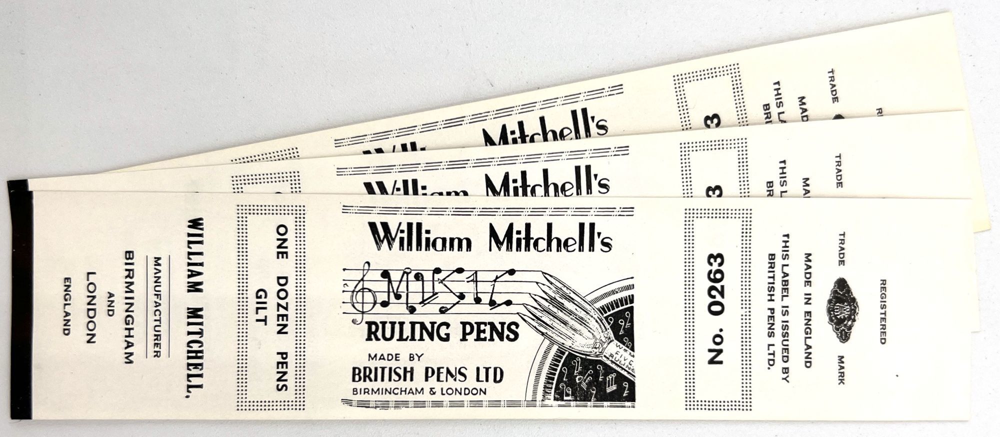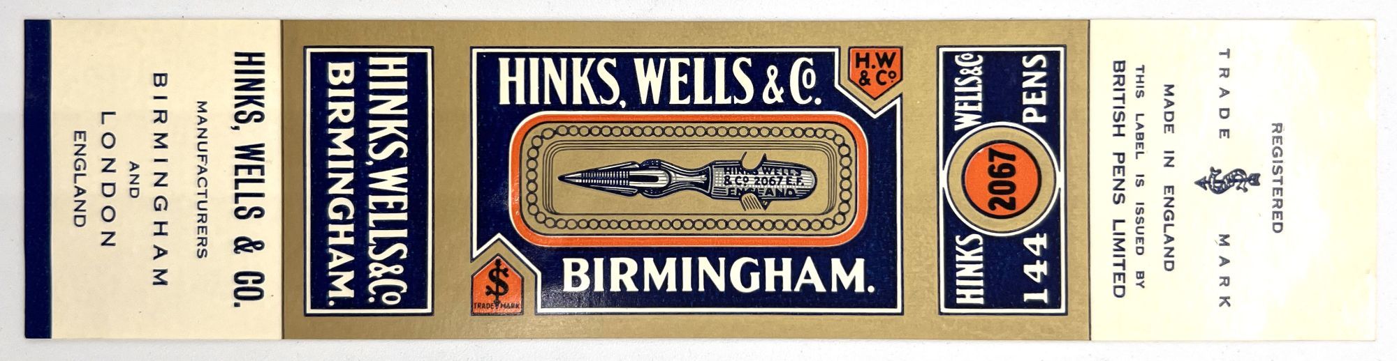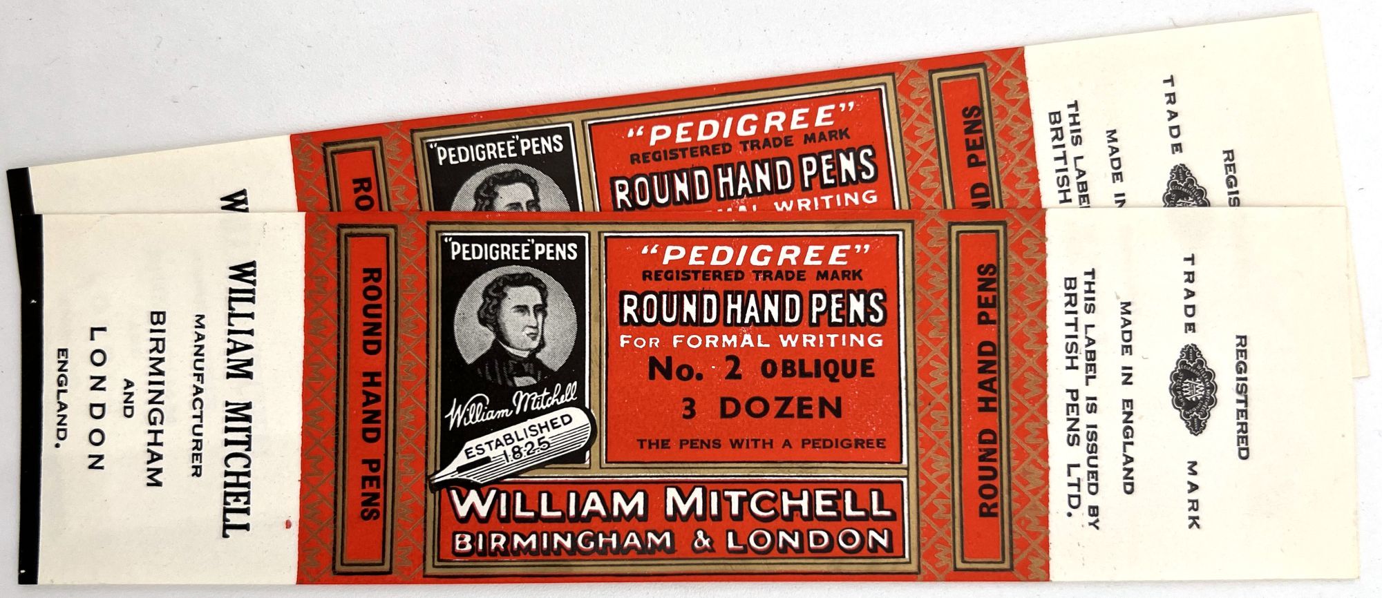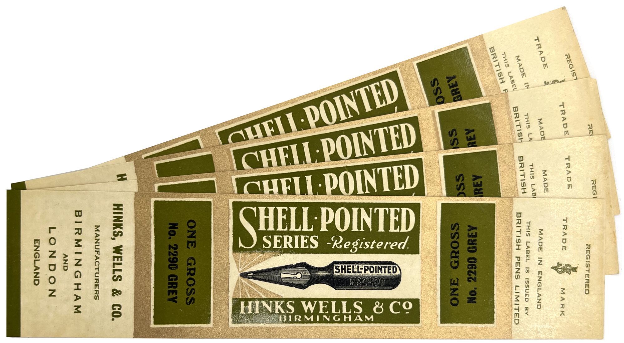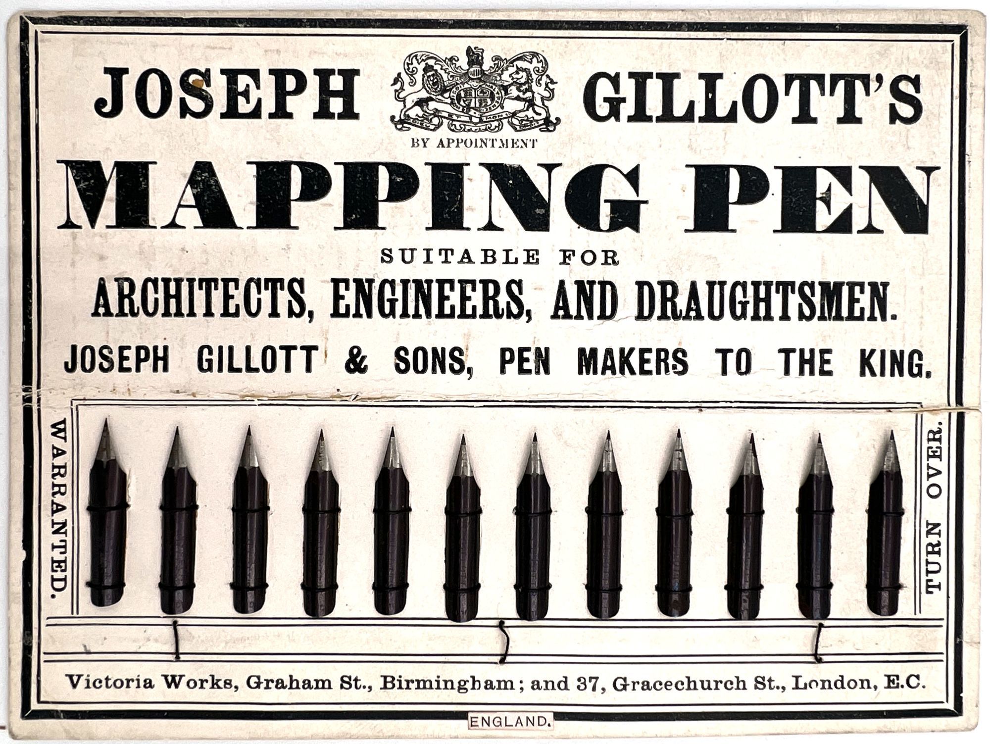 England and United States, 1910. Very good to near-fine. Minor toning, the odd spot or short tear throughout. Glassine paper design has edgewear/chipping with minor loss. Evidence of previous adhesive to some items. One pen label has remains of black paper to lower left-hand corner.. A fine collection of one hundred sixty one (161) items relating to the sale of pen nibs in Edwardian England and America, comprised of: one hundred fifty (150) chromolithographed labels for pen boxes of those 45 are unique; one (1) illustrated advertising cover; two (2) illustrated trade cards; five (5) illustrated advertising leaflets; one (1) card with twelve (12) actual Mapping Pen nibs; one (1) typewritten letter on illustrated company letterhead; a blotter, and one (1) original ink label design on glassine paper (keyline drawing for lithography). Over twenty different manufacturers and brands are represented in this collection, most based in Birmingham, London, or New York.