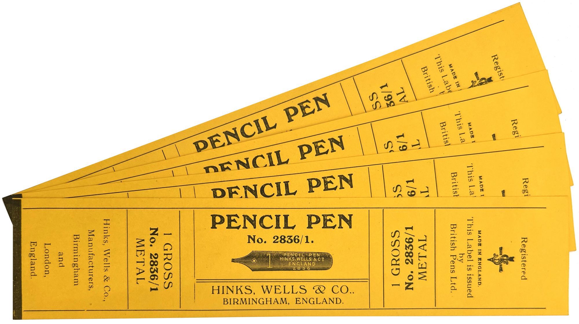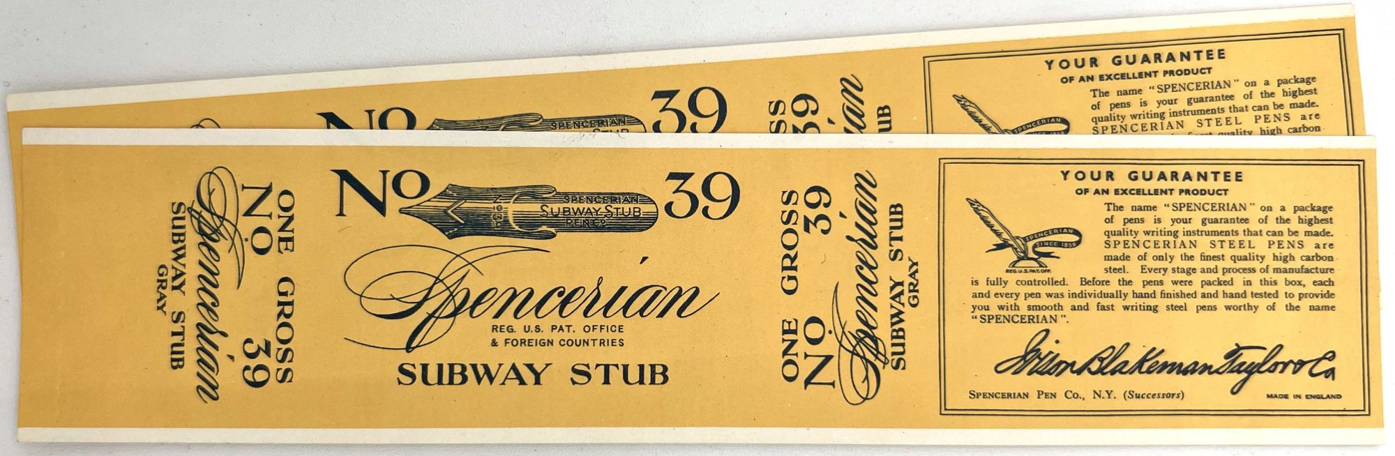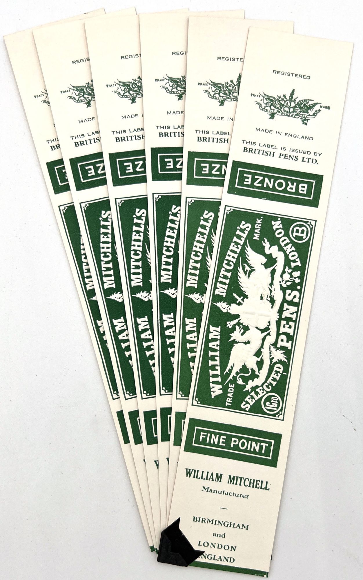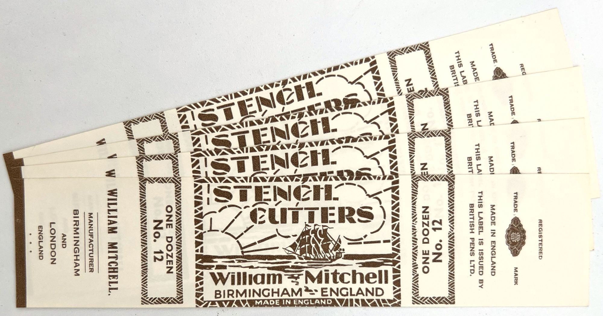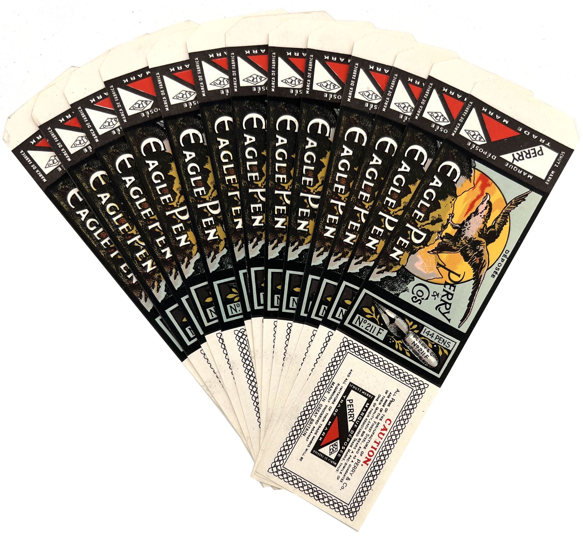 England and United States, 1910. Very good to near-fine. Minor toning, the odd spot or short tear throughout. Glassine paper design has edgewear/chipping with minor loss. Evidence of previous adhesive to some items. One pen label has remains of black paper to lower left-hand corner.. A fine collection of one hundred sixty one (161) items relating to the sale of pen nibs in Edwardian England and America, comprised of: one hundred fifty (150) chromolithographed labels for pen boxes of those 45 are unique; one (1) illustrated advertising cover; two (2) illustrated trade cards; five (5) illustrated advertising leaflets; one (1) card with twelve (12) actual Mapping Pen nibs; one (1) typewritten letter on illustrated company letterhead; a blotter, and one (1) original ink label design on glassine paper (keyline drawing for lithography). Over twenty different manufacturers and brands are represented in this collection, most based in Birmingham, London, or New York.
