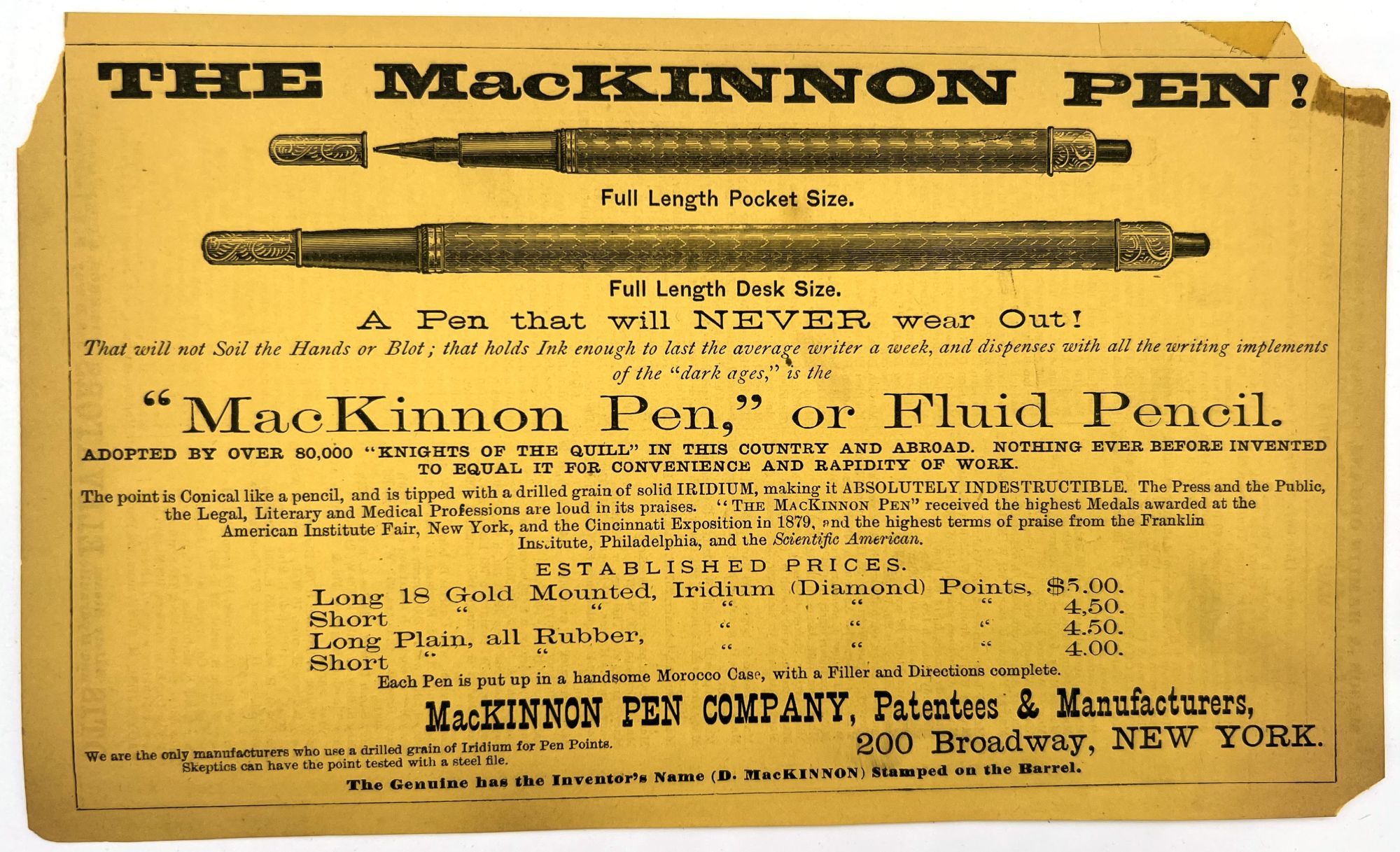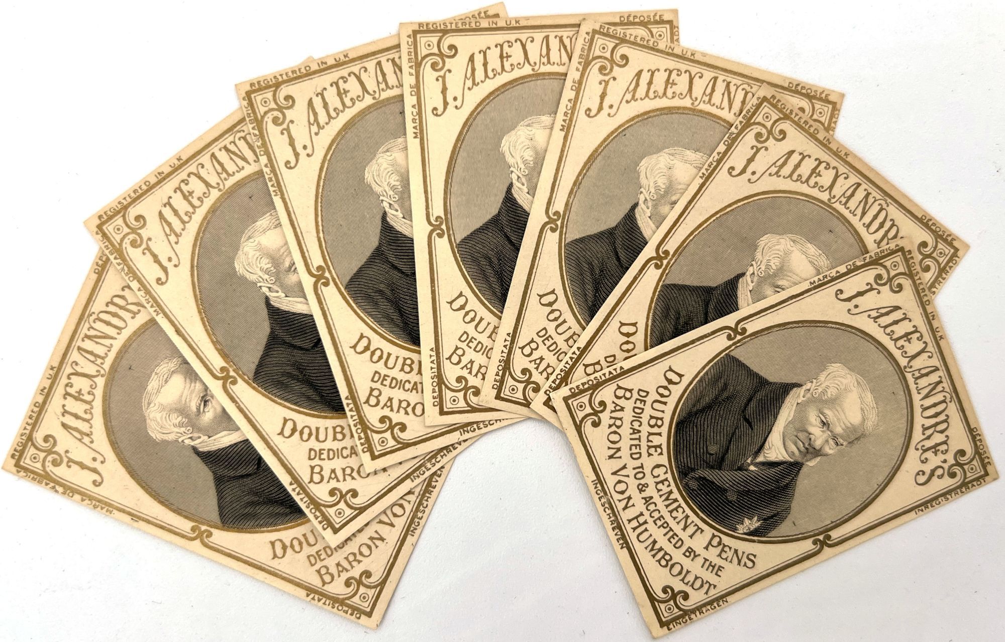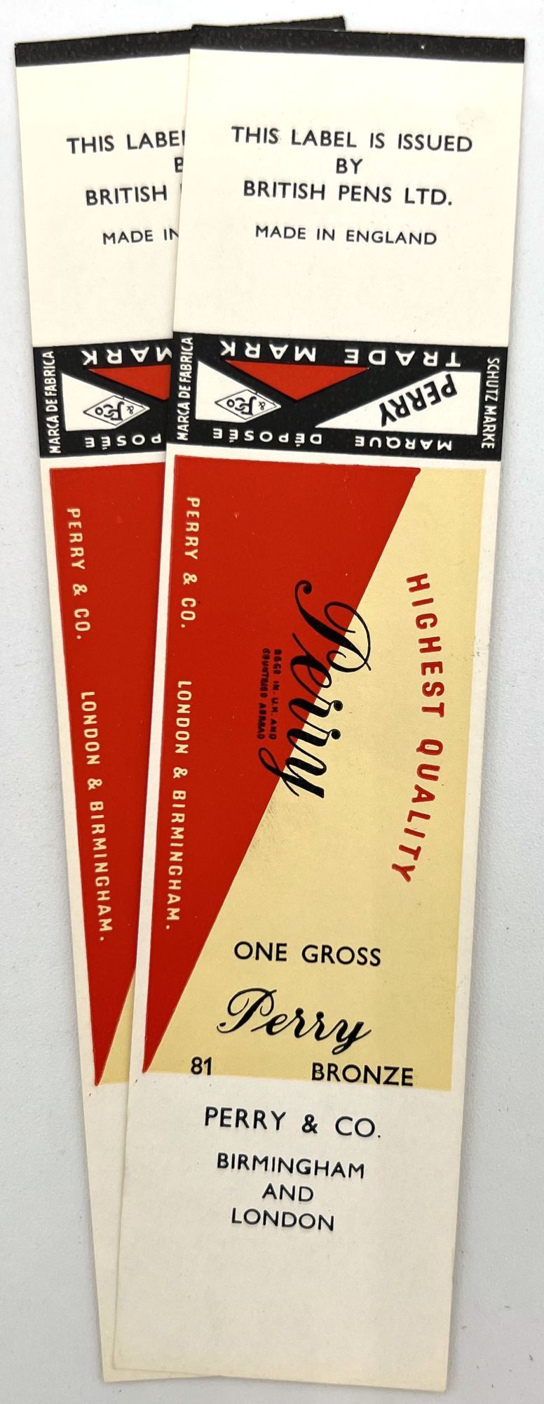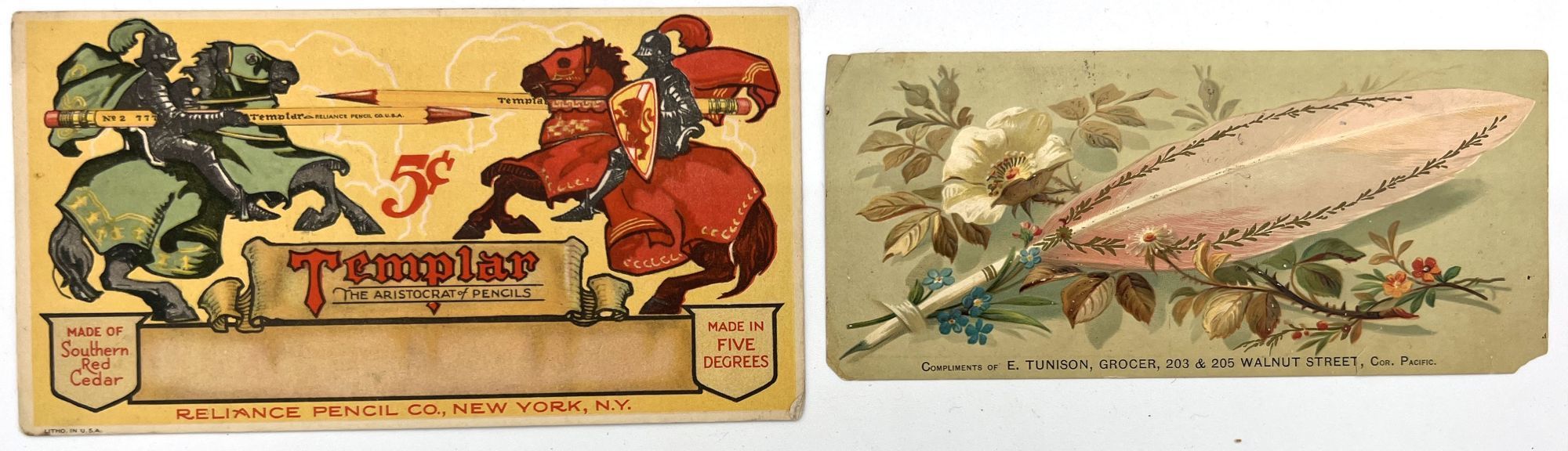 England and United States, 1910. Very good to near-fine. Minor toning, the odd spot or short tear throughout. Glassine paper design has edgewear/chipping with minor loss. Evidence of previous adhesive to some items. One pen label has remains of black paper to lower left-hand corner.. A fine collection of one hundred sixty one (161) items relating to the sale of pen nibs in Edwardian England and America, comprised of: one hundred fifty (150) chromolithographed labels for pen boxes of those 45 are unique; one (1) illustrated advertising cover; two (2) illustrated trade cards; five (5) illustrated advertising leaflets; one (1) card with twelve (12) actual Mapping Pen nibs; one (1) typewritten letter on illustrated company letterhead; a blotter, and one (1) original ink label design on glassine paper (keyline drawing for lithography). Over twenty different manufacturers and brands are represented in this collection, most based in Birmingham, London, or New York.