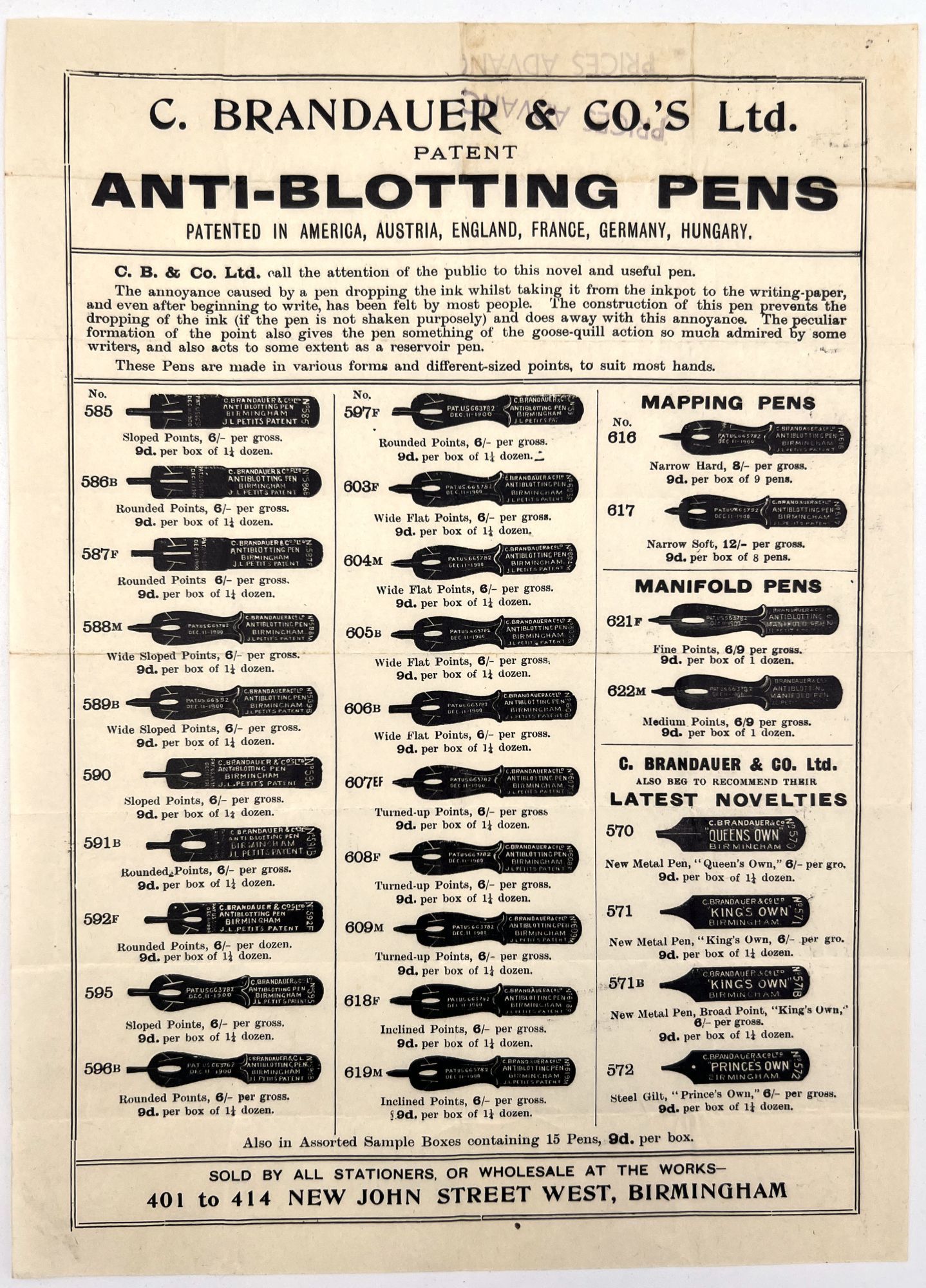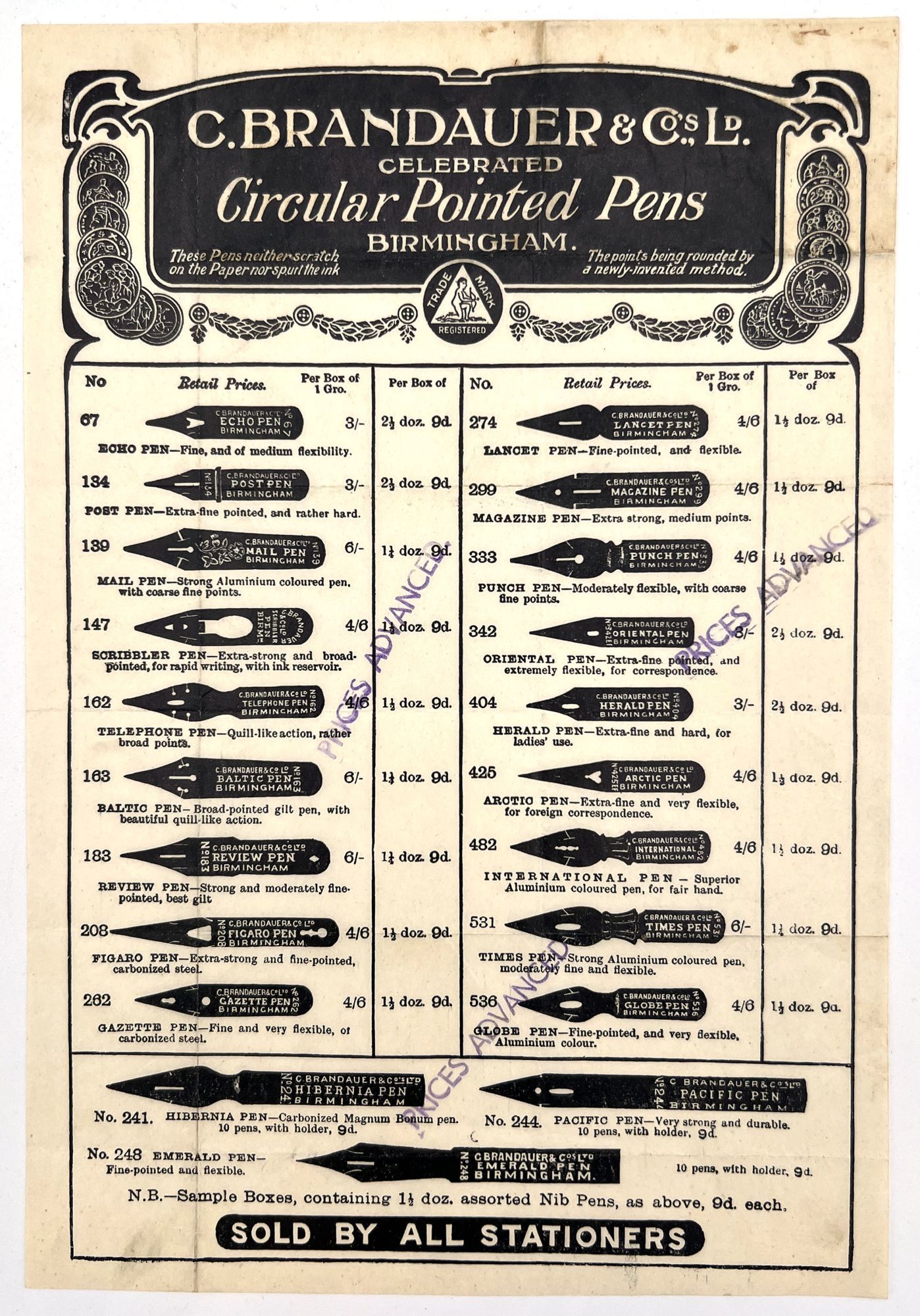 Includes two circulars with images and product information and usage for C. Brandauer & Co's Ltd including the Anti-Blotting Pens and Circular Pointed Pens (these represent an additional 49 types of nibs. Pen brands represented in this collection include: Hinks, Wells & Co.; Perry & Co.; British Pens Ltd.; William Mitchell; Plumes Pestalozzi; Perry & Co.; Ivison, Phinney & Co.; Ivison Blakeman Taylor & Co.; A. Sommerville & Co.; Thos. Bower & Son; F. Collins & Co.; Claire Clifford & Co.; MacKinnon Pen Company; T.N. Hickcox & Co.; C. Brandauer & Co.; Esterbrook Steel Pen Manufacturing Co.; F.W. Snow; Joseph Gillott & Sons; Reliance Pencil Co.; Gustave Fischer & Co.; and Thaddeus Davids Ink Co., Inc.