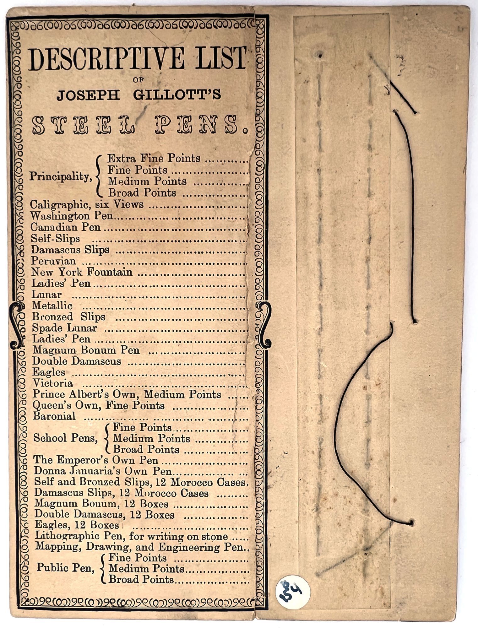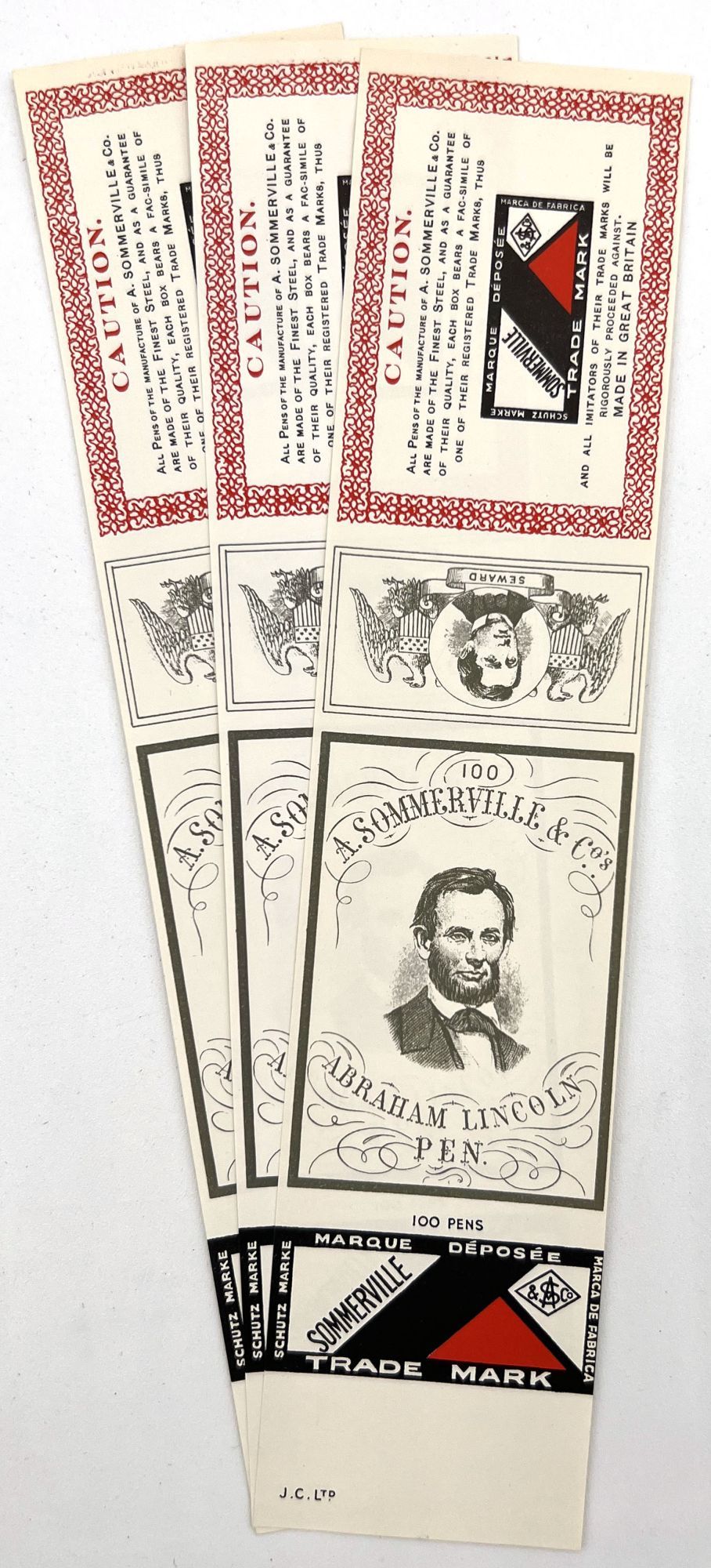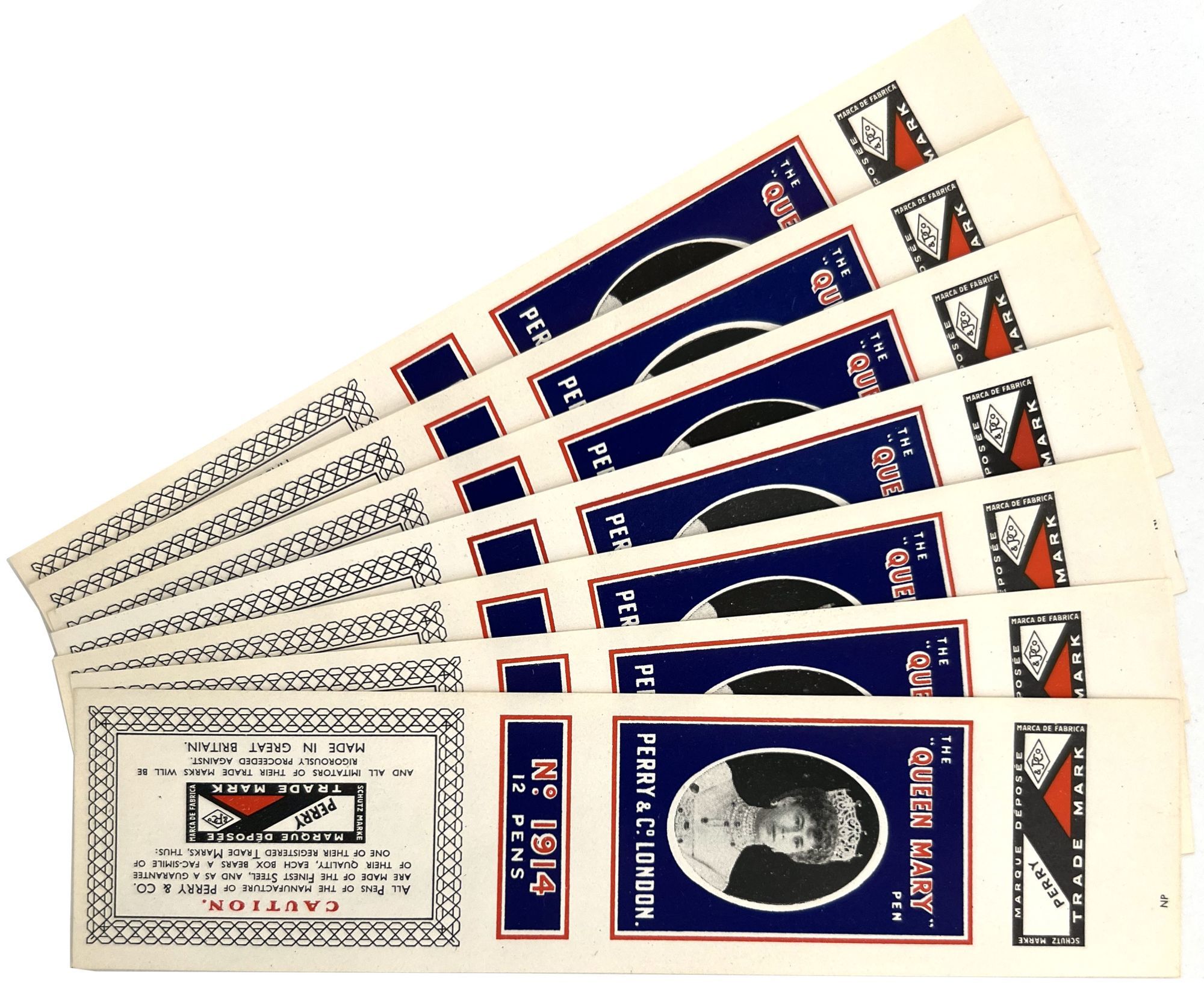 Highlights include the original pen label design on glassine ("David's Oriental Carmine Ink"), as well as the following: a sample card of pen nibs ("Joseph Gillott's Mapping Pen"); an illustrated advertising cover for Waterman's Ideal Fountain Pen, featuring a Gibson Girl; a pen label featuring a photograph of Queen Mary, Queen Consort to George V ("The Queen Mary Pen"); a pen label utilizing Abraham Lincoln's likeness (The "Abraham Lincoln Pen"); and two leaflets by C. Brandauer & Co. with actual size illustrations of pen nibs for sale.