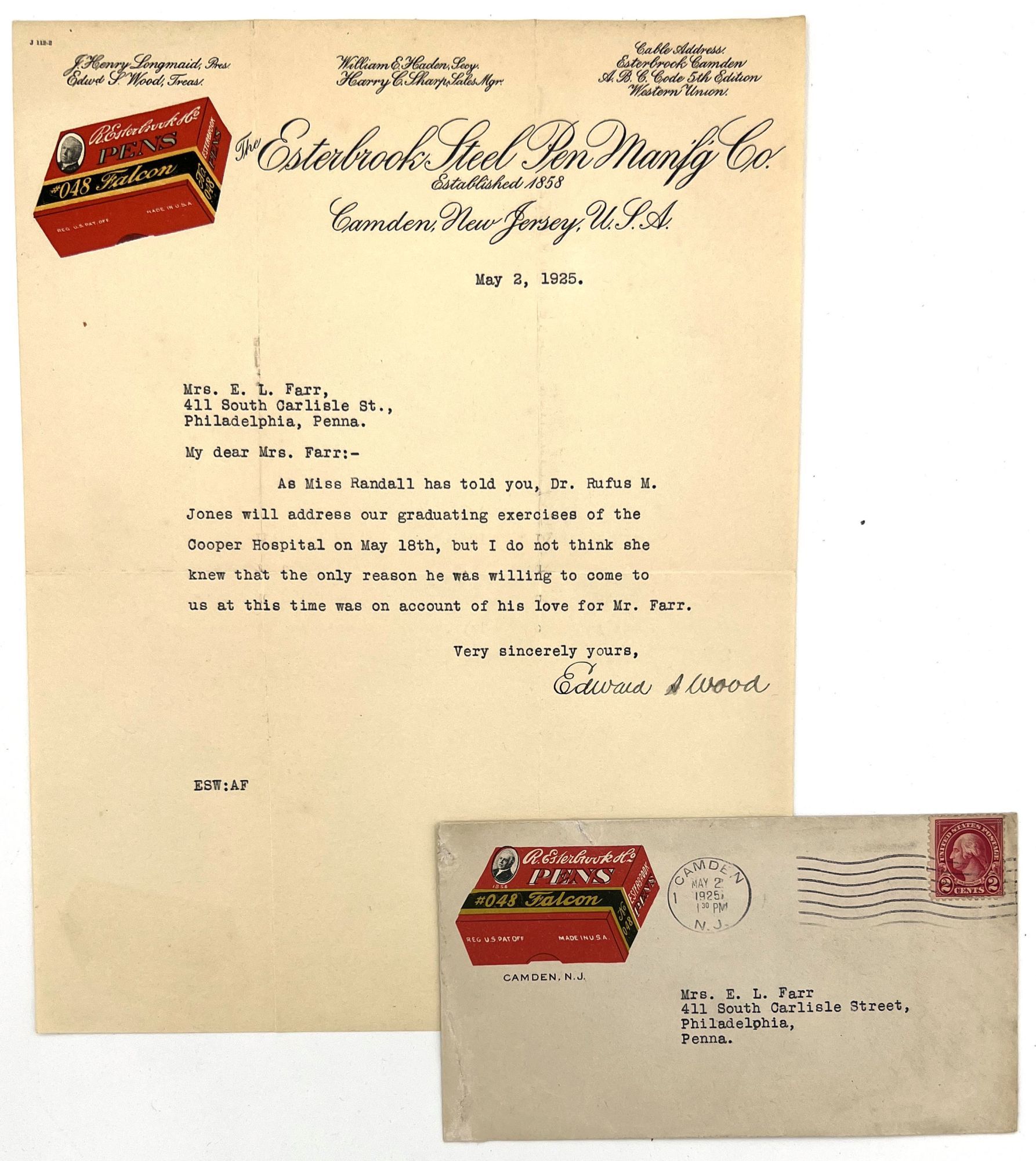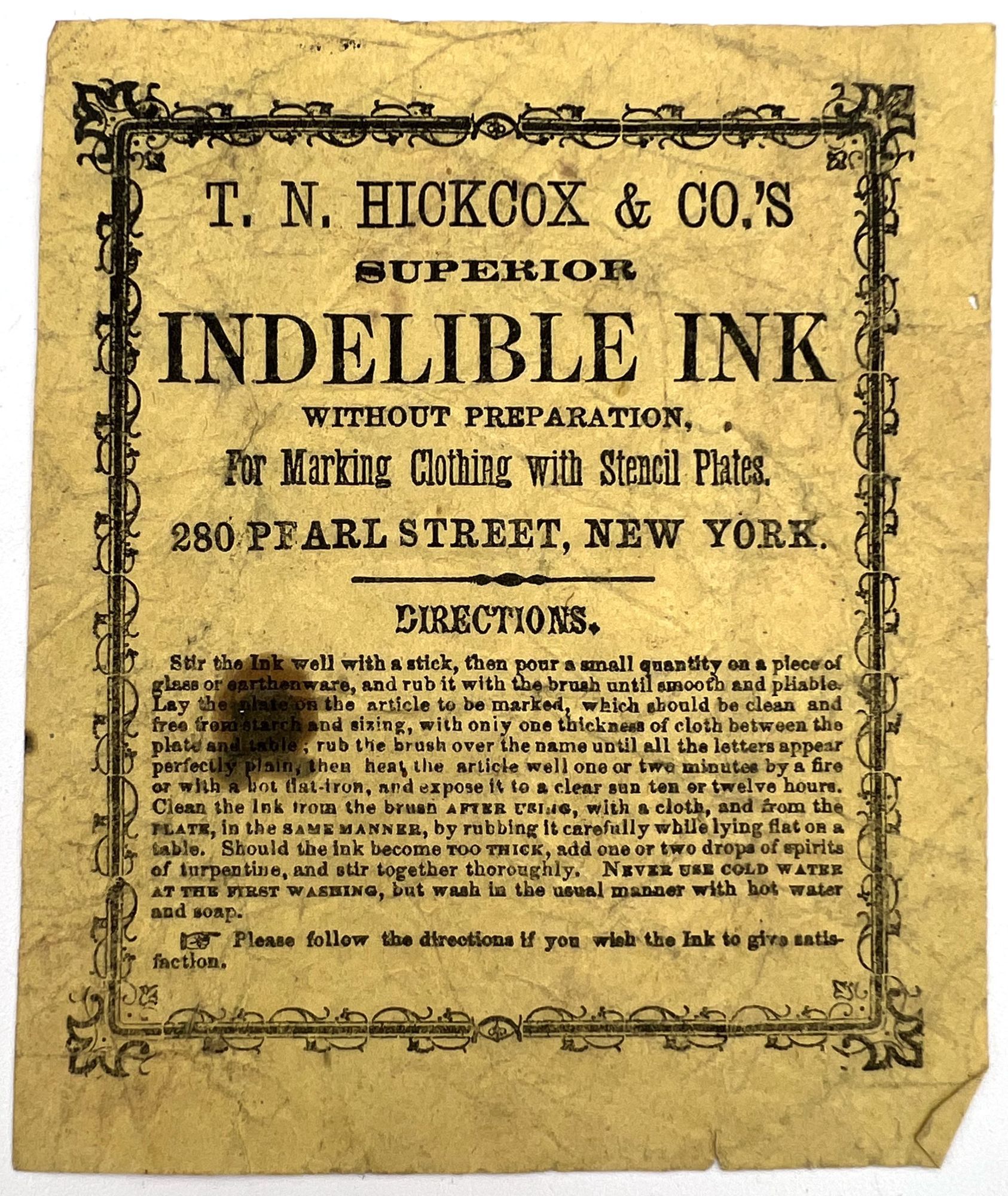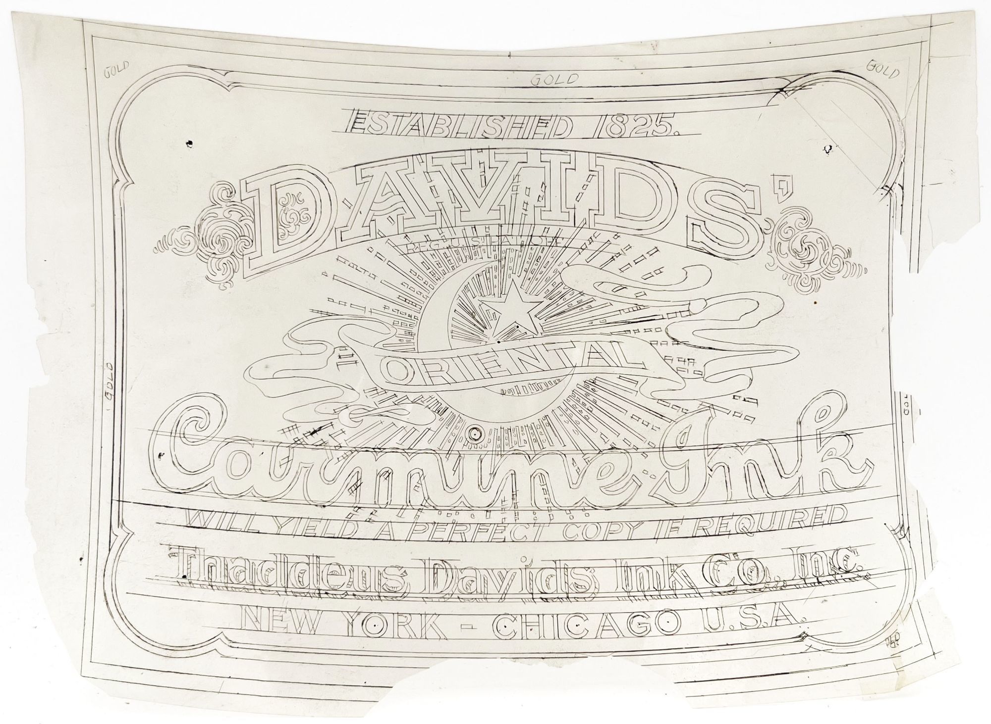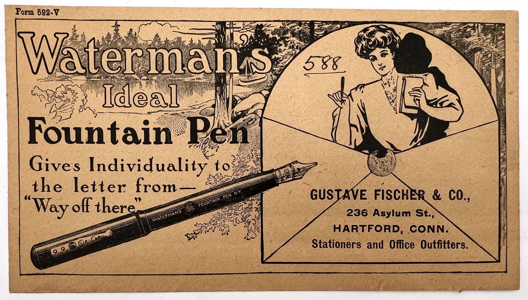 Highlights include the original pen label design on glassine ("David's Oriental Carmine Ink"), as well as the following: a sample card of pen nibs ("Joseph Gillott's Mapping Pen"); an illustrated advertising cover for Waterman's Ideal Fountain Pen, featuring a Gibson Girl; a pen label featuring a photograph of Queen Mary, Queen Consort to George V ("The Queen Mary Pen"); a pen label utilizing Abraham Lincoln's likeness (The "Abraham Lincoln Pen"); and two leaflets by C. Brandauer & Co. with actual size illustrations of pen nibs for sale.