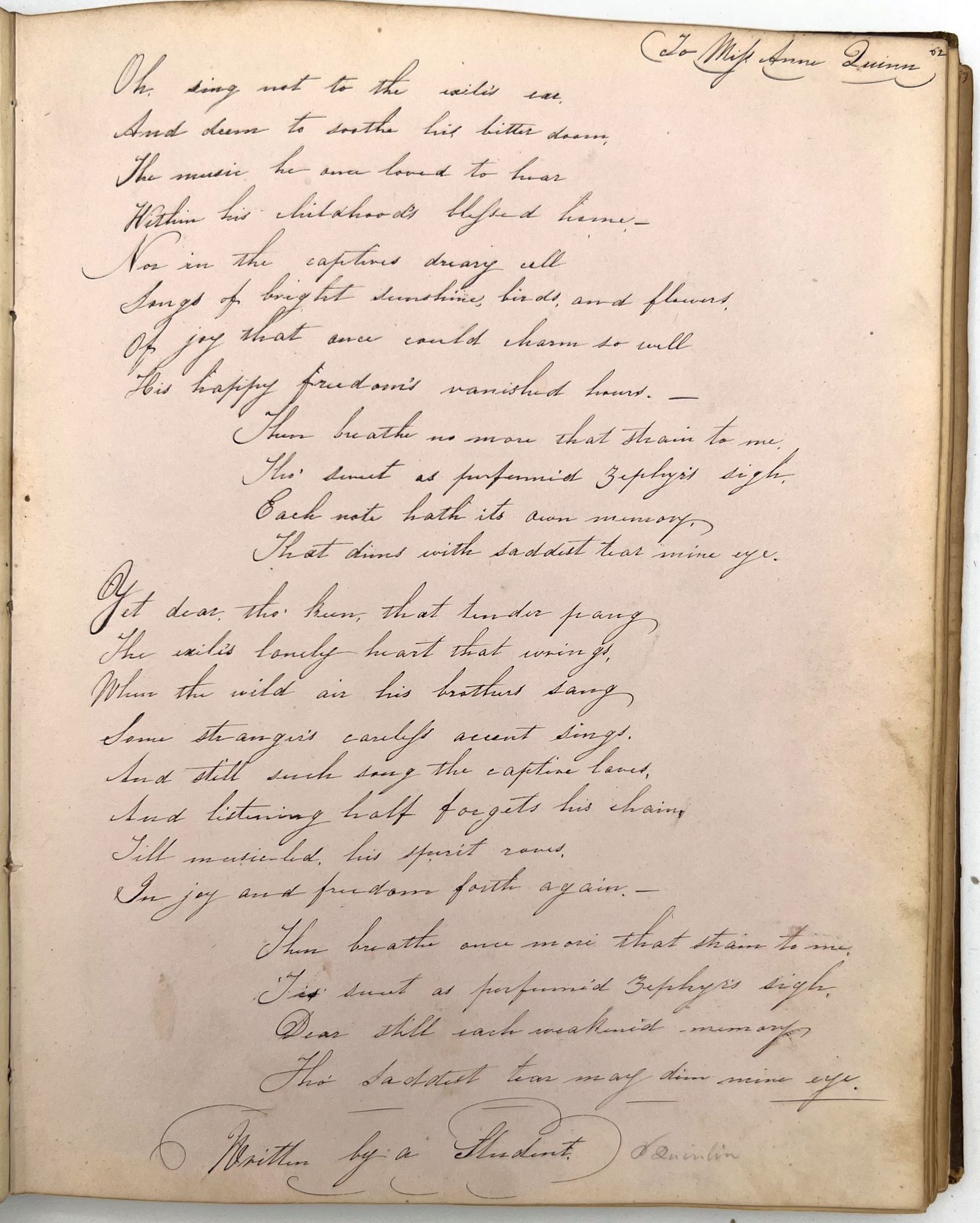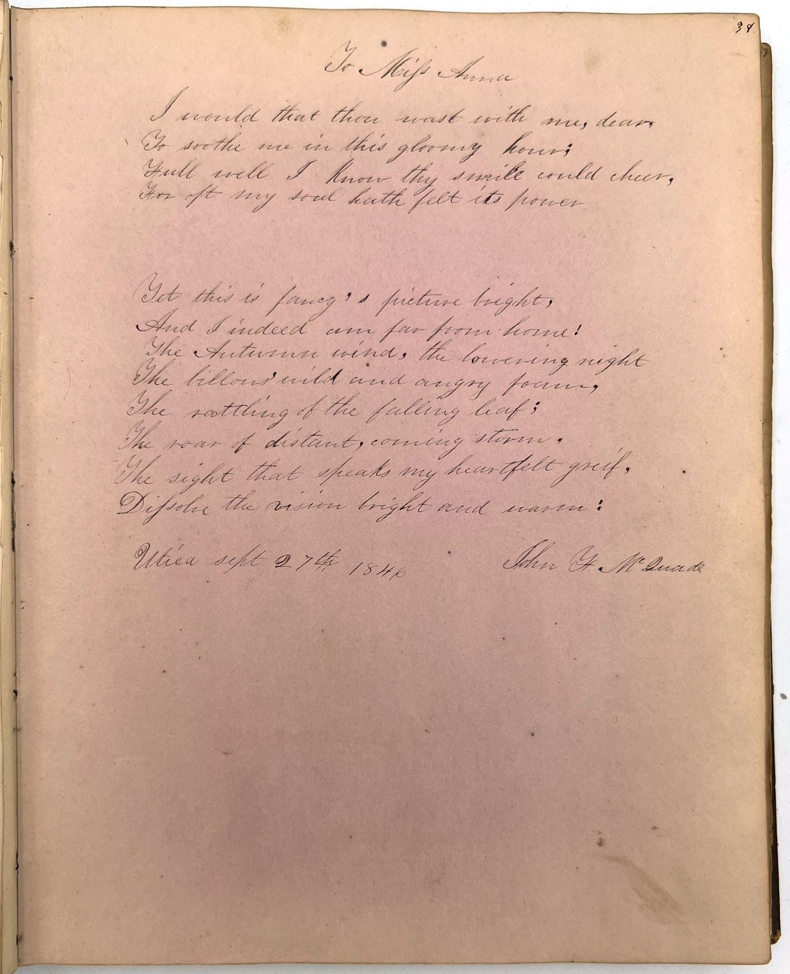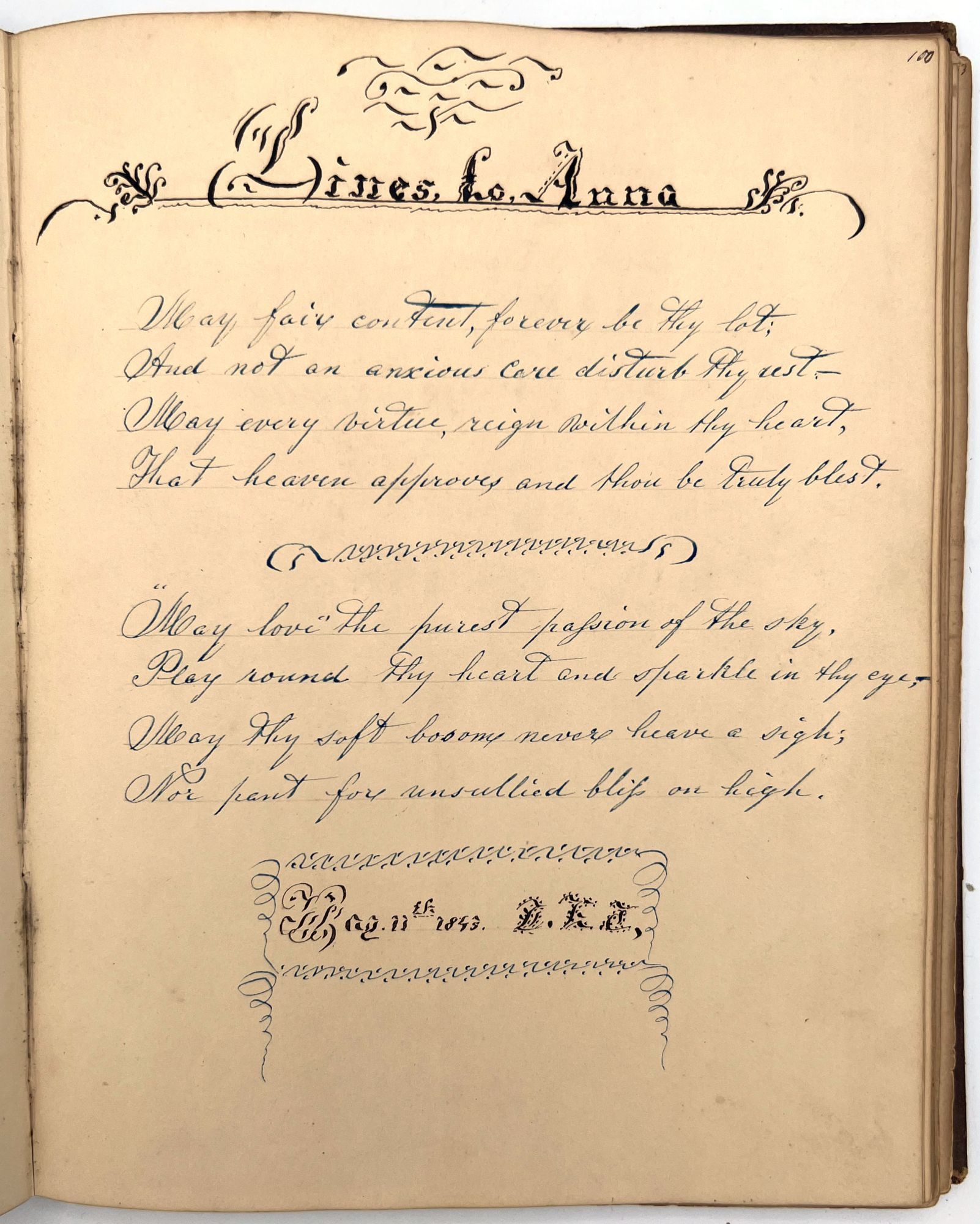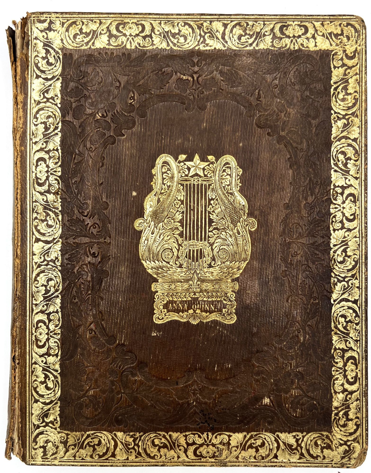 4to (9.5" by 7.5"), approx. 75 leaves, nearly all filled with ink poetry, artwork, etc., and including several steel engraved plates. Pencil signature of Anna Quinn to front free endpaper. Bound in original publisher's brown sheep stamped in blind and gold with Anna's name stamped in gilt on upper board underneath a gold lyre flanked by swans.