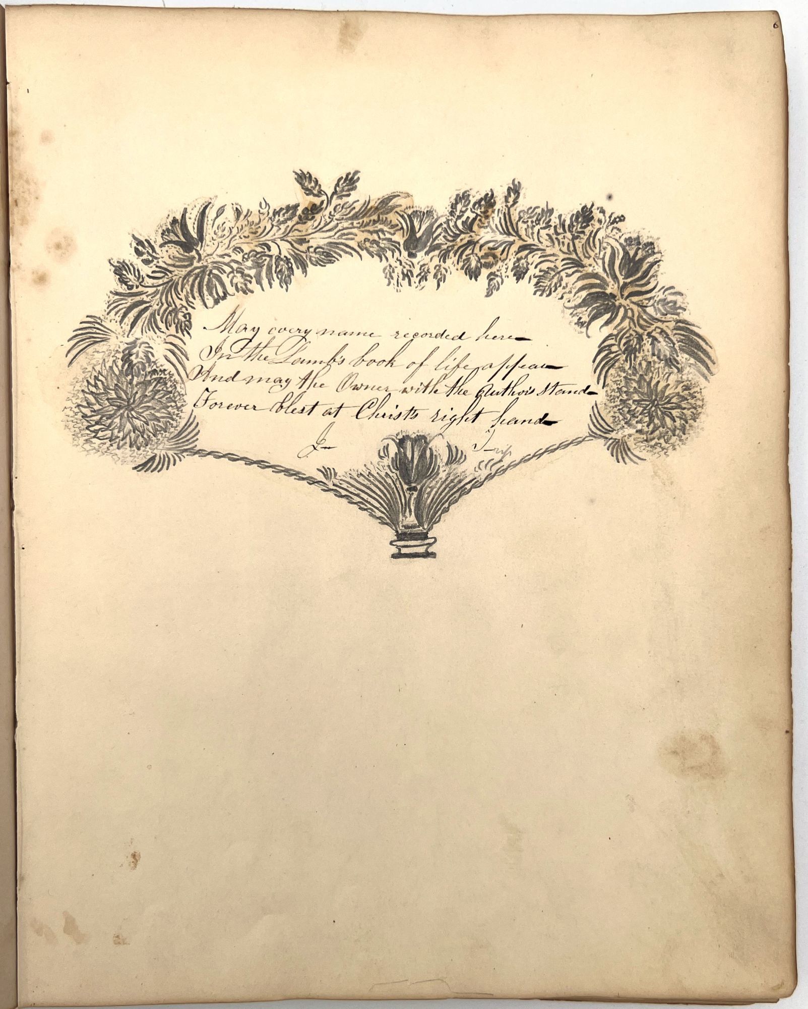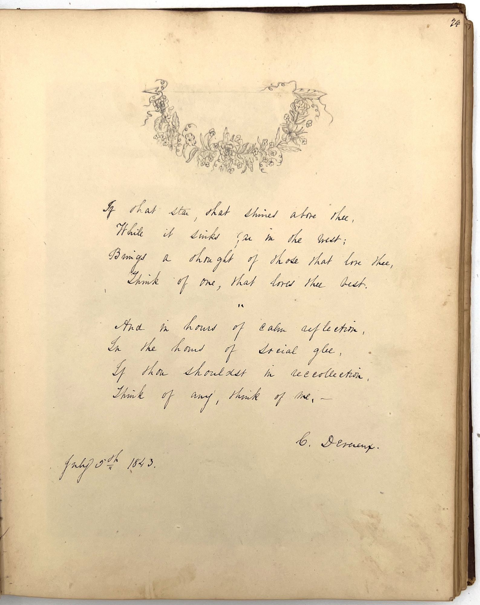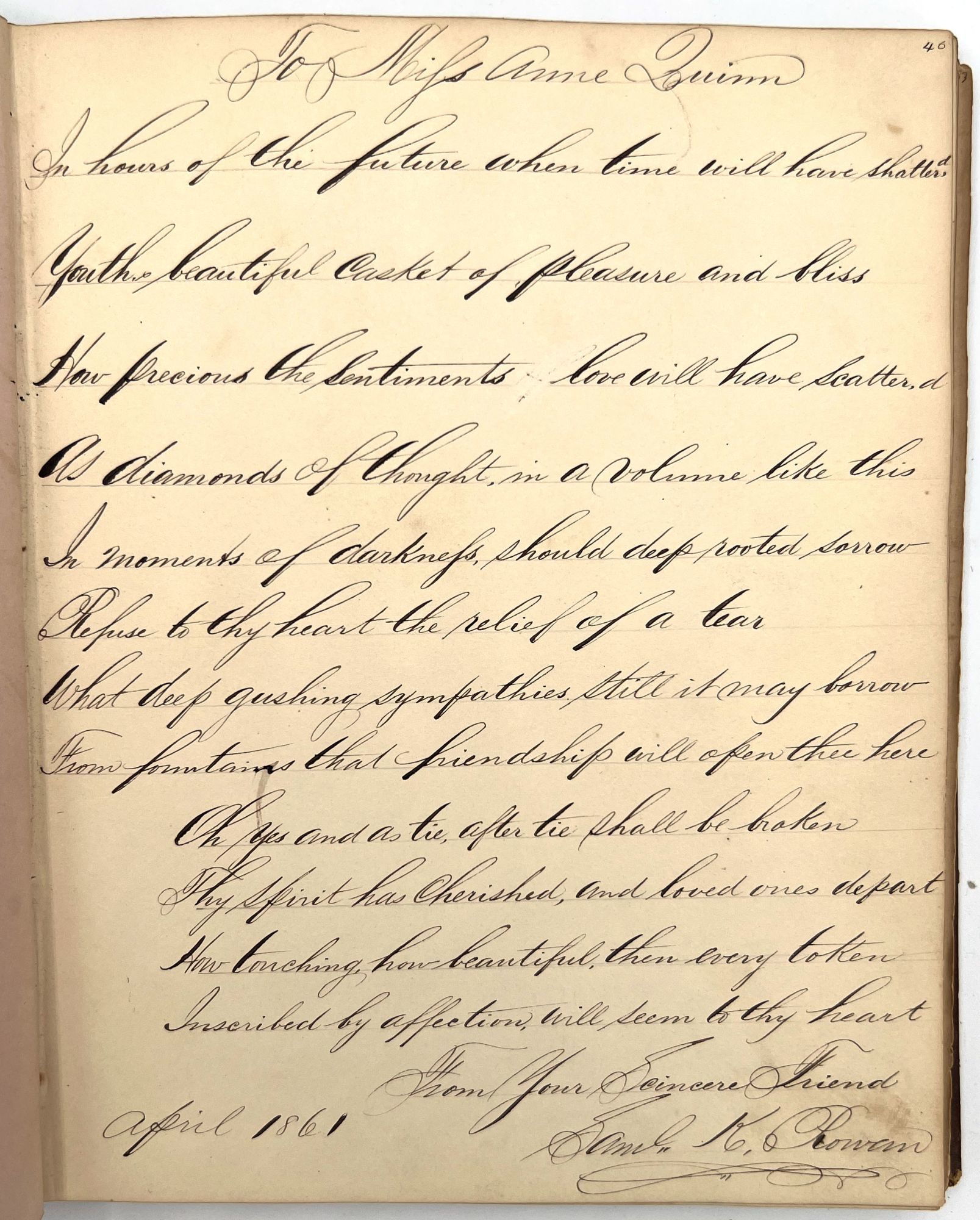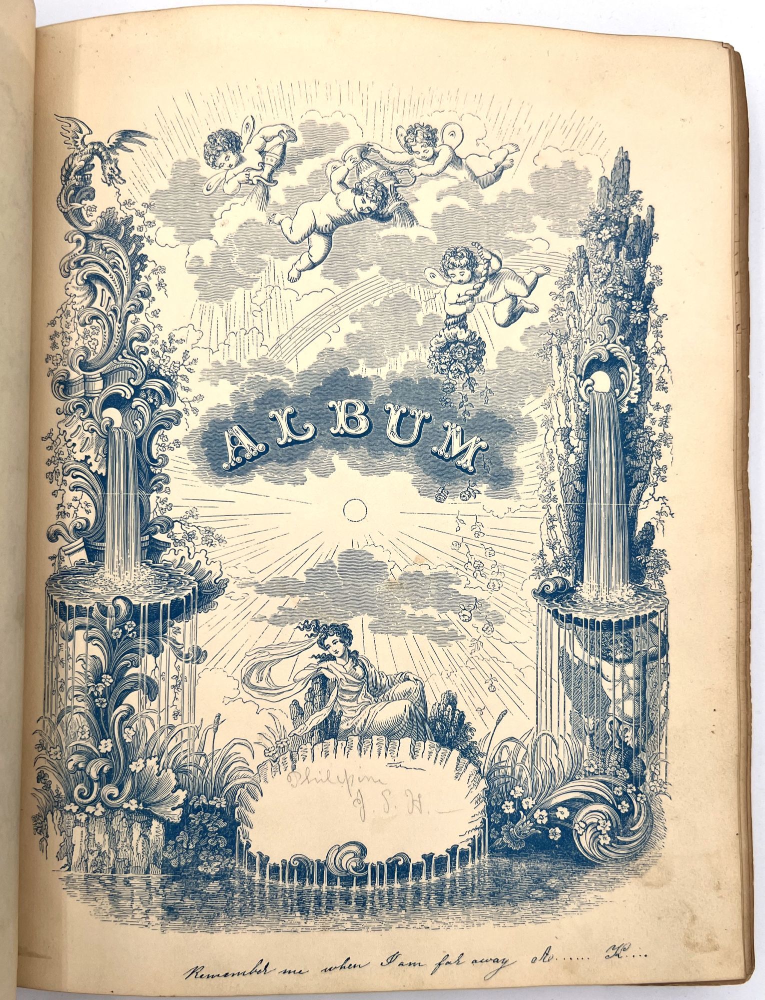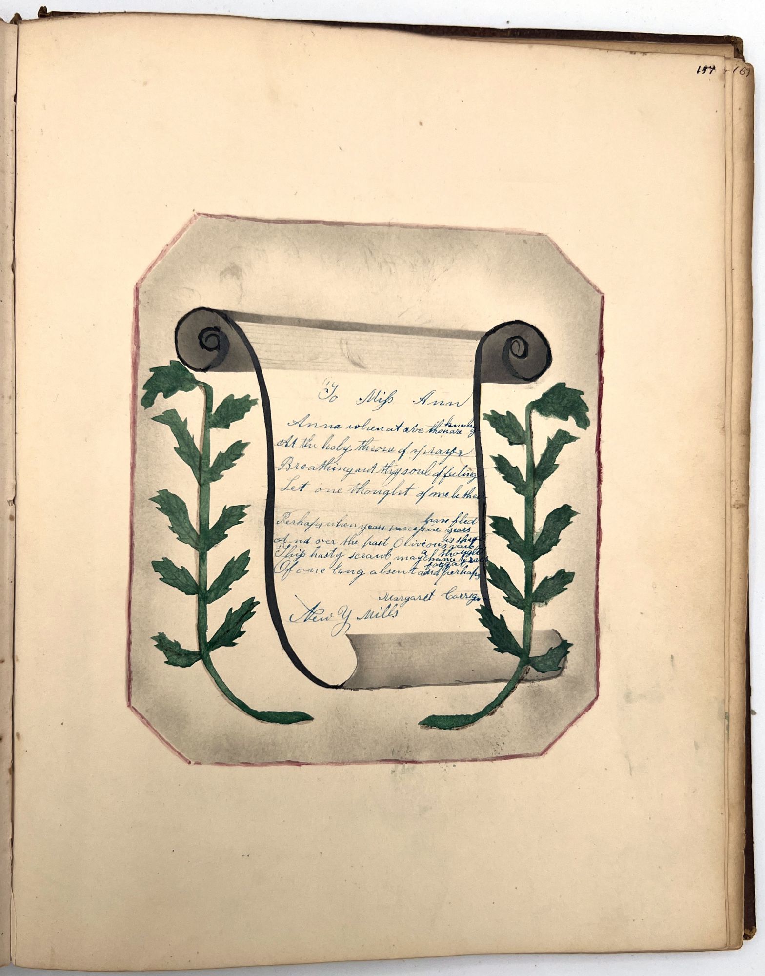 4to (9.5" by 7.5"), approx. 75 leaves, nearly all filled with ink poetry, artwork, etc., and including several steel engraved plates. Pencil signature of Anna Quinn to front free endpaper. Bound in original publisher's brown sheep stamped in blind and gold with Anna's name stamped in gilt on upper board underneath a gold lyre flanked by swans.