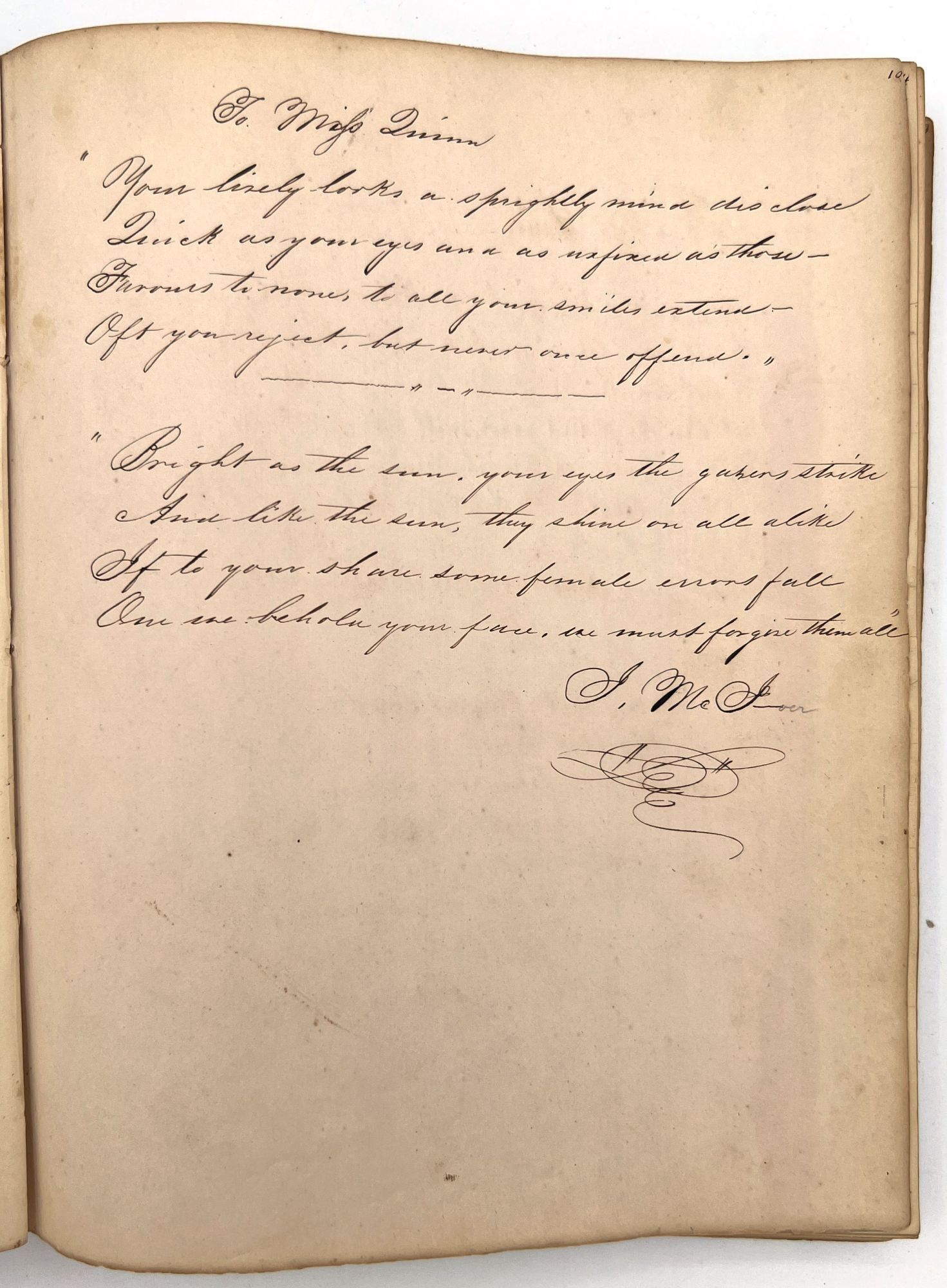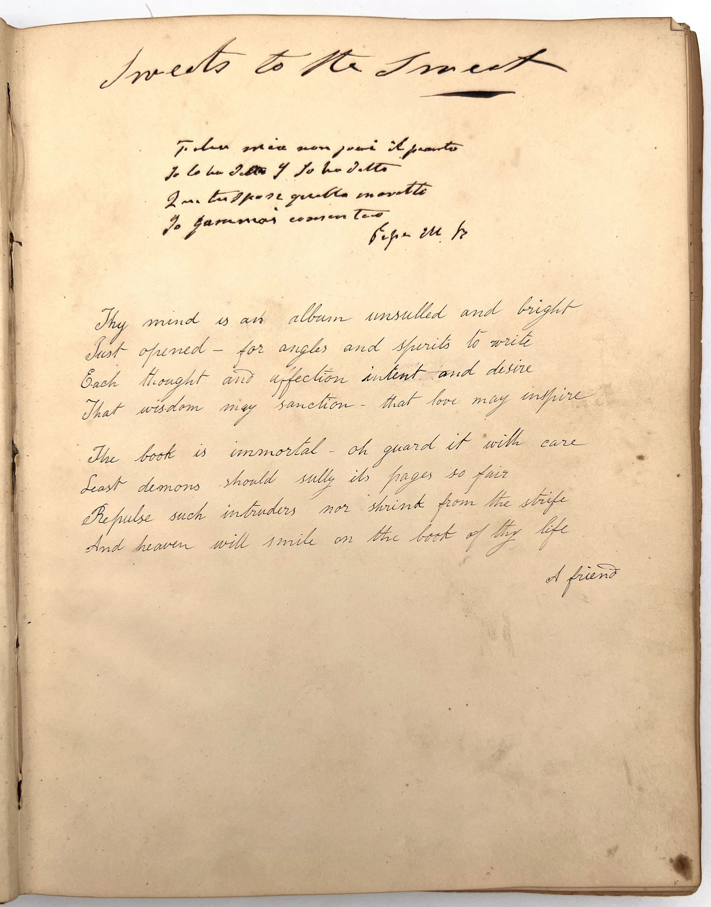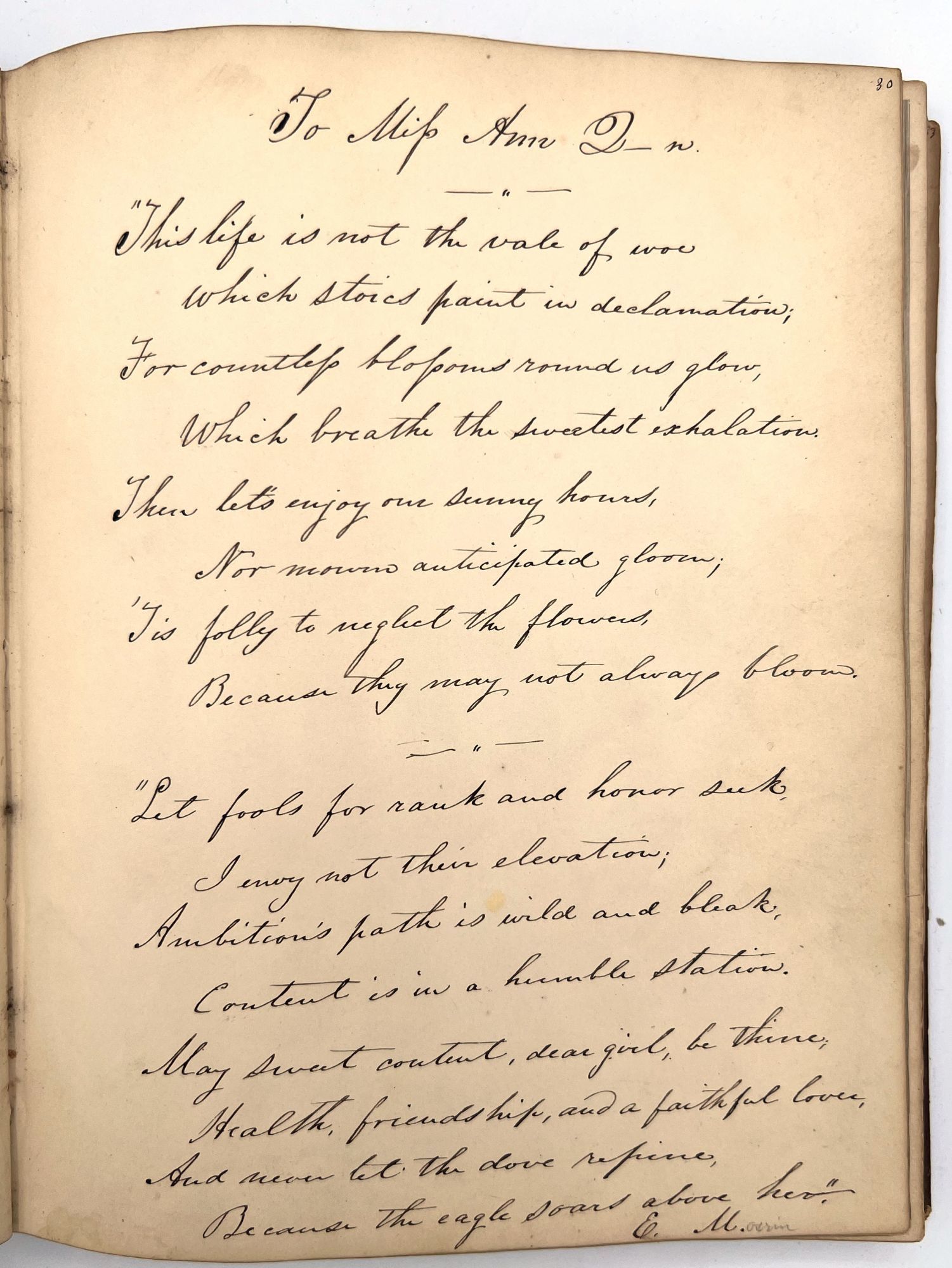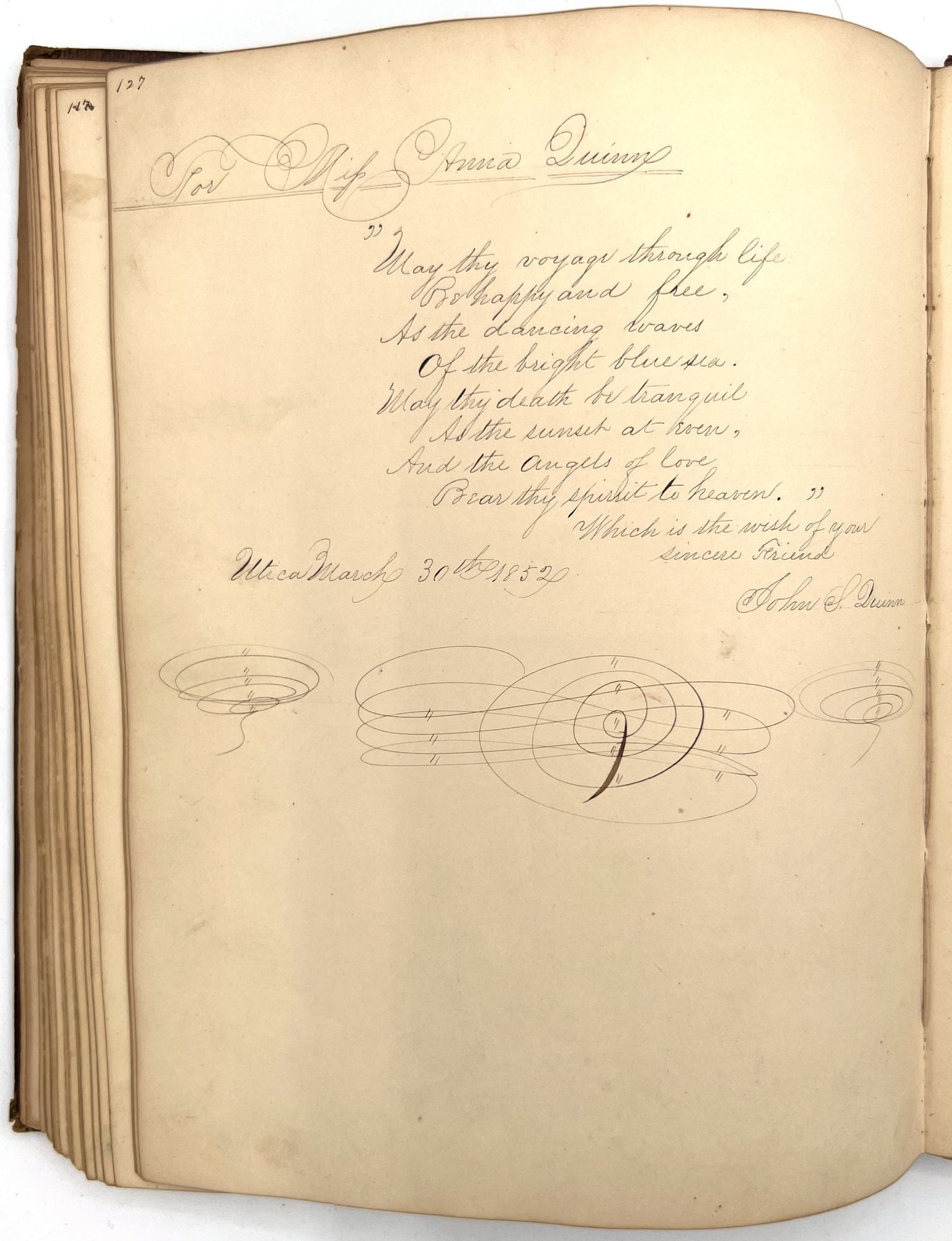 4to (9.5" by 7.5"), approx. 75 leaves, nearly all filled with ink poetry, artwork, etc., and including several steel engraved plates. Pencil signature of Anna Quinn to front free endpaper. Bound in original publisher's brown sheep stamped in blind and gold with Anna's name stamped in gilt on upper board underneath a gold lyre flanked by swans.