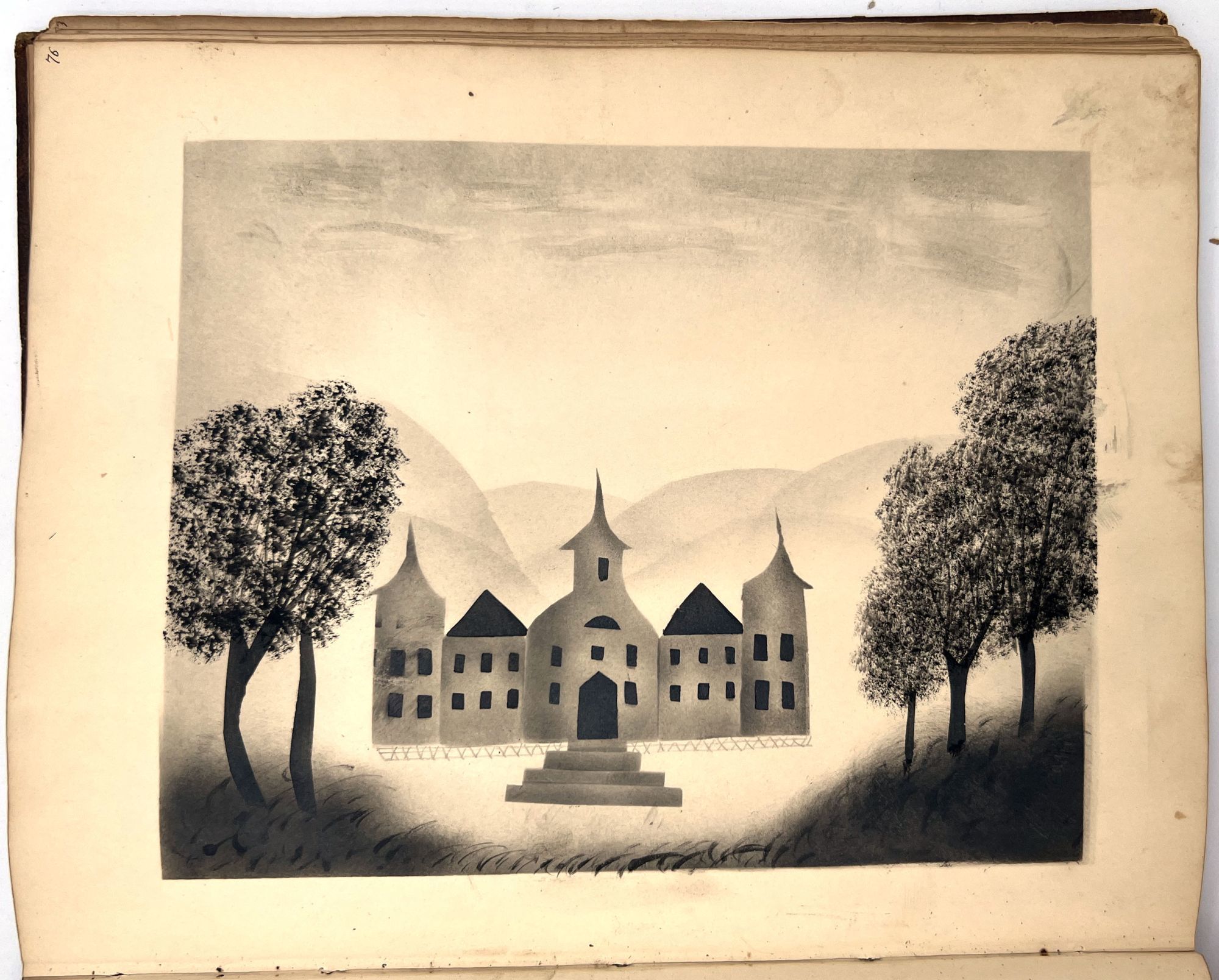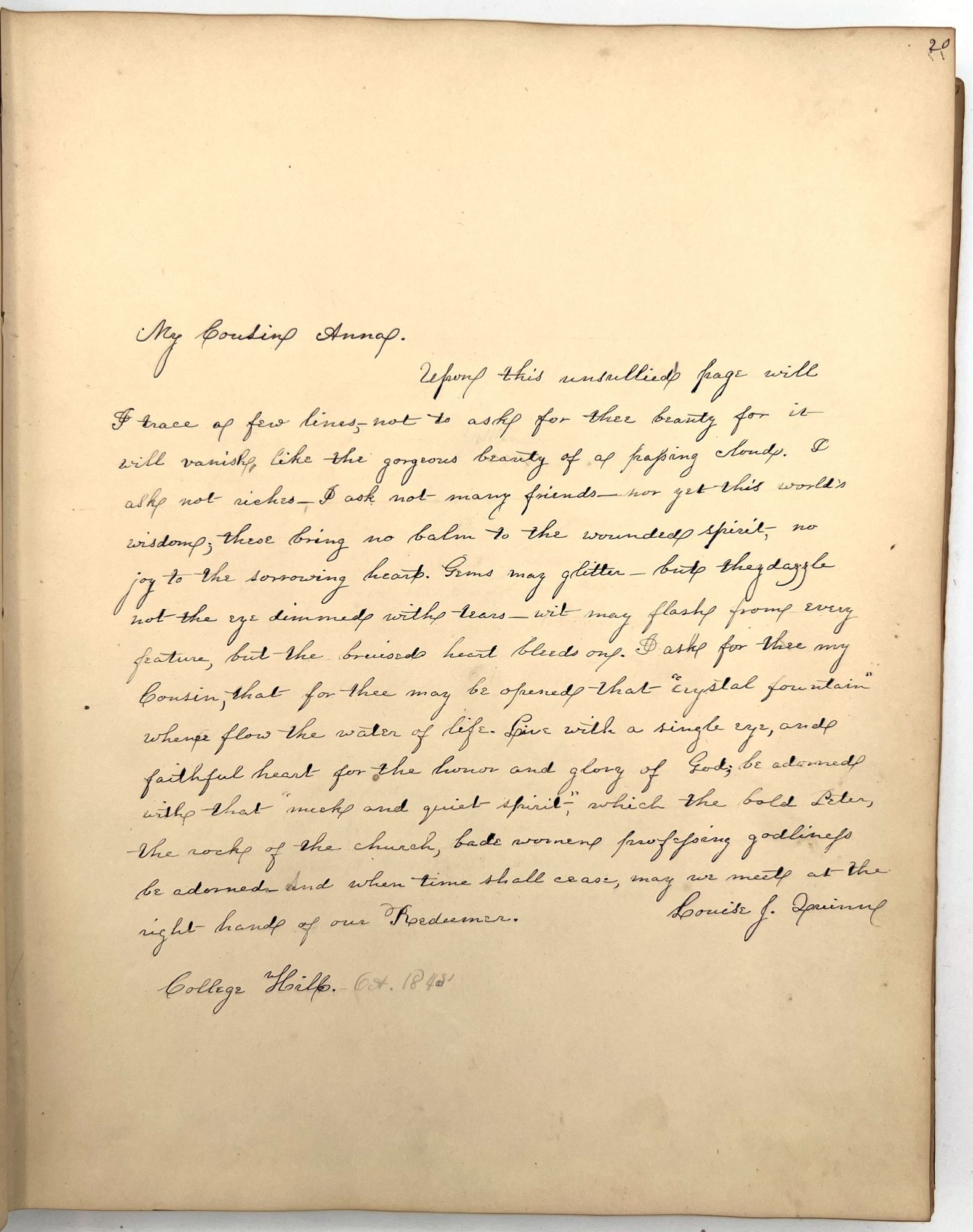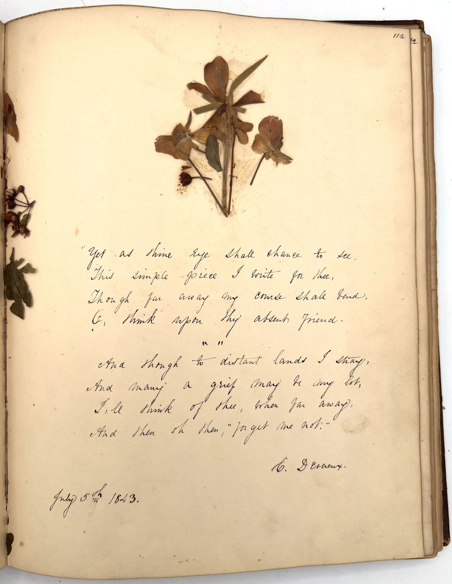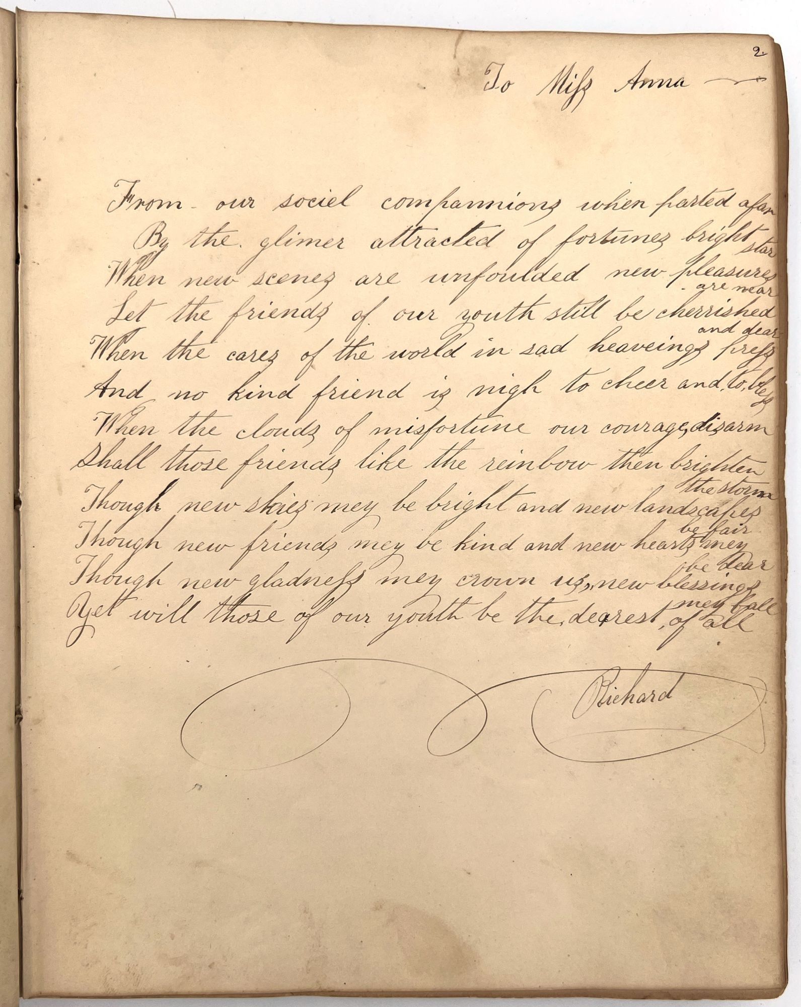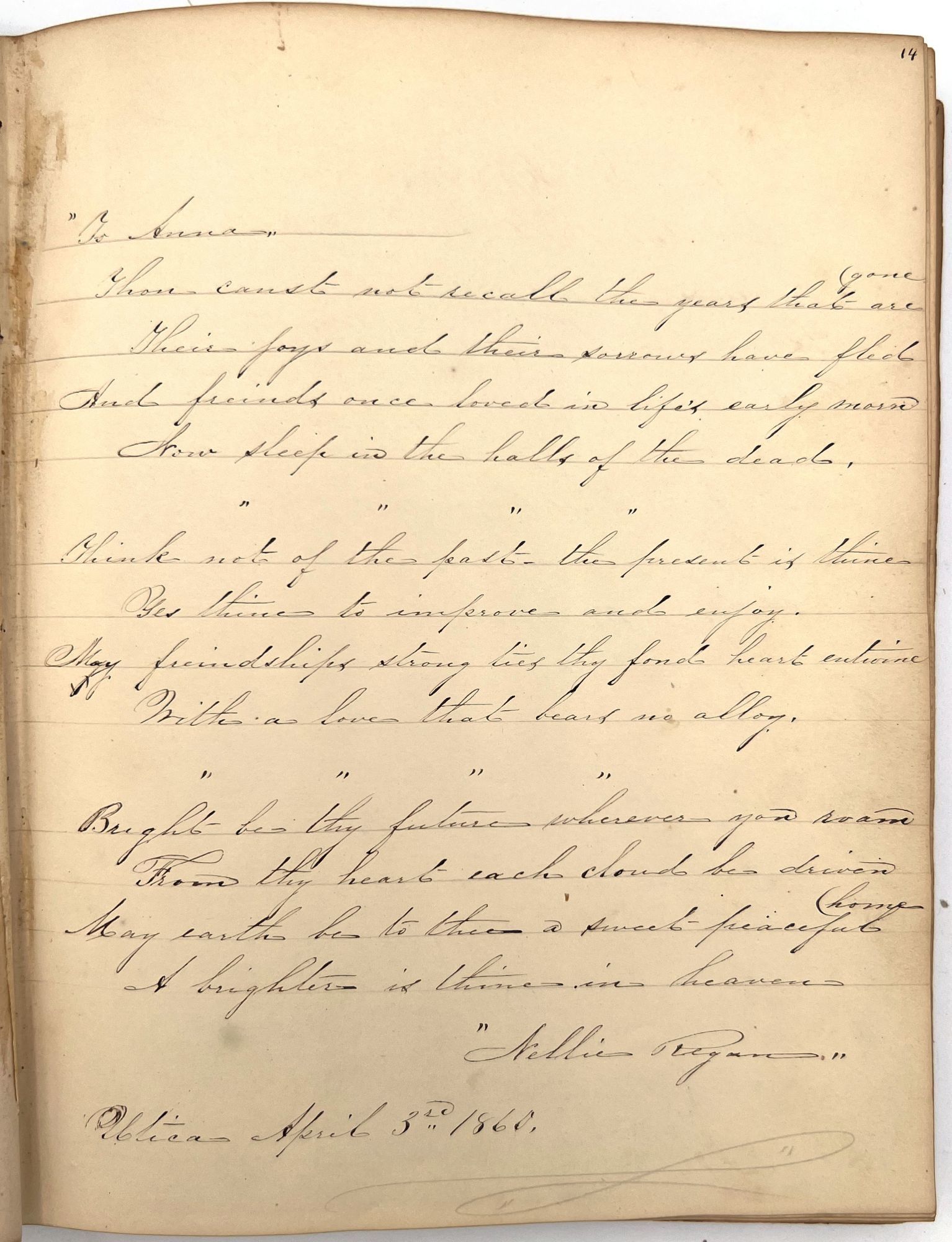 4to (9.5" by 7.5"), approx. 75 leaves, nearly all filled with ink poetry, artwork, etc., and including several steel engraved plates. Pencil signature of Anna Quinn to front free endpaper. Bound in original publisher's brown sheep stamped in blind and gold with Anna's name stamped in gilt on upper board underneath a gold lyre flanked by swans.