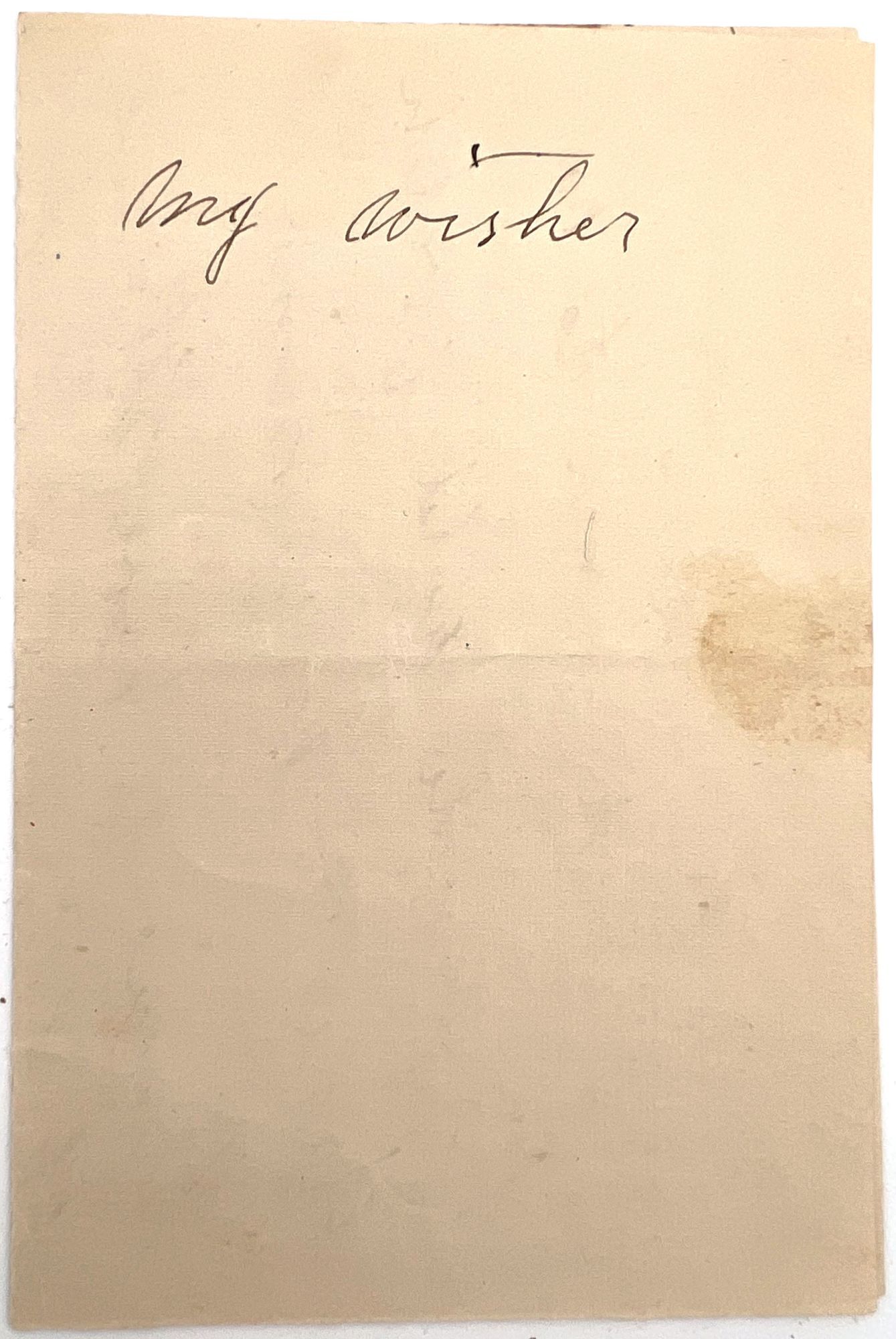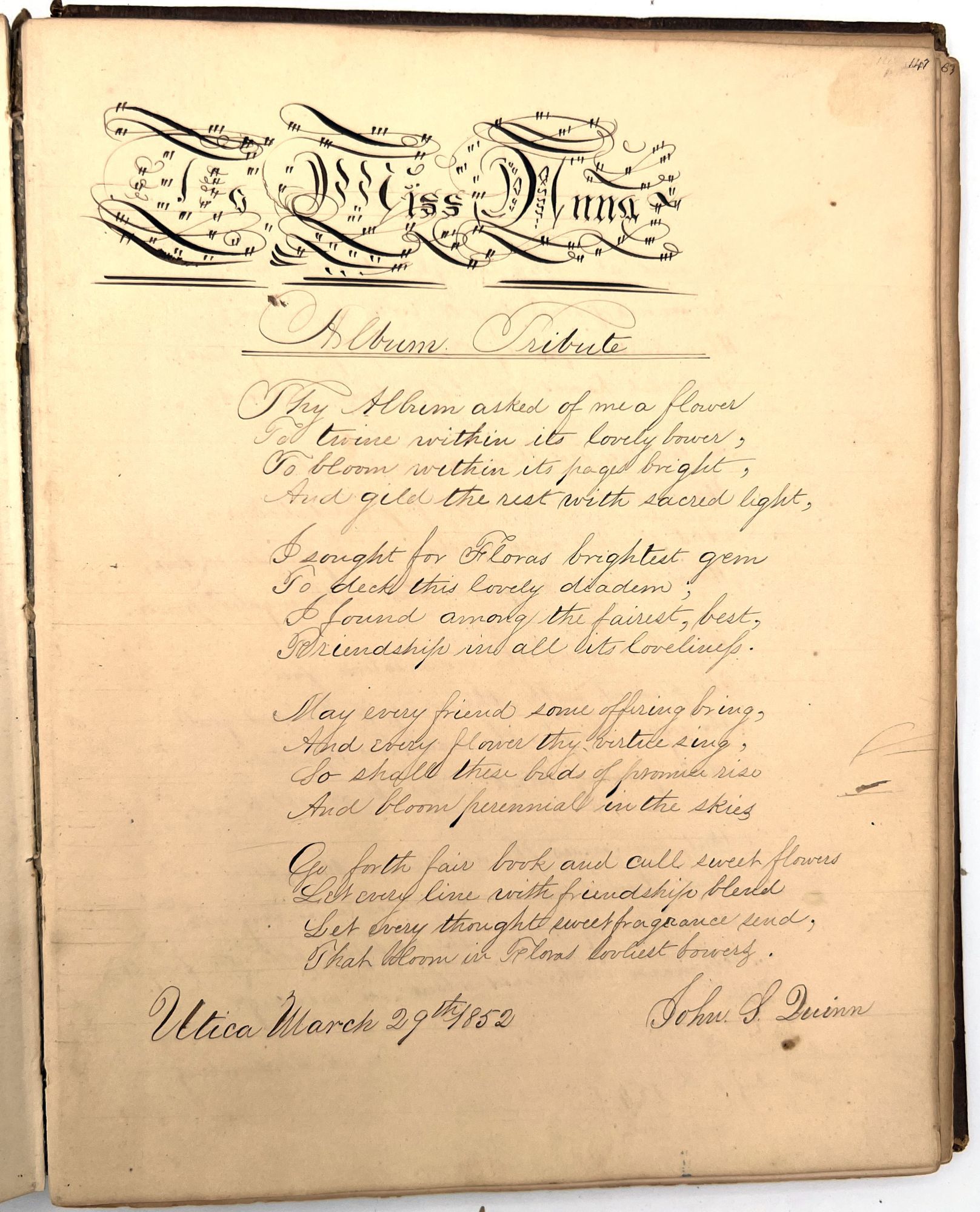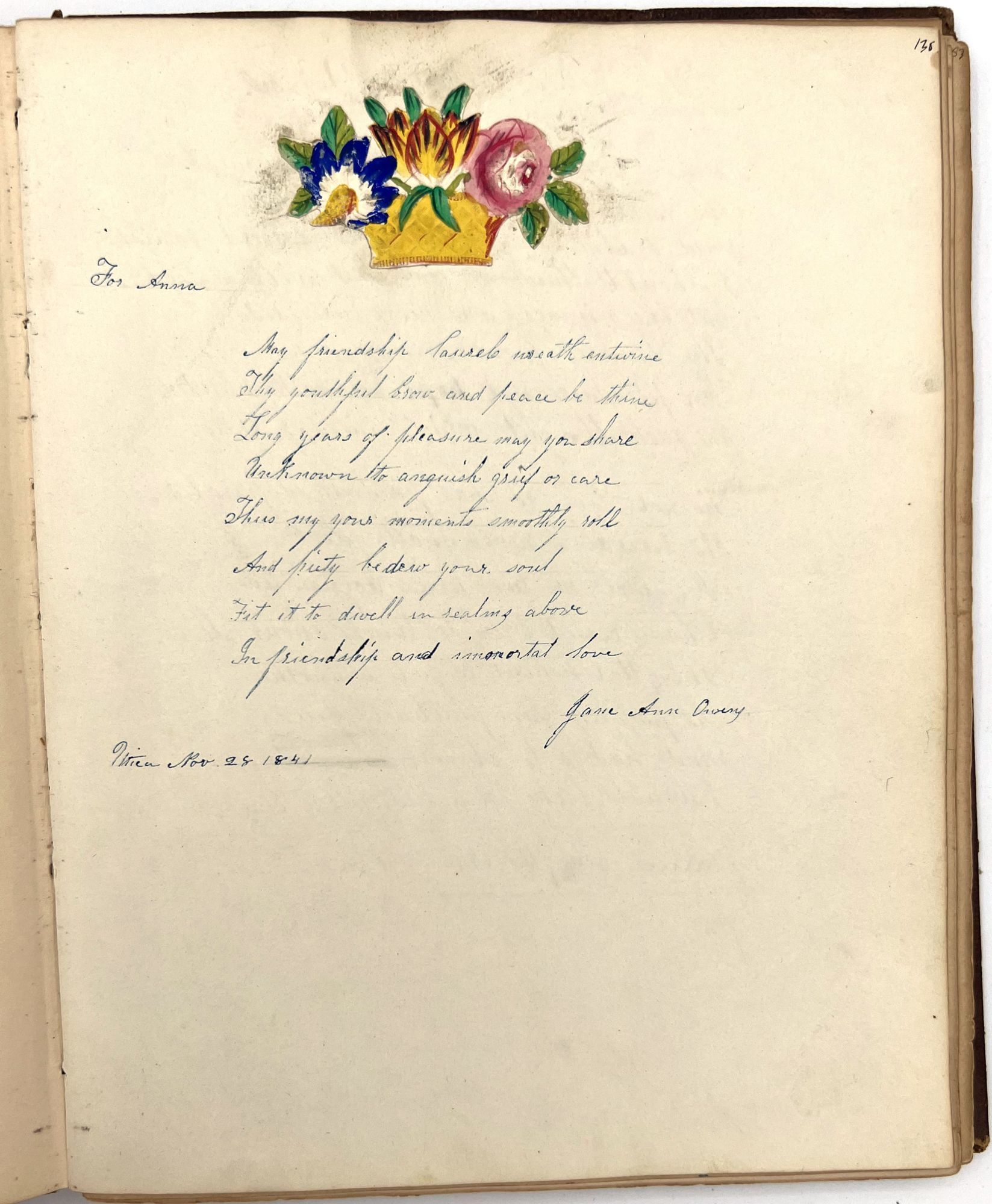 Utica, New York, 1861. Good. Text block a little shaken, hinges and joints cracked/split with a couple of leaves/gatherings loose. Spine becoming loose. Some dust and finger soiling with light toning. Extremities worn. Most/all tissue guards appear intact.. The friendship album of Miss. Anna Quinn (dates unknown) of Utica, New York, exceptional for its original artwork, calligraphy, and an enclosed holographic will (i.e. an informal will handwritten on a scrap of paper). Entries with artwork and poetry by friends, family, and acquaintances date from as early as 1841 and as late as 1861; most entries were located in Utica, but Auburn and Deerfield are also represented. There is original watercolor artwork and calligraphy, as well as one example of pressed flowers, and one small die-cut Victorian scrap of a basket of flowers. There are two examples of monochrome theorem stencil. An 1888 newspaper clipping from "The Catholic American" is loosely inserted in the front cover, along with a commemorative menu from a 1933 dinner celebrating the career of Utica Gas and Electric Company attorney Myron G. Bronner (1856-1941). Finally, a c.1880s holographic will has been loosely inserted in the front; it reads, "I wish Tom to have his uncle['s] gold watch Agnes to have mine Jennie to have the case of dishes of haverland[?] and Hattie to have aunt Rose['s] seal Jack and Rose to have a [?] gold piece in any little boxes in my trunk and the silver of aunt Rose divided between you all." There is no name or signature; it has been folded in half and labeled in ink "my wishes".