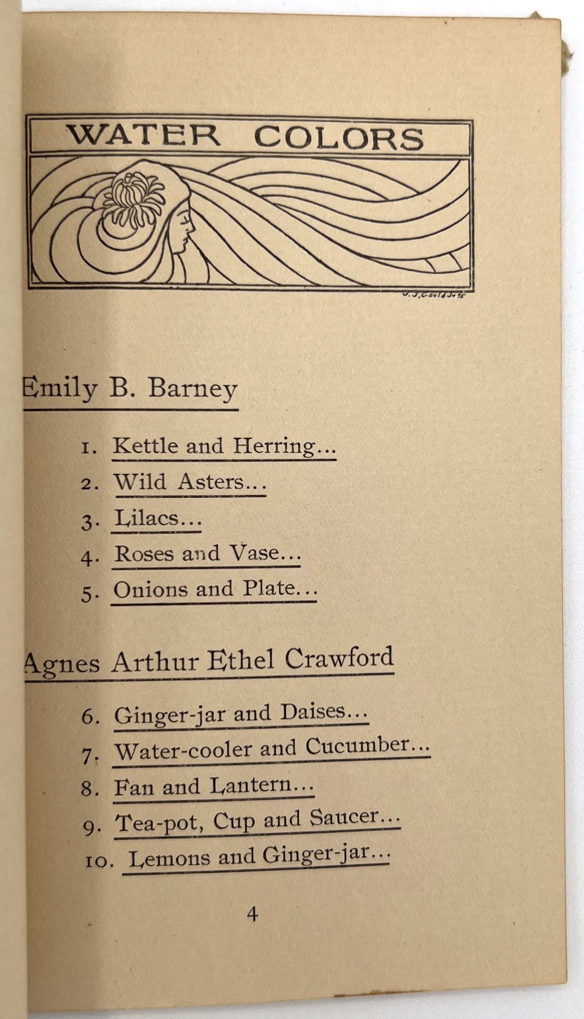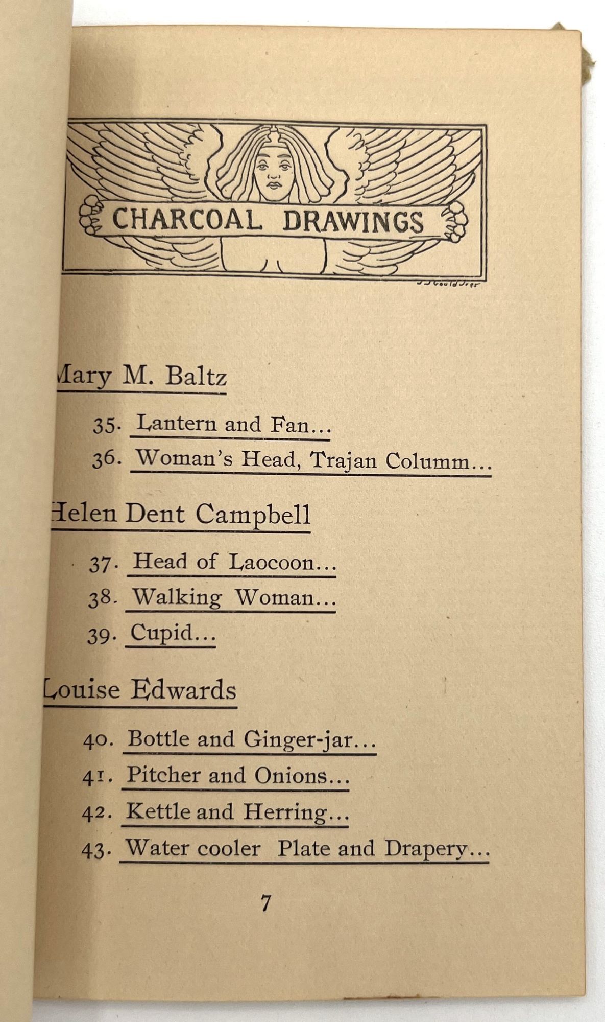 The present catalogue lists the names of twenty-nine (29) of Dillaye's students, all women, and the works they exhibited, divided into the following categories: Water Colors; Charcoal Drawings; Pencil Sketches; and Primary Class (i.e. advanced students).