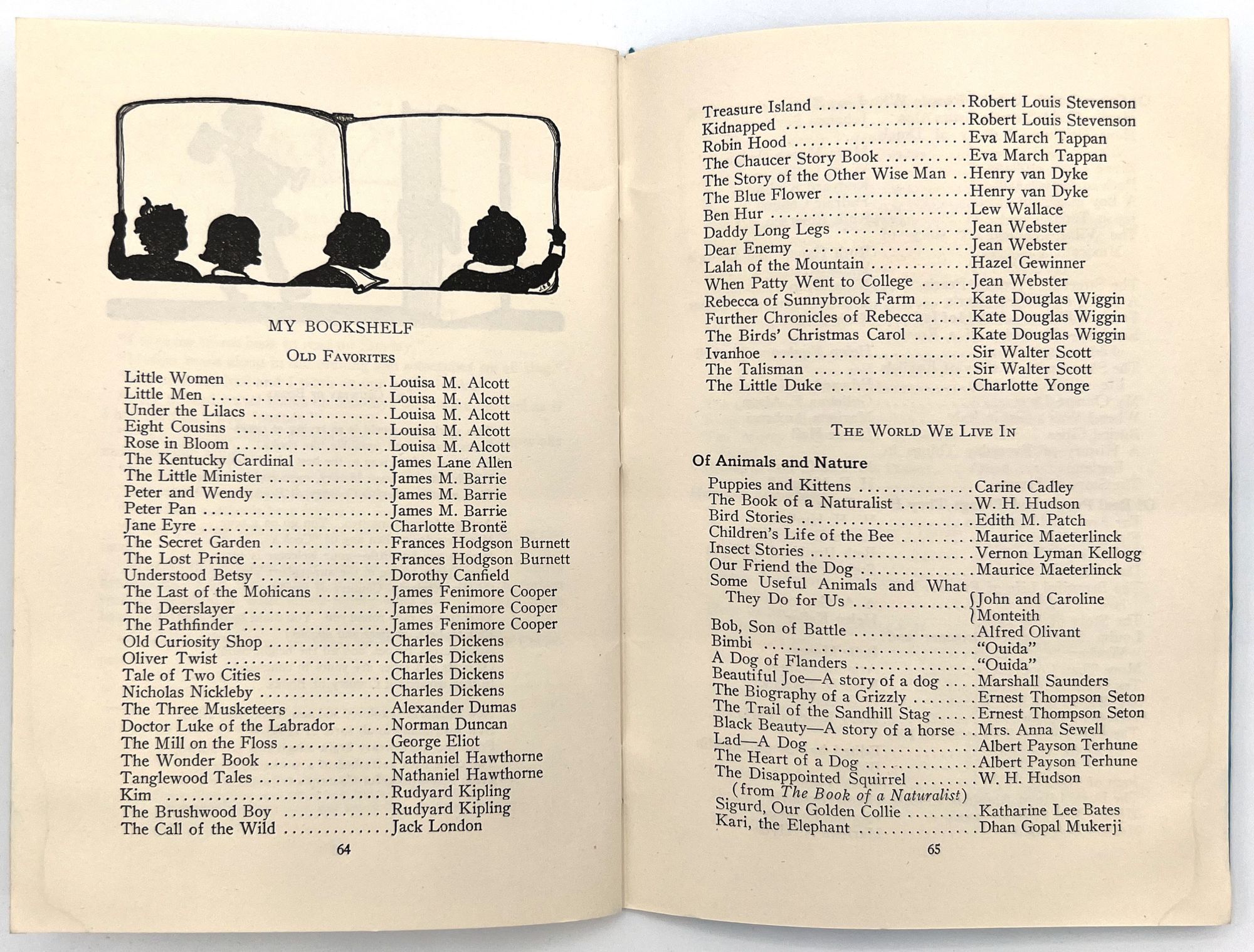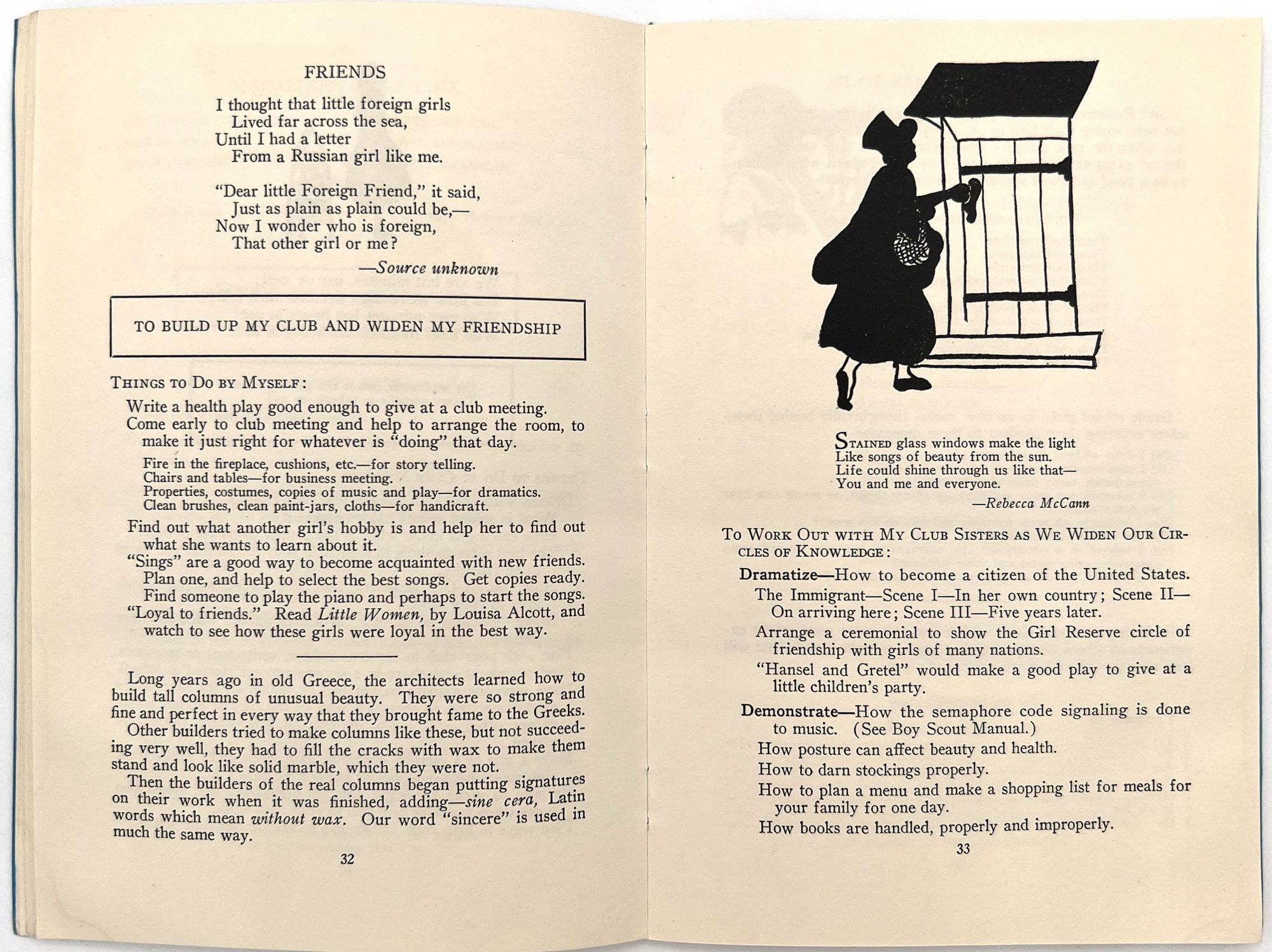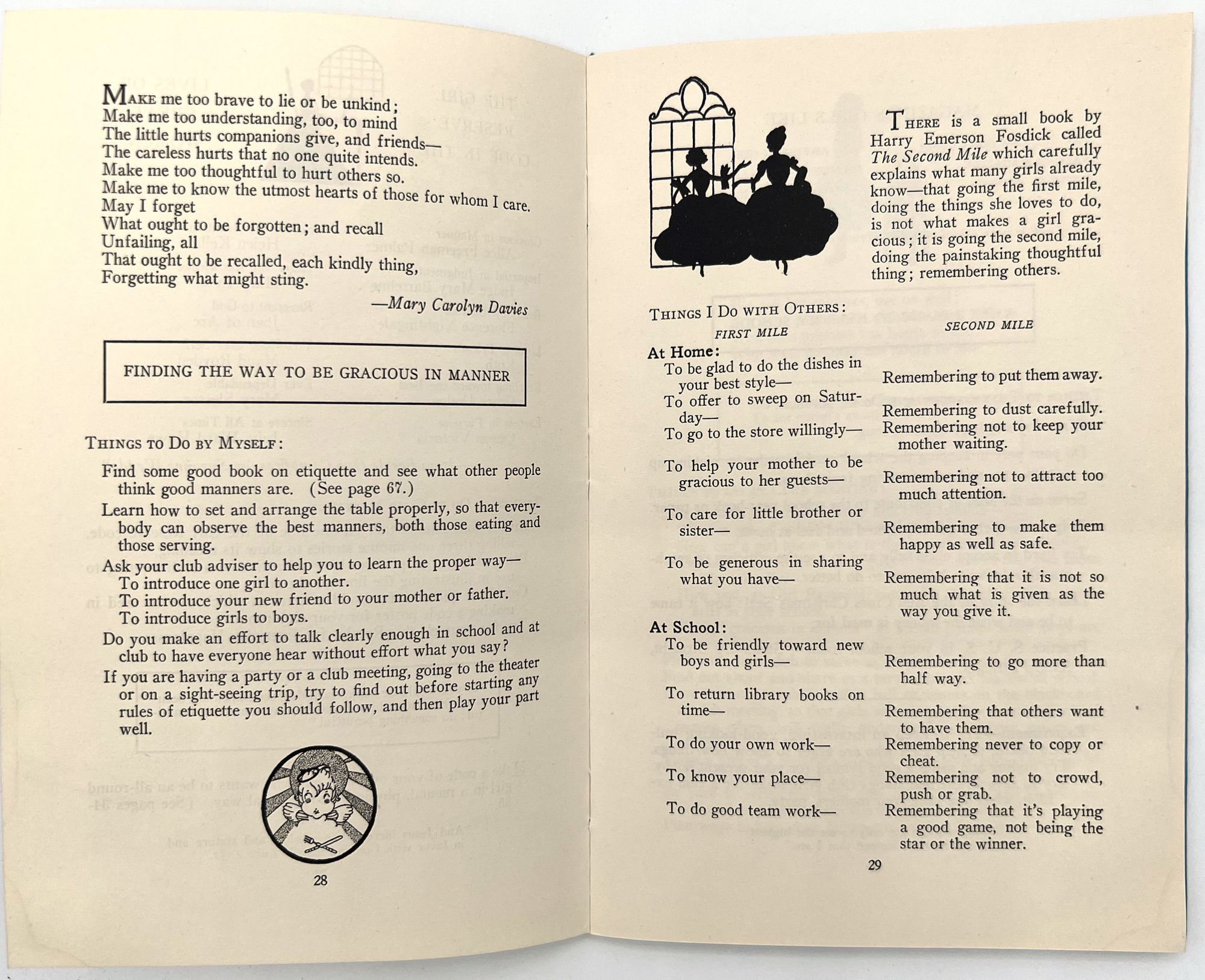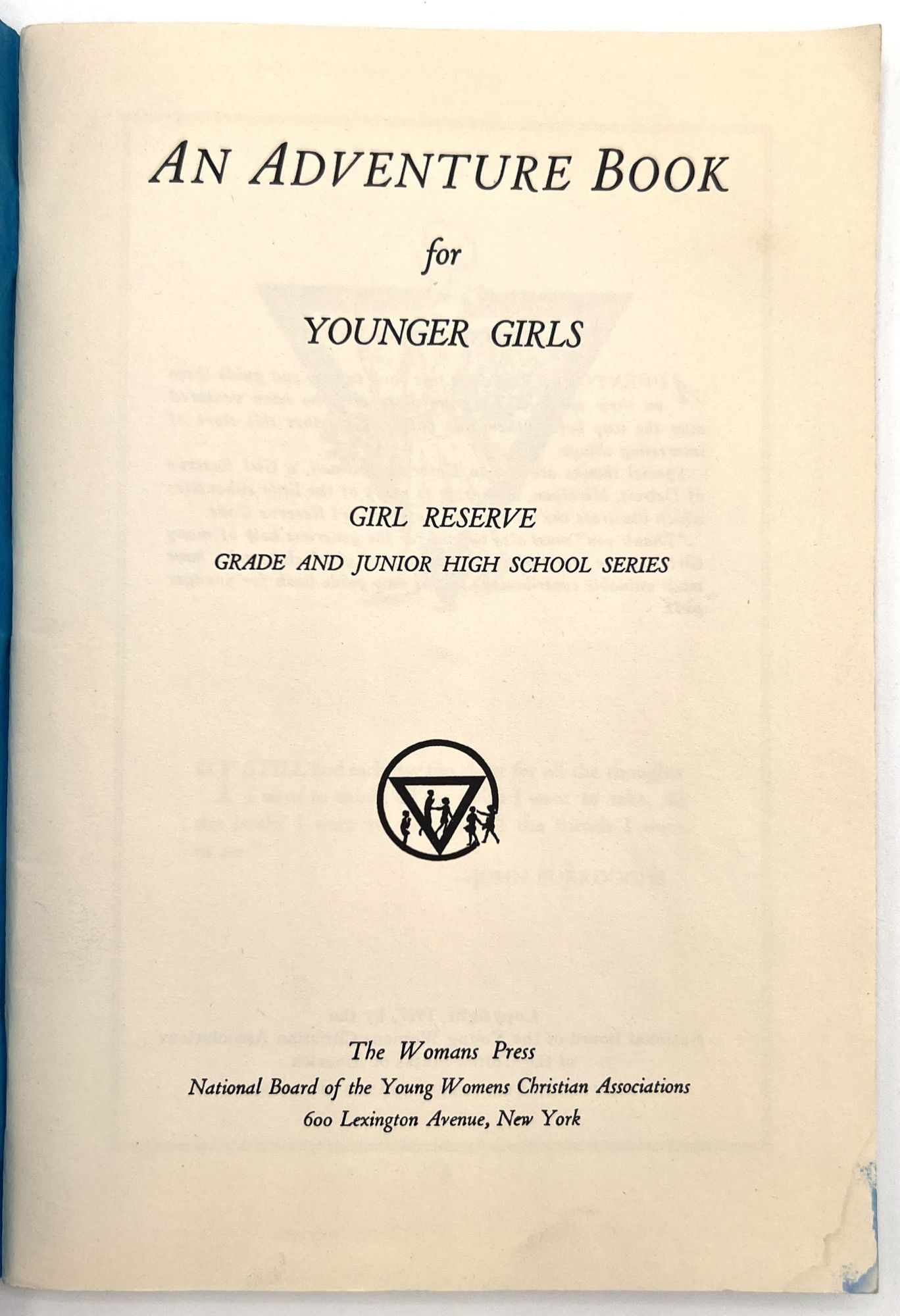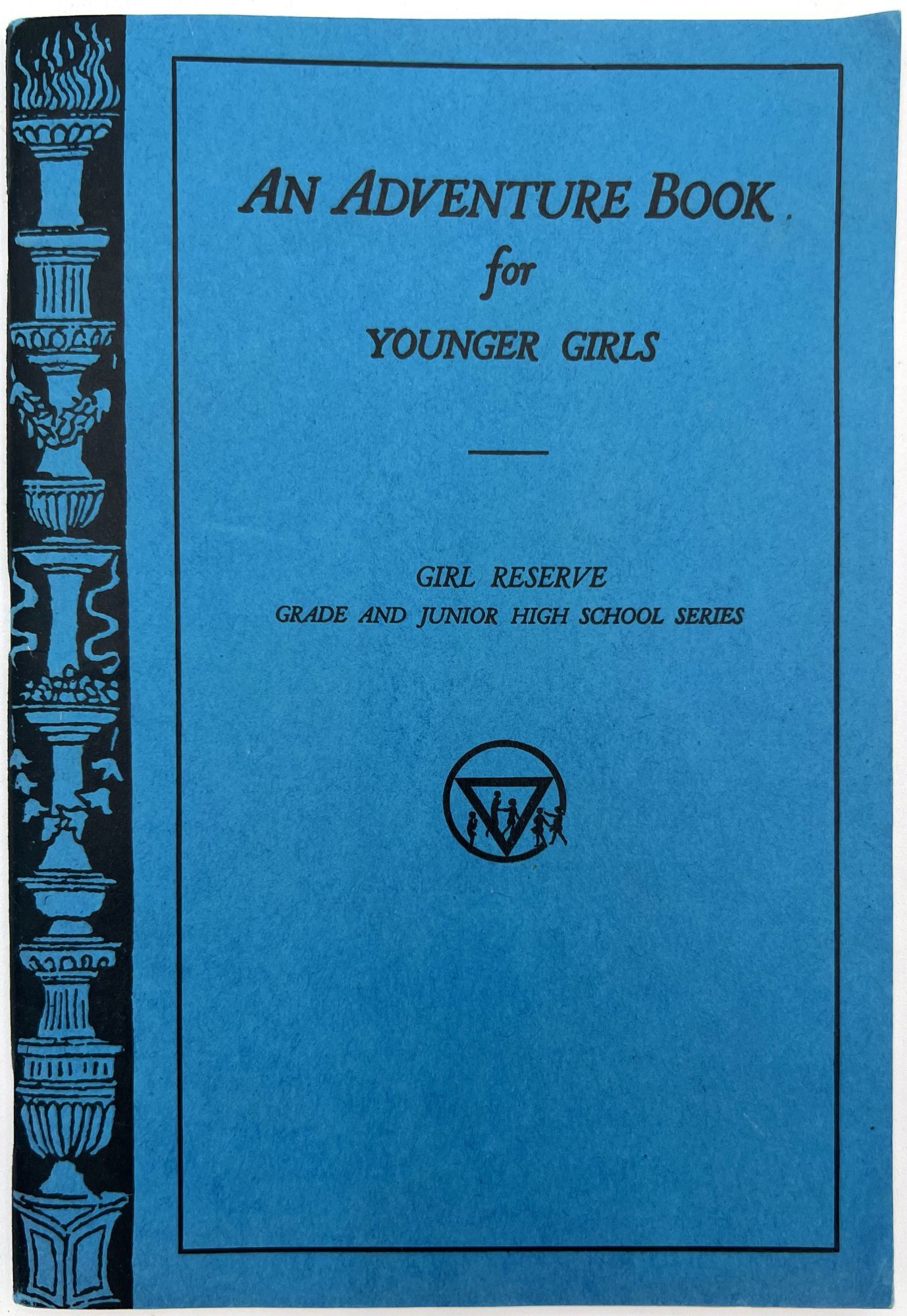 "An Adventure Book for Younger Girls." New York: The Womans Press, 1927. 8vo (7.75" by 5.25"), pp. 70, [2], with in-text illustrations, stapled in original bright blue printed wrappers. A book for young members of the Girl Reserves, "to help and guide them on their way" (p. [2]). Includes extensive list of ideas for activities, recipes, poems, lists of books to read (Frances Hodgson Burnett appears to be a favorite), tips for organizing clubs and having "a Good Business Meeting", lists of hobbies, songs, games, and more.