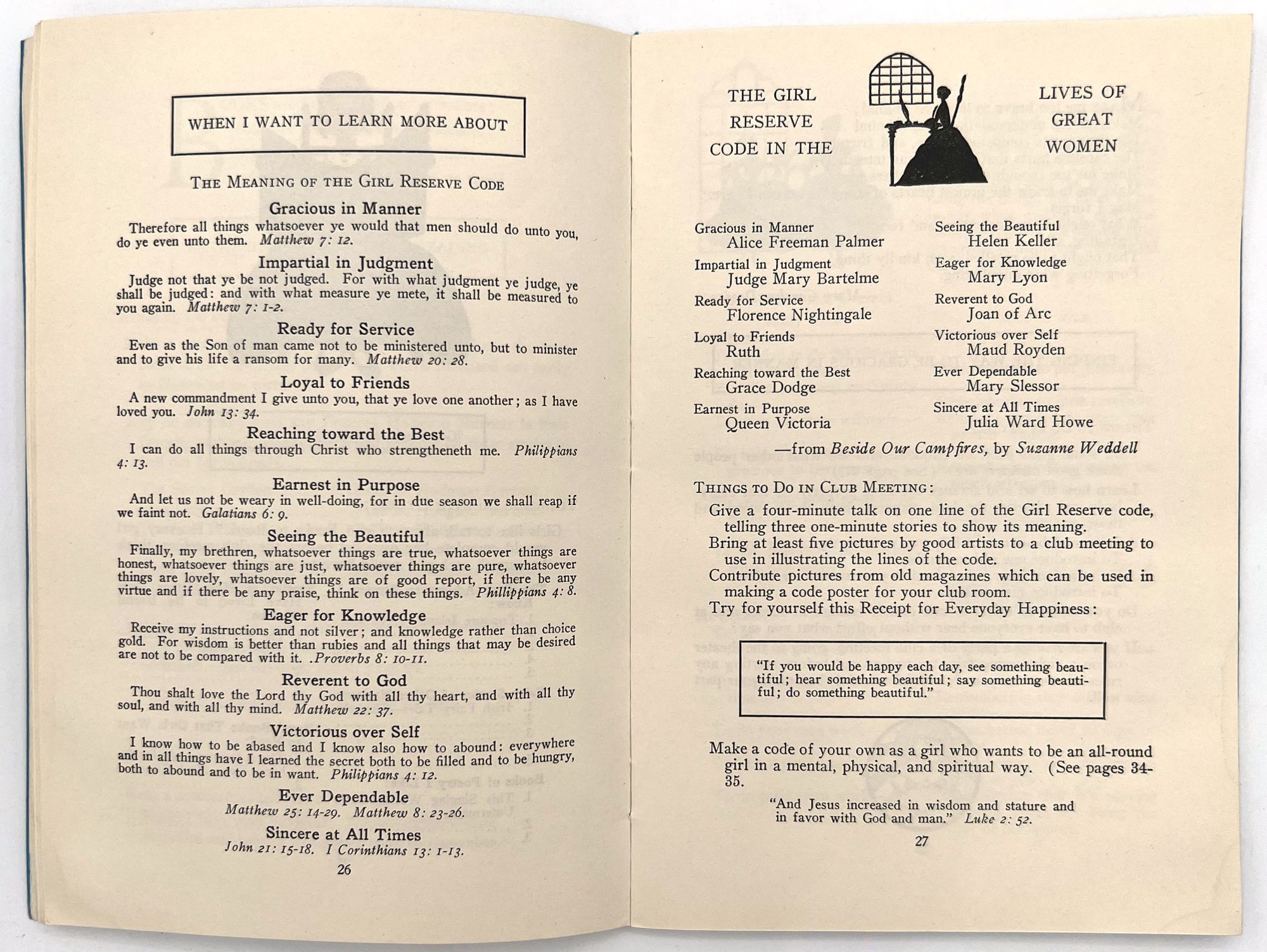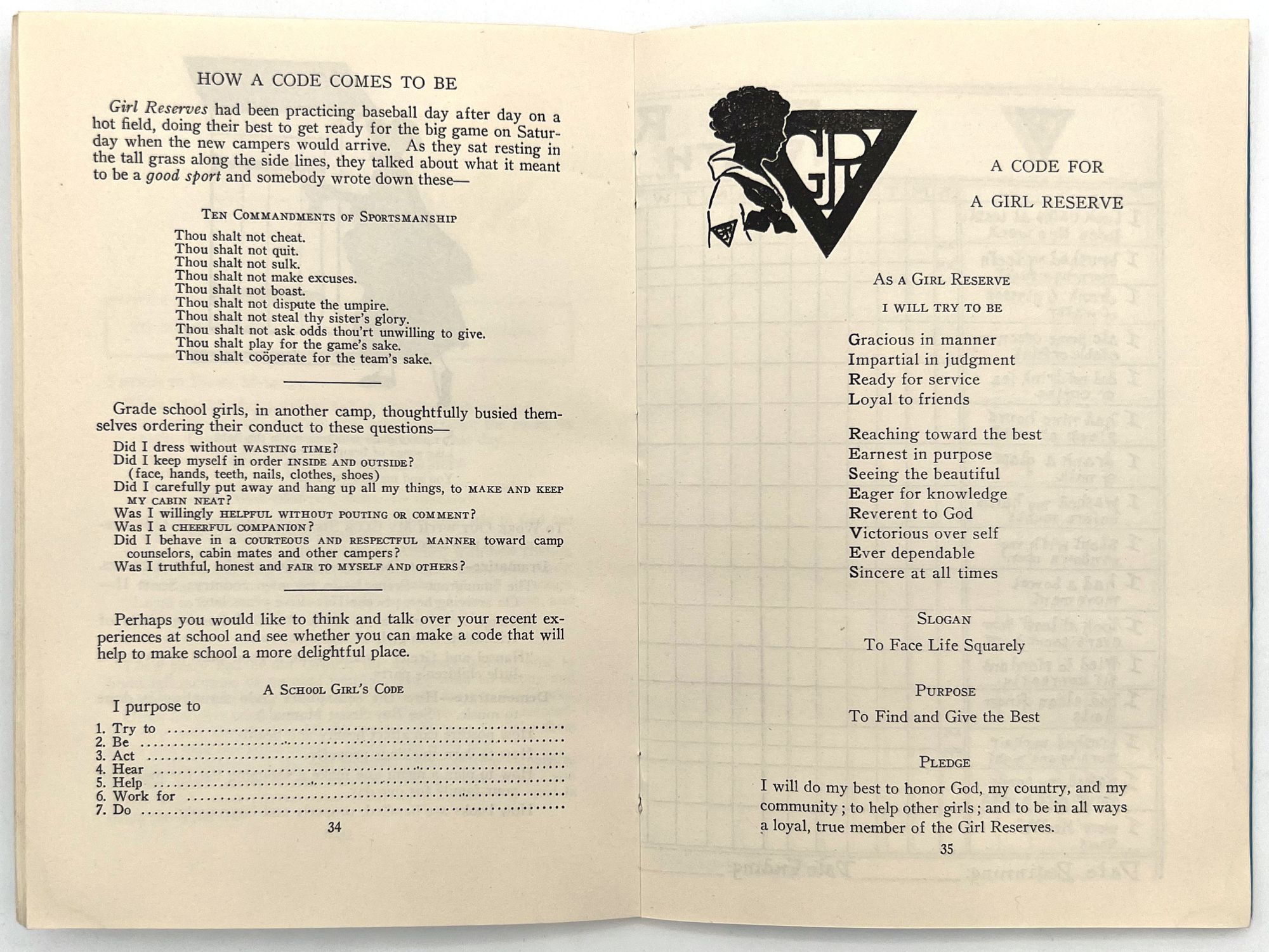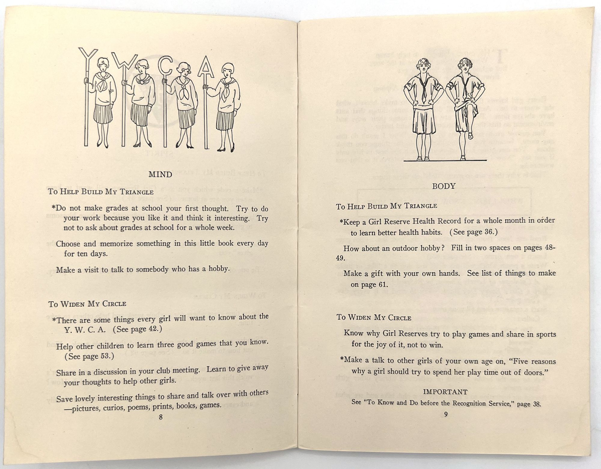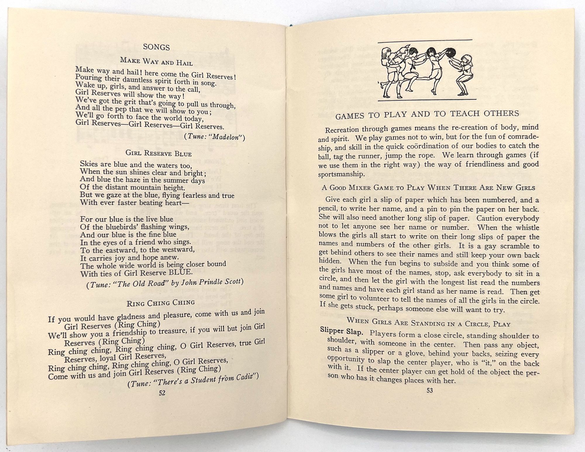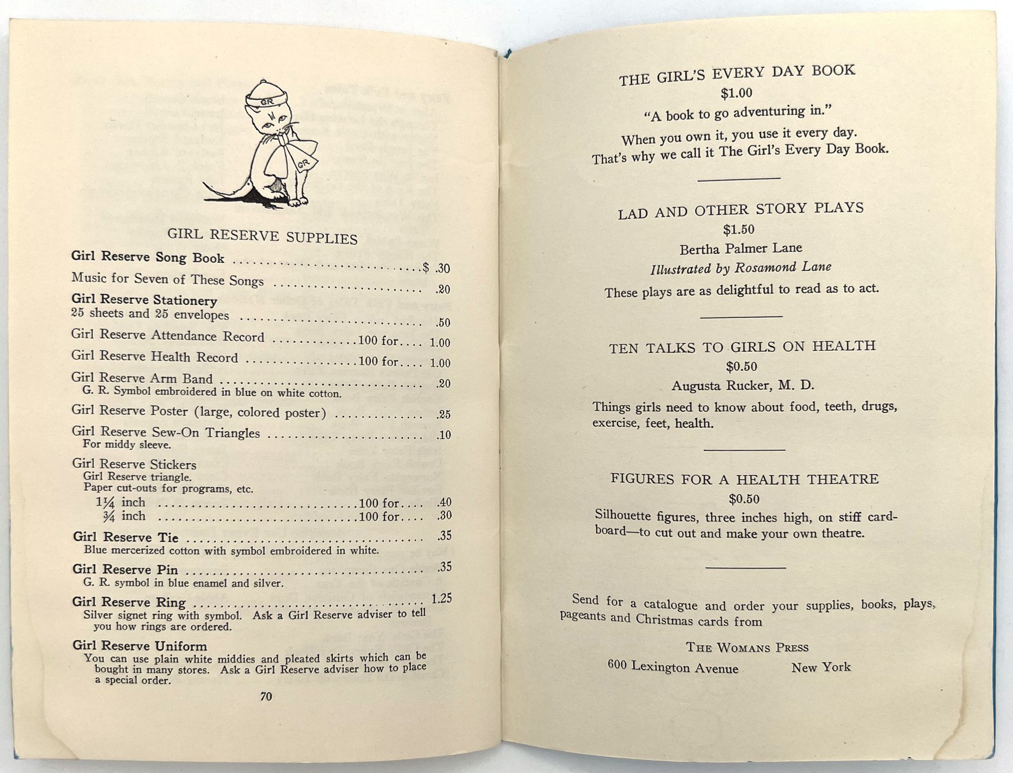 New York, 1927. Very good to near-fine. Light toning, minor water stains.. Two (2) items relating to the Girl Reserves, a nation-wide program initiated in 1918 by the Y.W.C.A. to help girls to grow and develop essential social and life skills in the face of the first World War. The program provided a safe space for young girls and women, emphasizing the importance of personal and social responsibility. It was most popular in the 1920s and 1930s, but was active for many decades after. The items include: