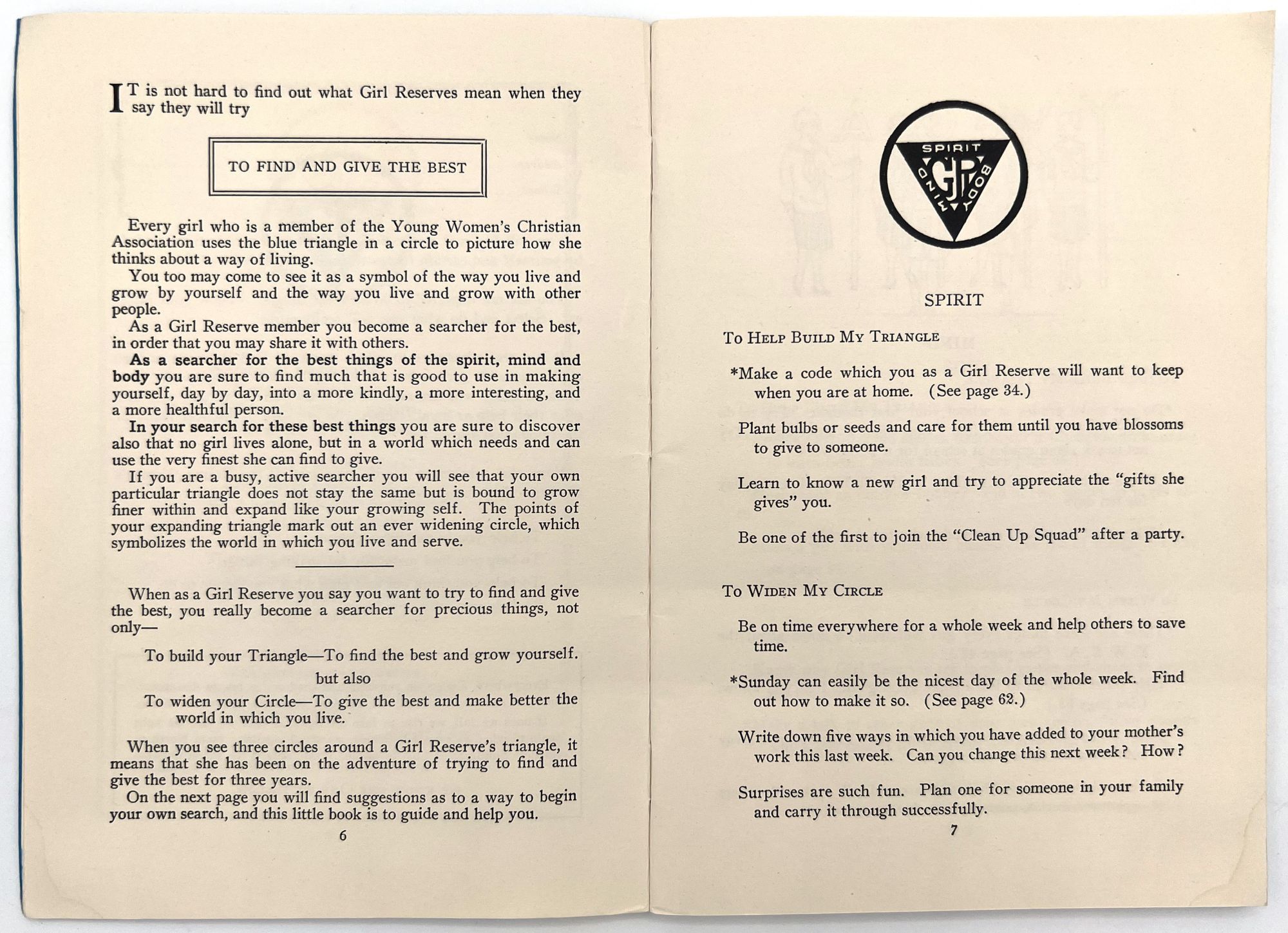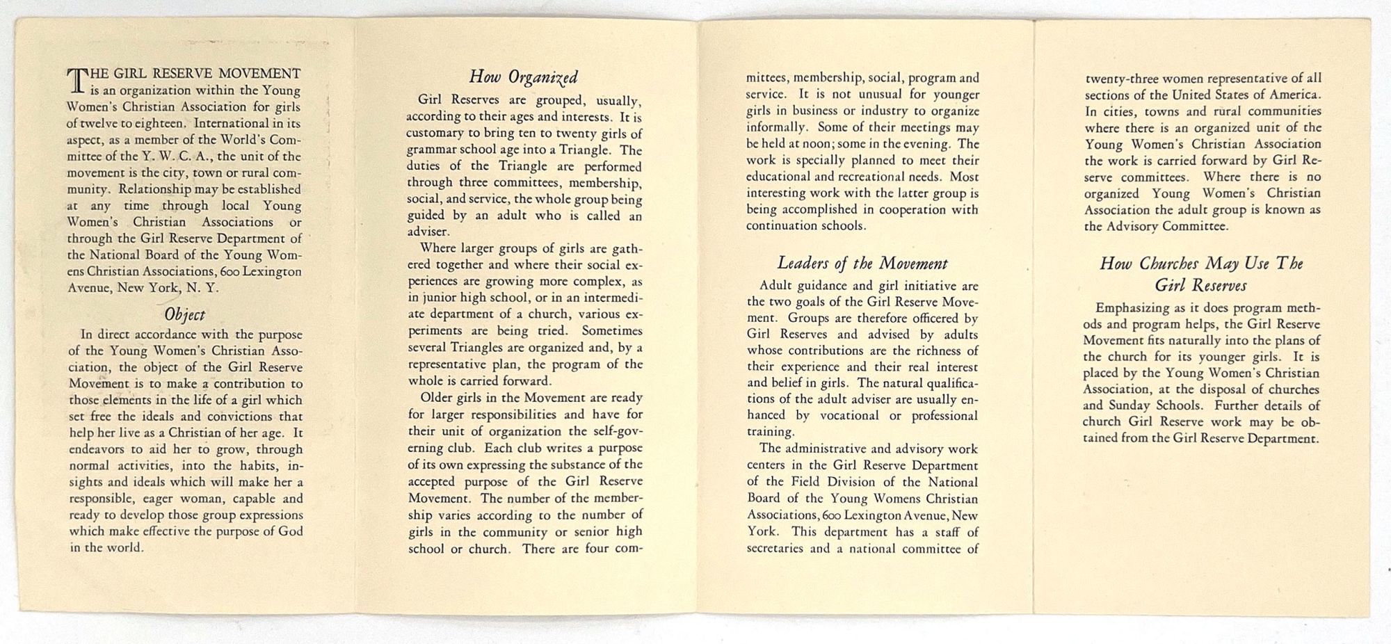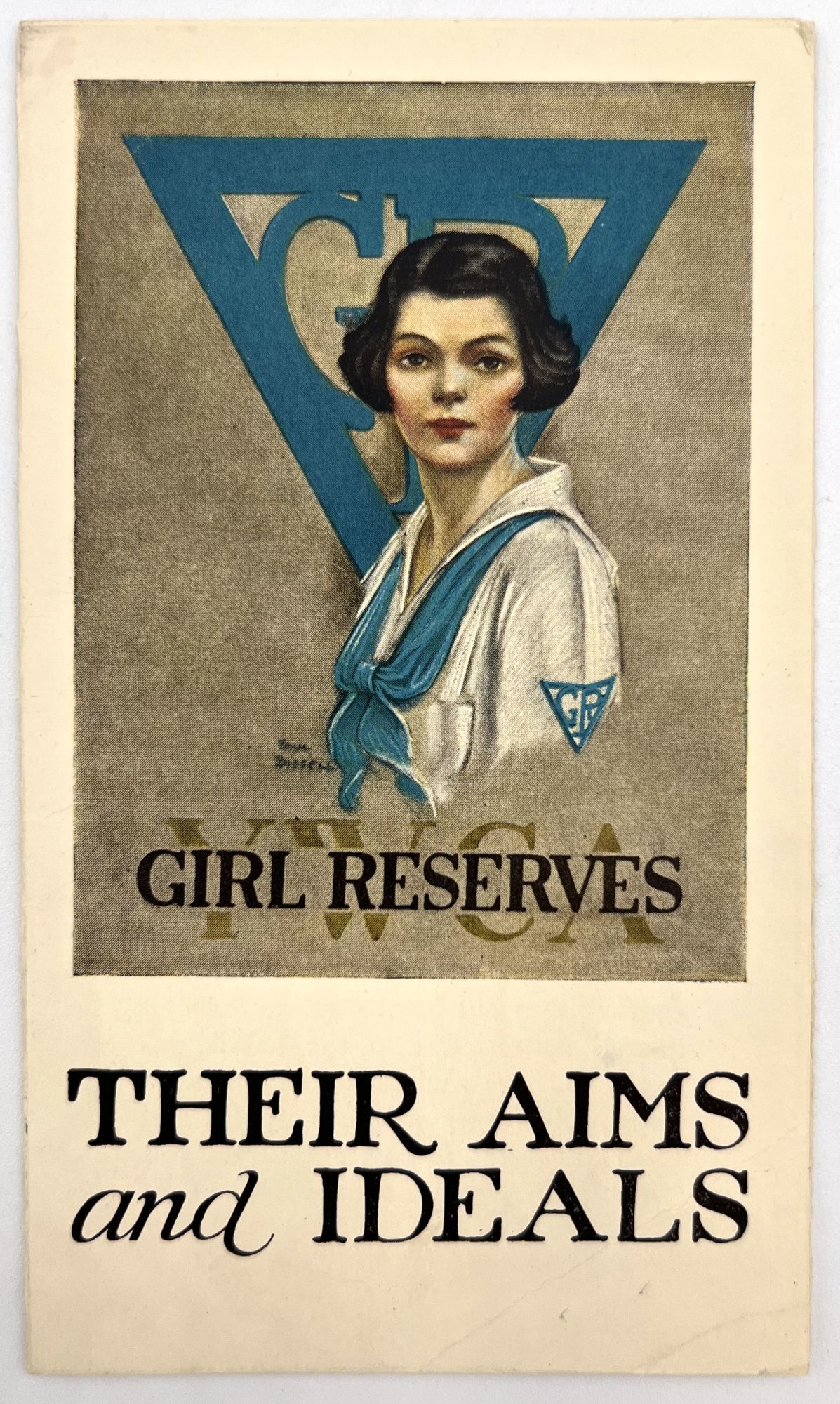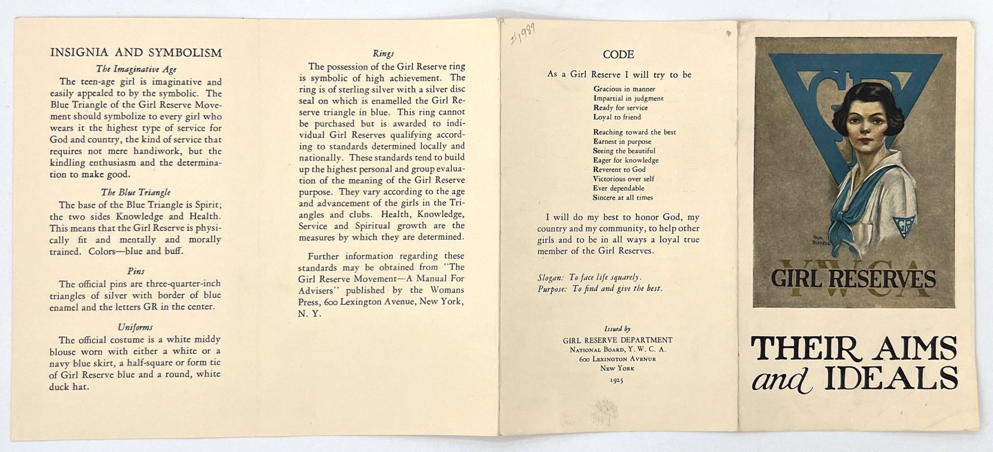 "Girl Reserves: Their Aims and Ideals". New York: Girl Reserve Department, 1925. Four-fold pamphlet (3.5" by 6" closed), color-illustrated with image of a Girl Reserves member on front. Gives a general overview of the organization for the interested public, with an emphasis on their mission and aims. Lists their slogan, "To face life squarely", and their purpose, "To find and give the best."