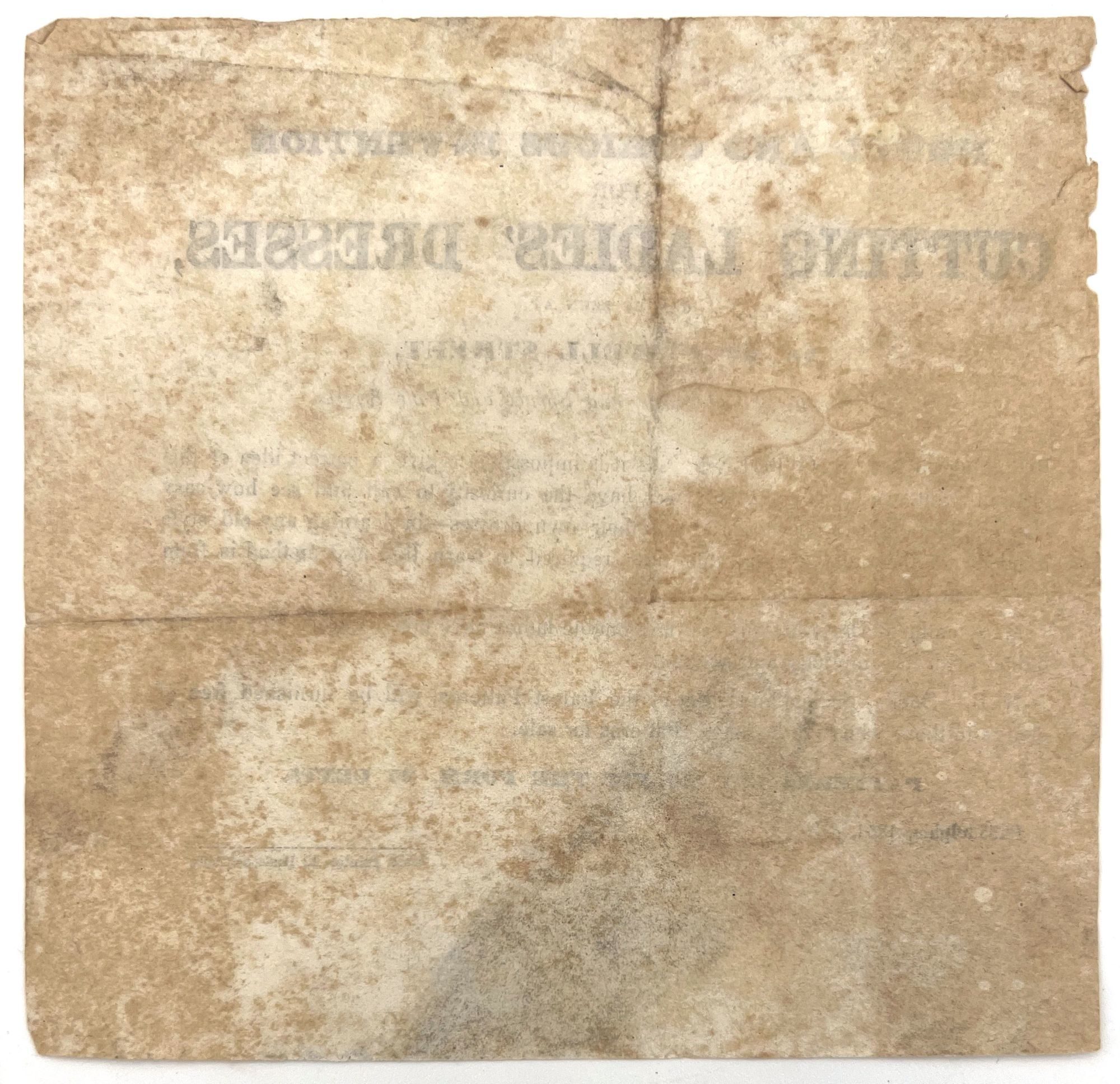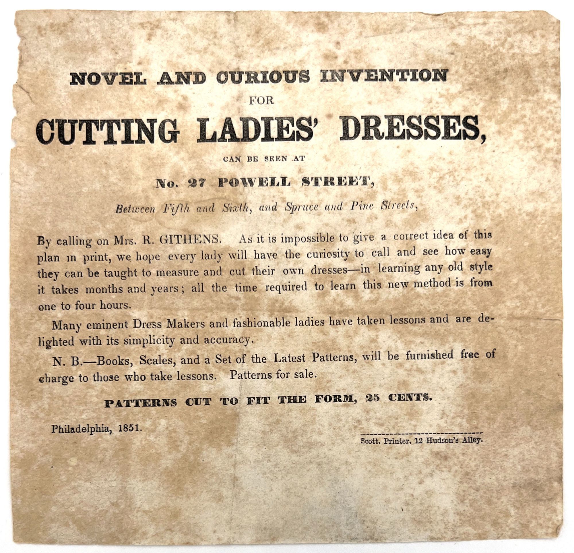 Philadelphia, Pennsylvania: Scott, Printer, 12 Hudson's Alley, 1851. Very good. Foxed with some edge wear, short tears, minor water staining.. Printed handbill advertising a "Novel and Curious Invention for Cutting Ladies' Dresses" by Mrs. R. Githens, who hopes "every lady will have the curiosity to call and see how easy they can be taught to measure and cut their own dresses--in learning any old style it takes months and years; all the time required to learn this new method is from one to four hours" (recto). We have located advertisements for Mrs. Githens' dressmaking and embroidering services from as early as 1849 (29 Nov., Public Ledger), but this appears to be her first advertisement for her "DIY" lessons showing women how to cut their own dress patterns. "Mrs. R. Githens" is most likely the maiden name for Eliza R. Bell, formerly Githens (c.1824-1863), wife of Josiah Bell (c.1820-?). Measures 6" by 6", verso blank. "Many eminent Dress Makers and fashionable ladies have taken lessons and are delighted wit its simplicity and accuracy
