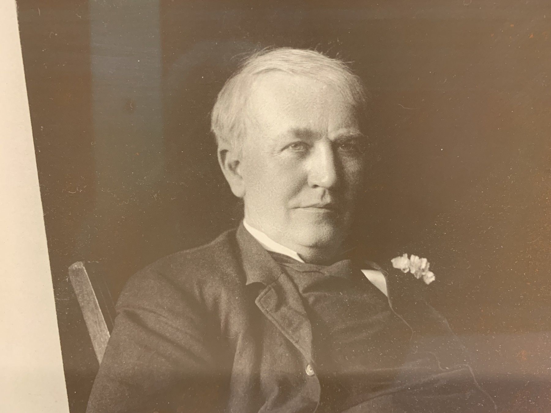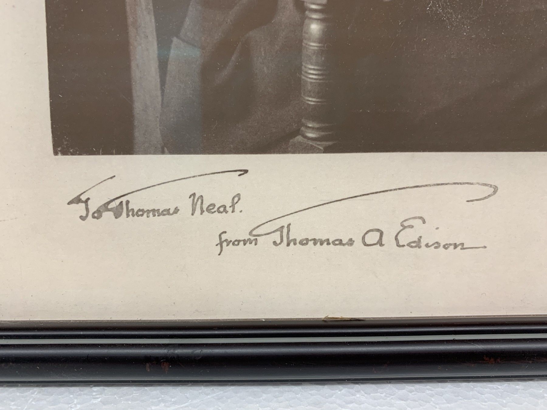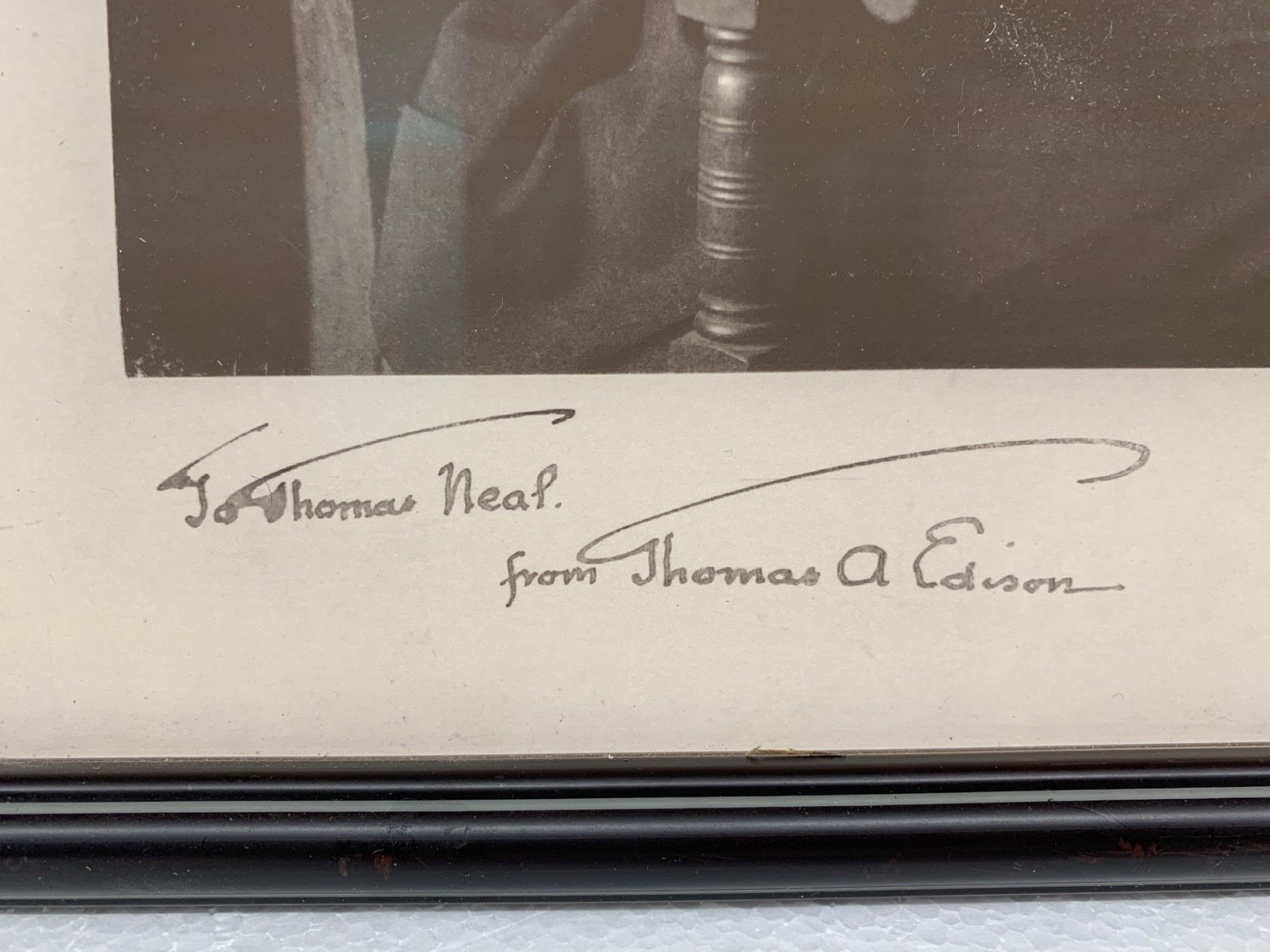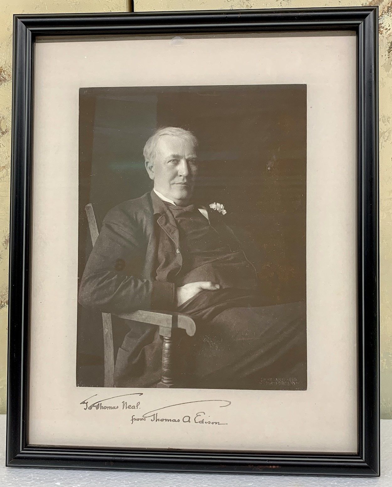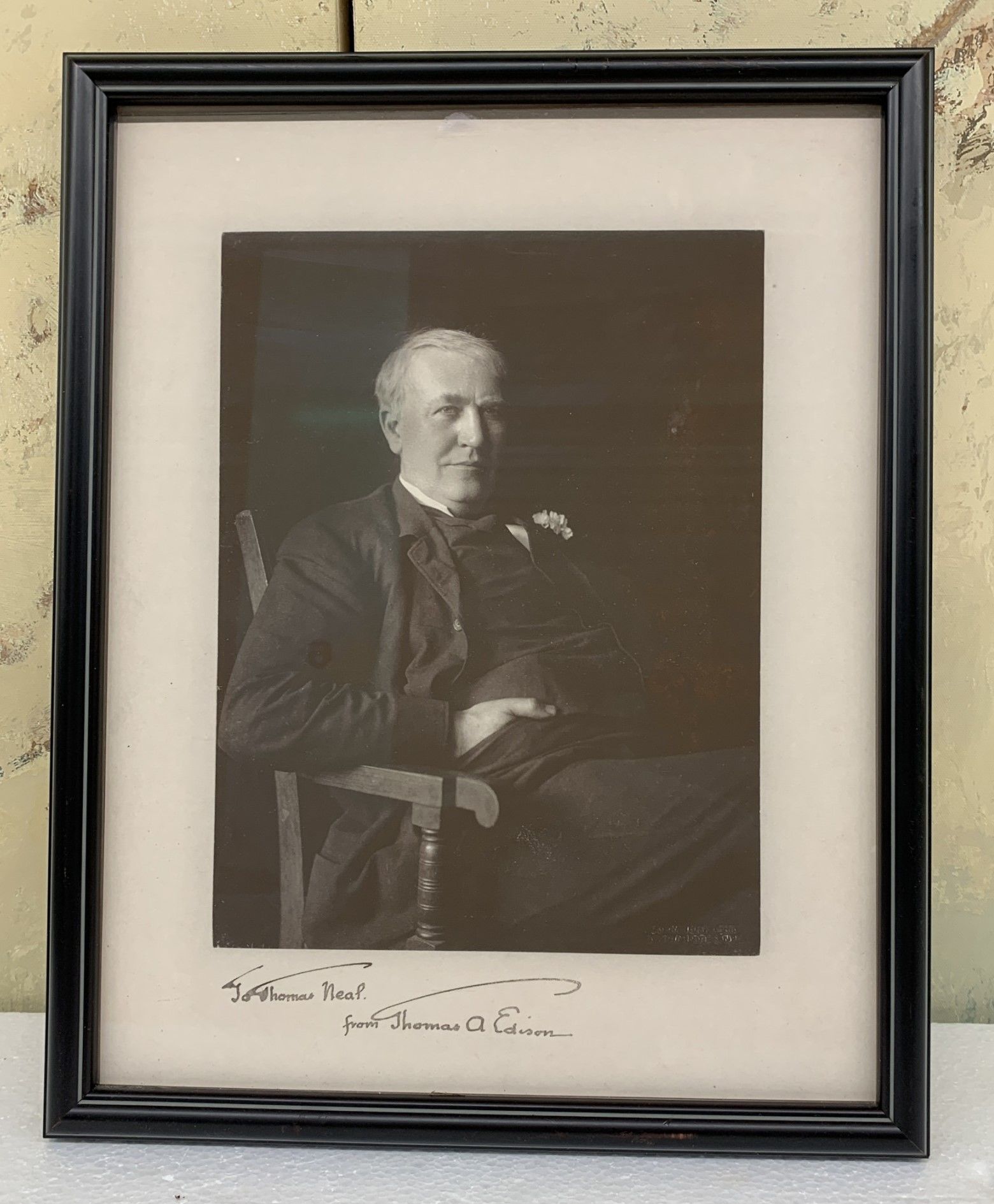 Framed Autograph. Not examined out of frame, but appears to be Fine. A 7-1/2" x 10" black-and-white portrait printed on 11-1/2" x 14-1/2" paper with the Pach Bros. 1906 imprint at the bottom right of the image. INSCRIBED and SIGNED "To Thomas Neal./from Thomas A. Edison" below the image. Framed to an overall size of 12" x 15". A fine SIGNED photo portrait of Edison in his prime showing the great inventor and entrepreneur seated in three-quarters profile, wearing a three-piece suit with a carnation in his lapel.
