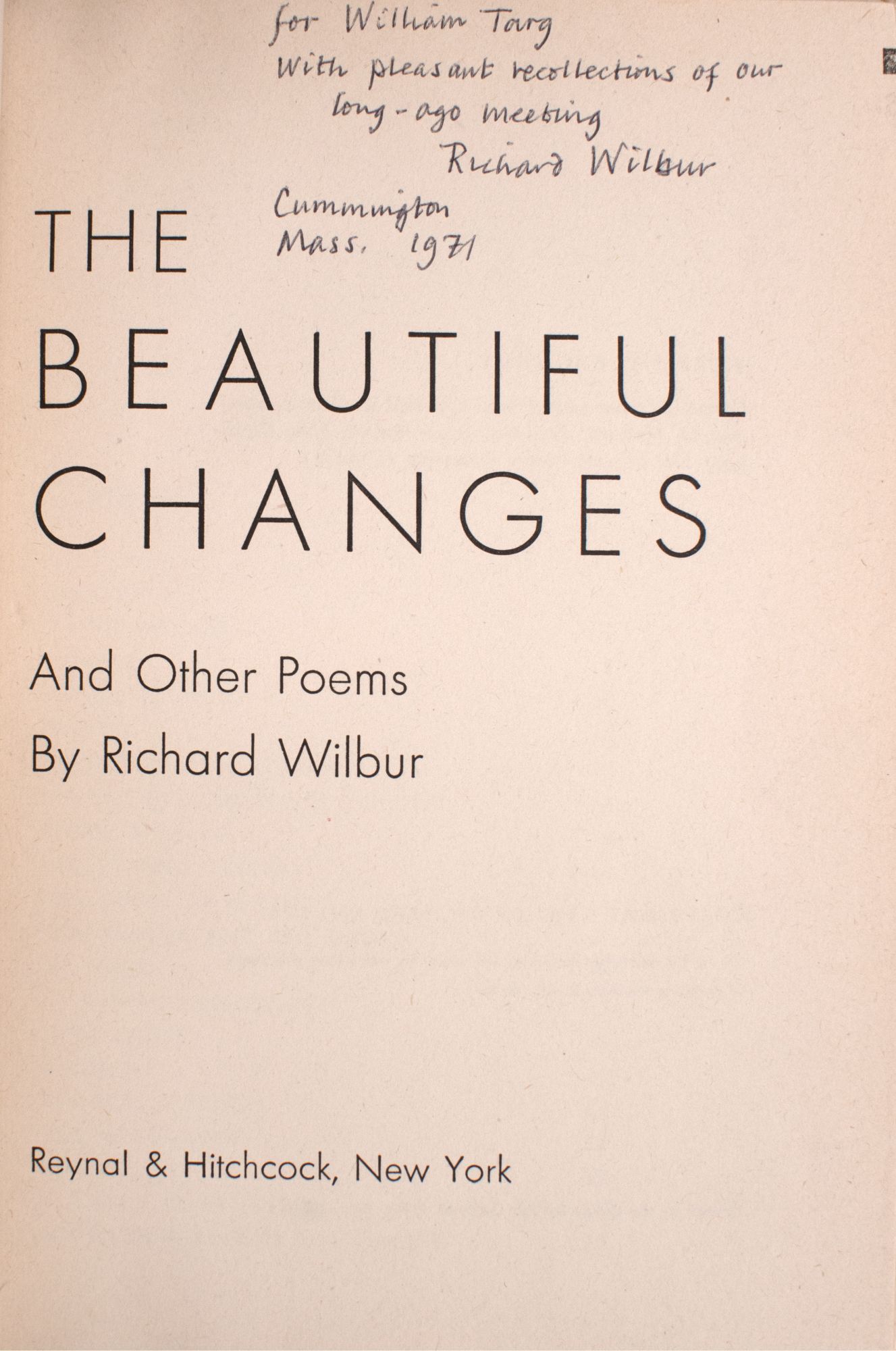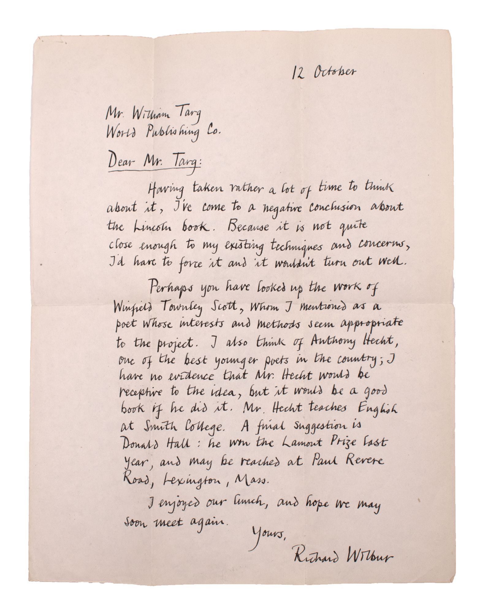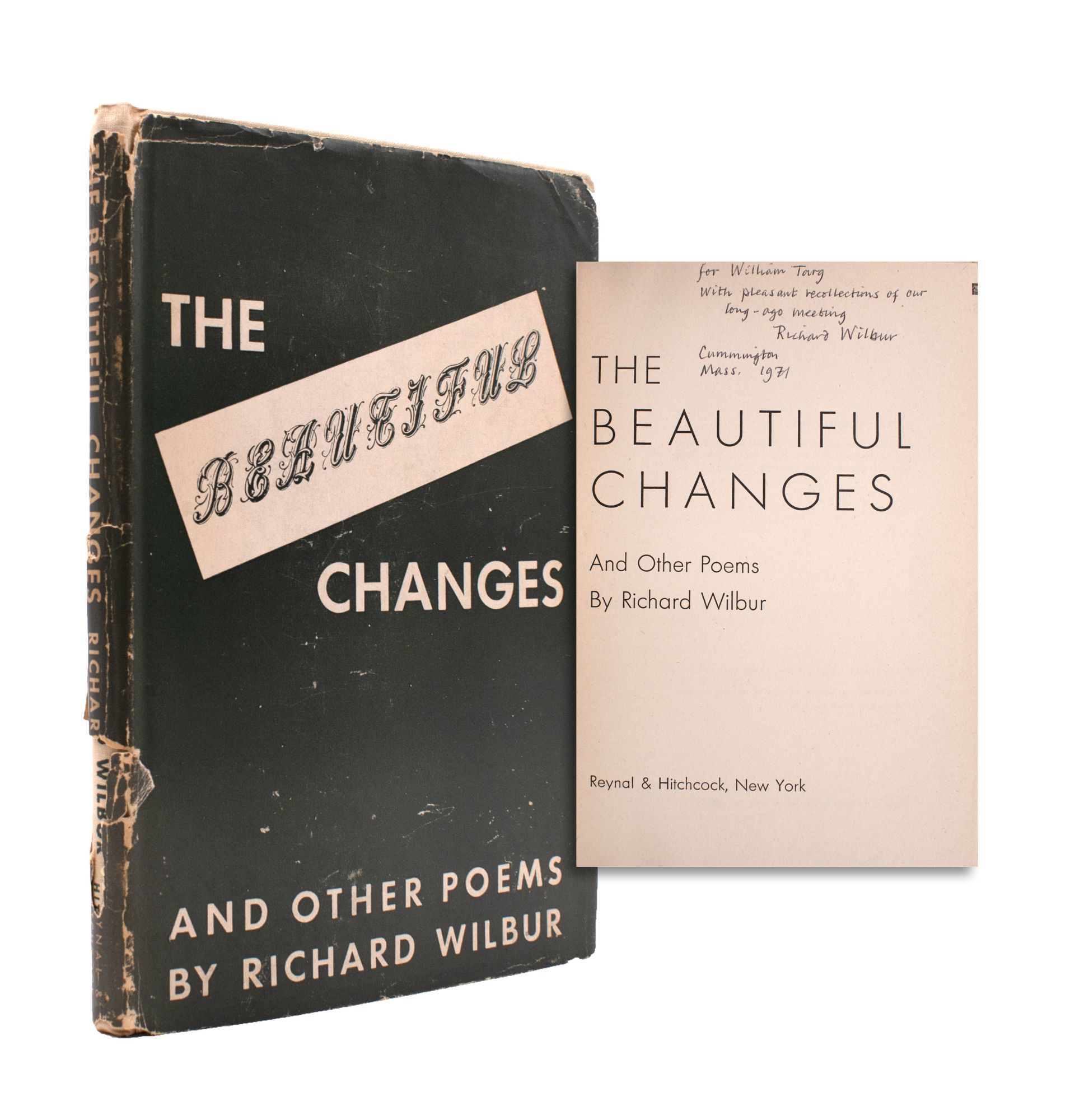 New York: Reynal & Hitchcock, 1947. 55 pp. 8vo. First edition of Wilbur's first book of poetry, published in an edition of 750 copies. 55 pp. 8vo. Presentation copy, inscribed to William Targ on the title: "For William Targ / With pleasant recollections of our long-ago meeting / Richard Wilbur Cummington Mass. 1971." And with a fine autograph letter signed ("Richard Wilbur") laid in, to the writer and editor William Targ, 12 October n.y. [but before 1964 when Targ left the firm]. One page, 4to, folded. Wilbur writes to Targ at World Publishing Co. saying that he has reached "a negative conclusion about the Lincoln book. Because it is not quite close enough to my existing techniques and concerns, I'd have to force it and it wouldn't turn out well." Wilbur goes on to suggest some possible alternatives, including Winfield Towley Scott, Anthony Hecht "one of the best younger poets in the country," and Donald Hall. A very fine letter, revealing Wilbur's thoughts on some of his contemporaries. Original tan cloth; printed dust jacket. Provenance: William Targ, American author, editor, and publisher. A very good copy in a somewhat worn jacket, with chips at corners, and a loss affecting text along spine panel