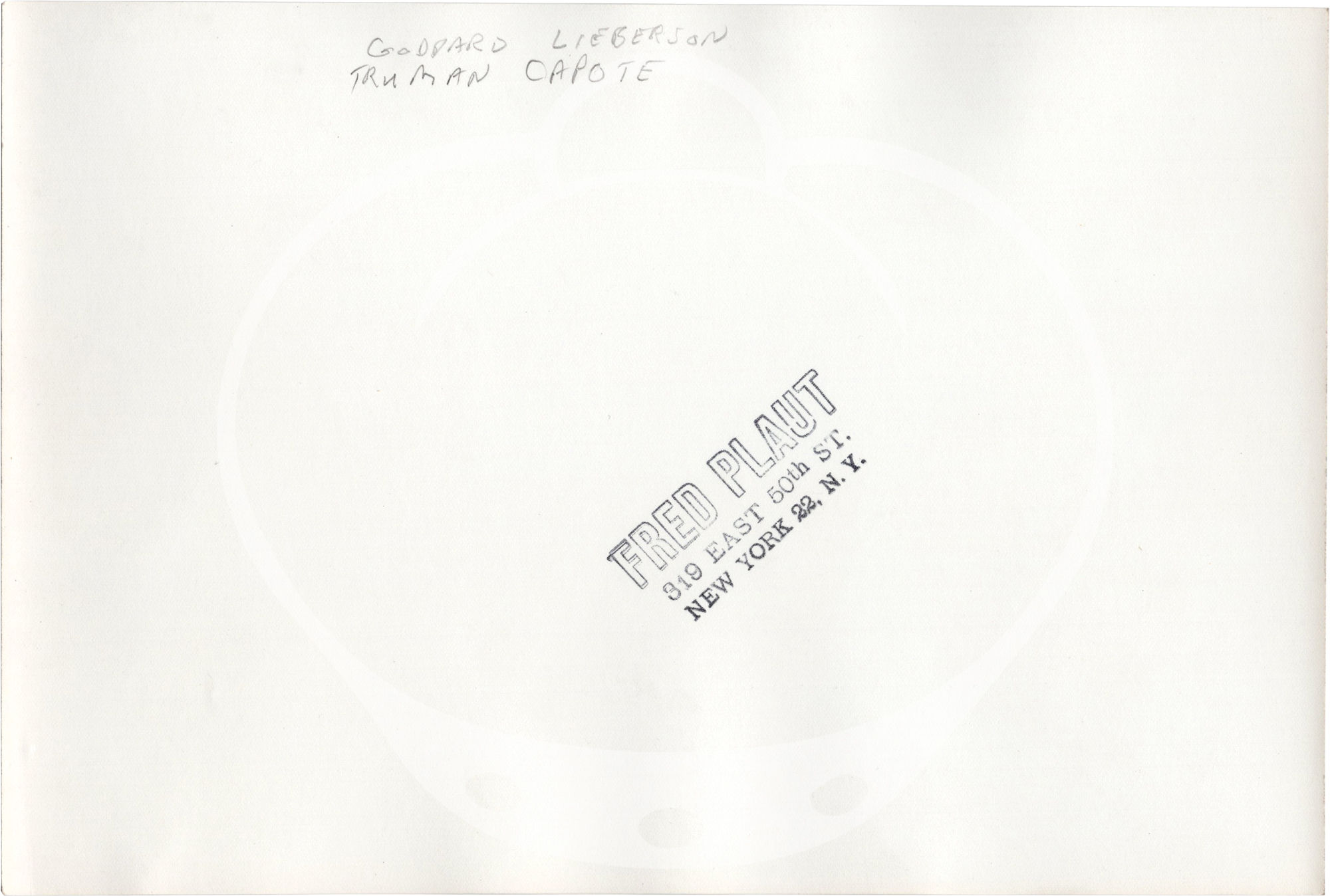 In 1953 Capote made his first spoken word recording for the 1953 "Columbia Literary Series," a twelve lp box set of noted authors reading short stories, essays, and novel excerpts, conceived and edited by Lieberson, then Columbia Records vice president. Capote's contribution to the set was his 1948 short story, "Children on Their Birthdays." Capote's only other spoken word recording for Columbia Records was in 1955 for a 10" lp for Columbia Masterworks of the 1950 short story "House of Flowers," published in 1950 in the literary journal Botteghe Oscure VI and reprinted in "Breakfast at Tiffany's" in 1958. It is one of these two recording sessions, likely the former as we find no evidence Lieberson was involved with the latter, that are the probable settings for the photographs found here. Either date would also correspond with the address in Plaut's photographer stamps on the versos, "319 East 50th St. New York 22 NY," which uses the "22" New York postal zone, in use from the 1940s until 1963.