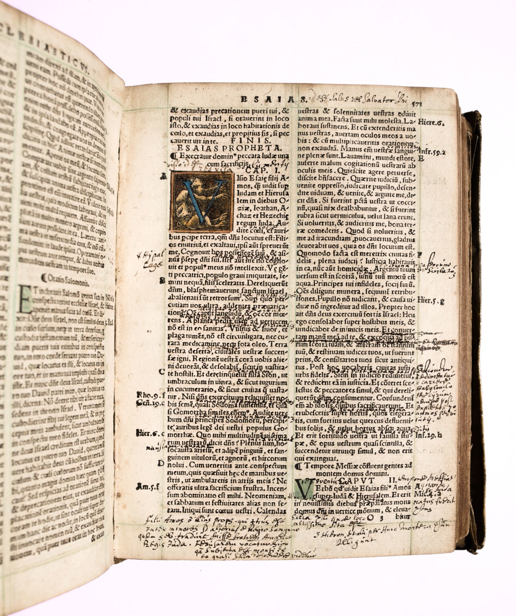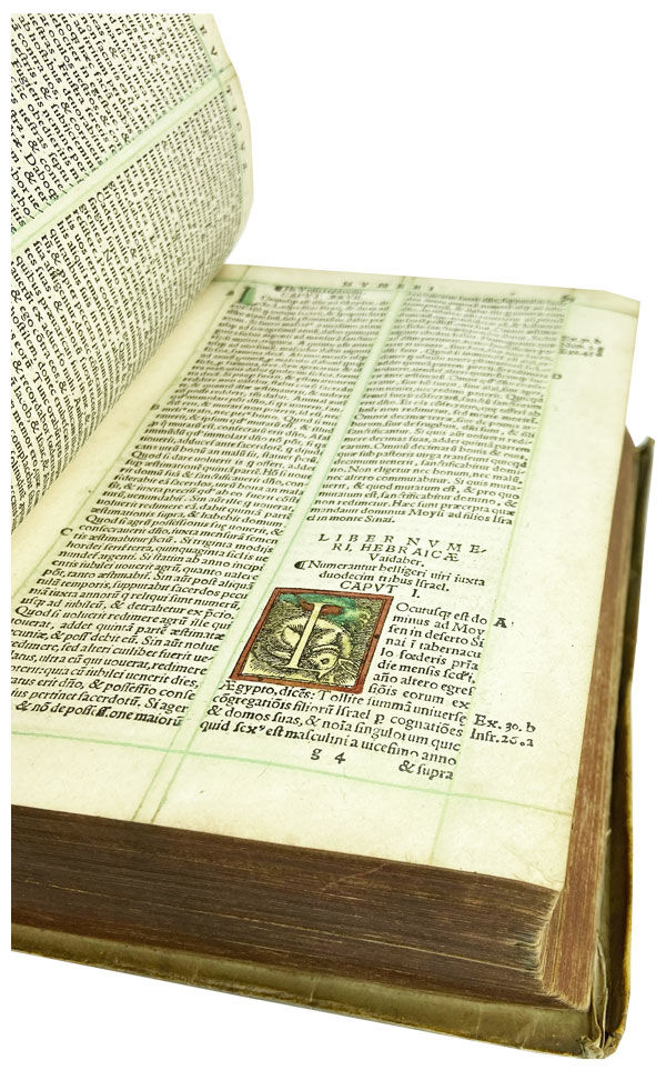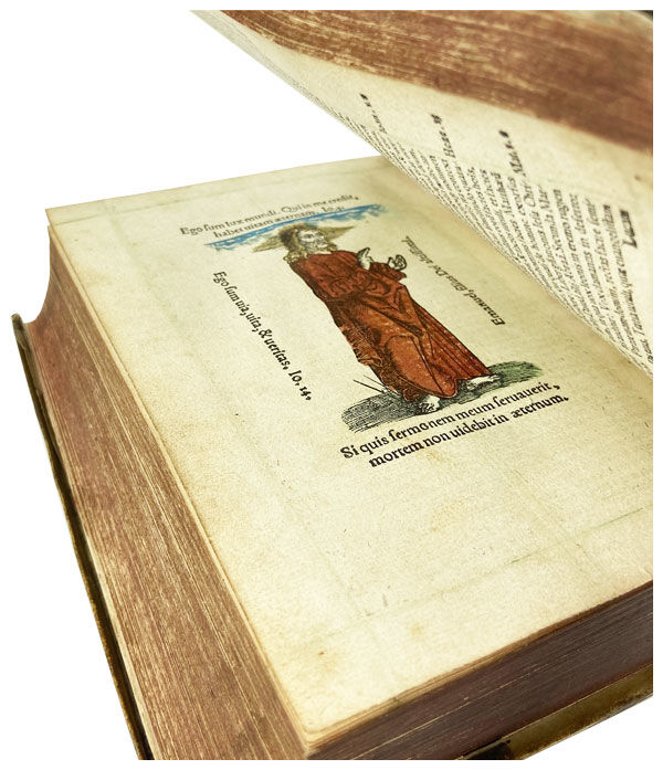 Argenorati [Strasbourg]: Ioannem Schottum [Johann Schott], 1535. Very Good. Argenorati [i.e. Strasbourg]: Ioannem Schottum [Johann Schott], 1535. First Thus. Thick octavo (6.75" x 5"); full contemporary parchment, faint manuscript spine titling, all edges stained dark red; [26],1008 [i.e. 1009],[11]pp. ([*]8 a-z8 A-2S8 2T4).; contemporaneously hand-colored title page printed within engraved border, hand-colored full-page woodcut facing p. 804, woodcut initials throughout (all hand-colored), text printed in double column within unusual verdigris green ruling. Imprint found on final leaf of text only.