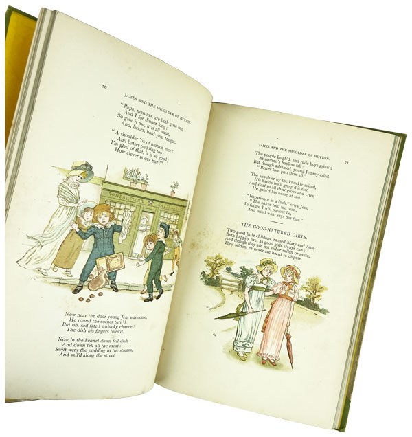 London: George Routledge & Sons, 1882. Very Good -. London: George Routledge & Sons, n.d. [1882]. First Edition. Slim octavo; publisher's olive cloth over pictorial glazed cream paper-covered boards, all edges stained blue, bright yellow glazed endpapers; 64pp.; illus. throughout printed in color by Edmund Evans. Boards a bit scuffed and paper rather discolored from dust soil, corners bumped, textblock foxed and occasionally finger-soiled, else a Good to Very Good copy.