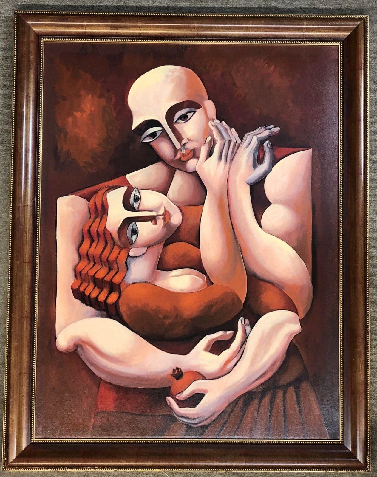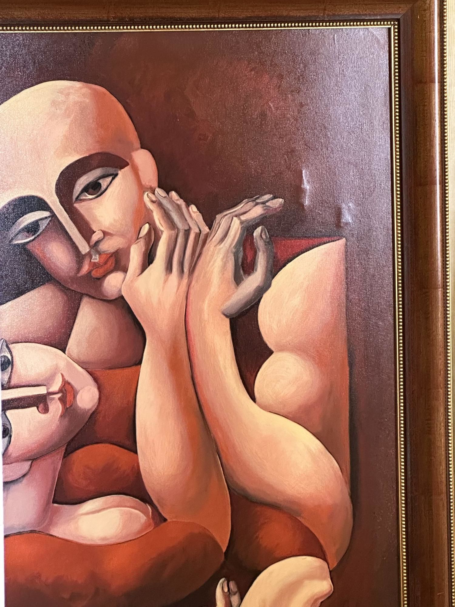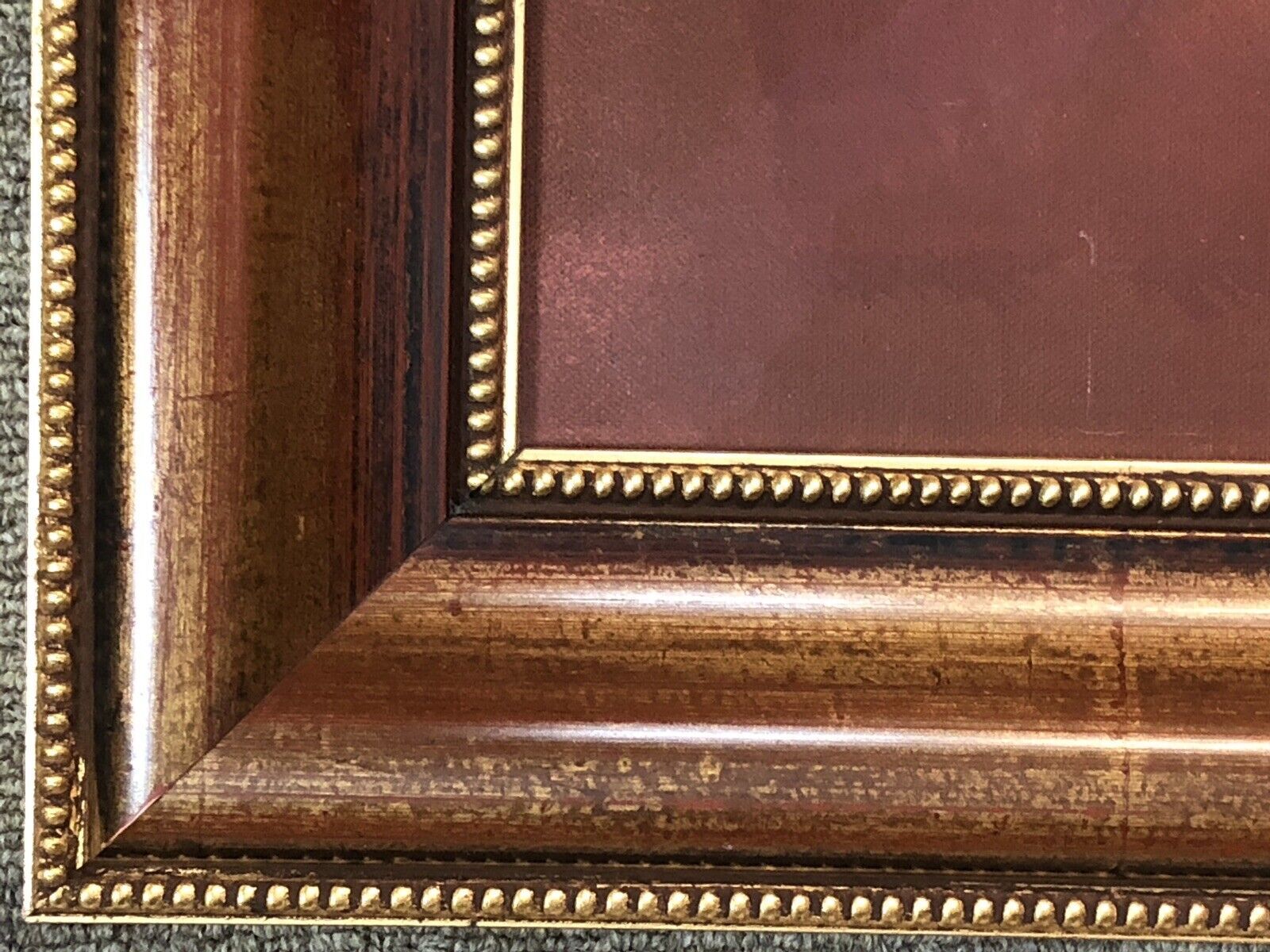 1998. Limited Edition No.69/150. Printed on canvas and numbered 69/150 in upper left corner. Canvas housed in wood frame measuring 39" x 49 5/8" (the print measures 30" x 40"). Serigraph is in very good condition with canvas slightly pushed out above man's shoulder in upper right of painting (one bump measures 2 1/4" x 1/2", the other 1 1/4" x 3/4").. Frame has a few small scrapes and chips along the edges, and the gold-colored paint is wearing away along the frame face and edges. ES Consignment. Shelved in Rockville.