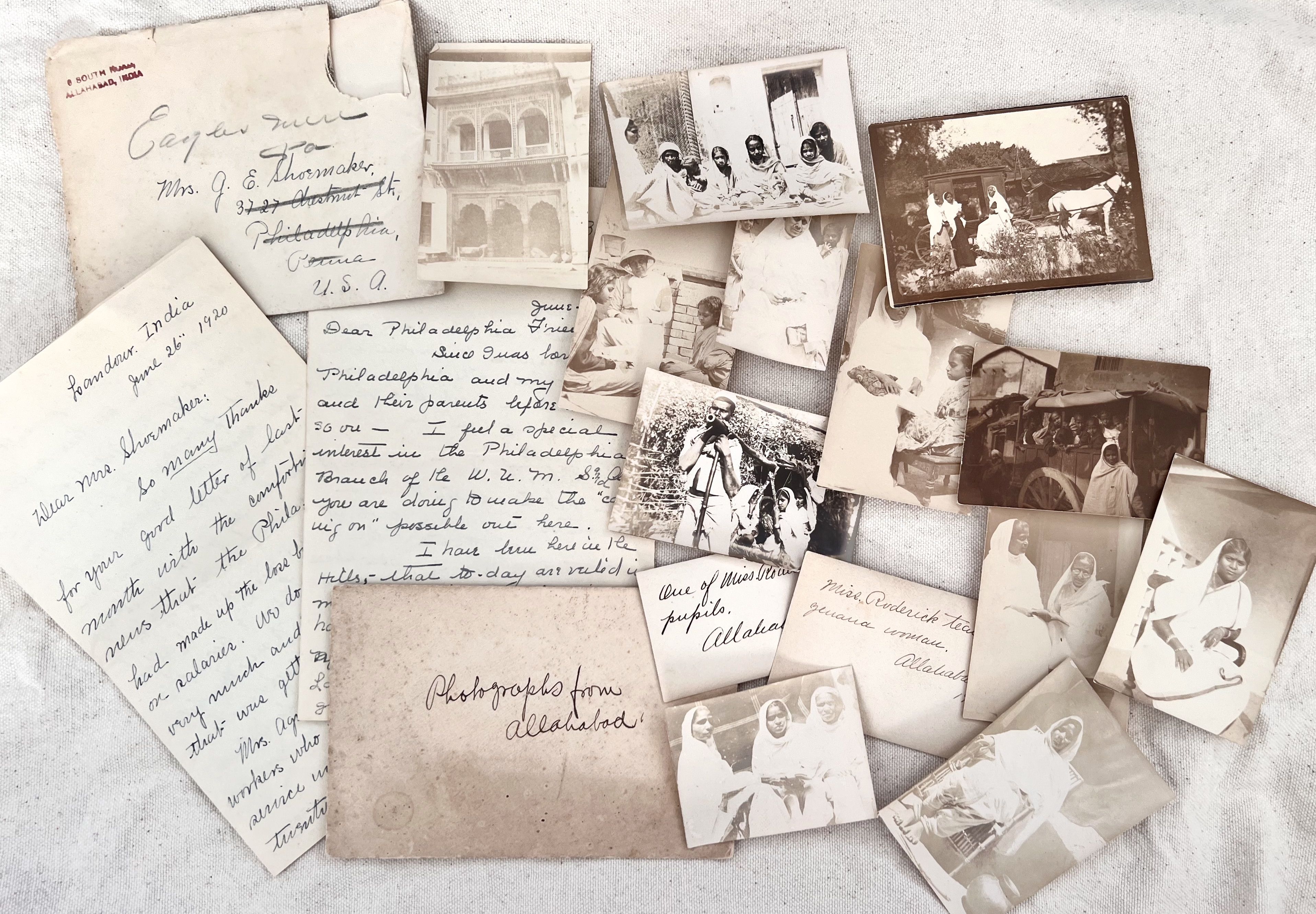 1920. Two handwritten letters and 10 small black and white photos. Two letters, one each from Missionaries Alice Wishart and Lucy Powel. Both letters are addressed to Mrs. J.E. Shoemaker of Philadelphia. The letters talk of their work in India and the financial strain on the missionaries and the Indian staff. Both the letters and the photos are from the Indian city Allahabad, officially known as Prayagraj - a metropolis in the Indian state of Uttar Pradesh. Women's Missionary auxiliaries, like temperance groups and women's clubs, appealed to middle-class Victorian era and early 20th century women as an opportunity for a vicarious (or real) experience that was both pious and adventurous. All letters have handwritten descriptions on the verso.