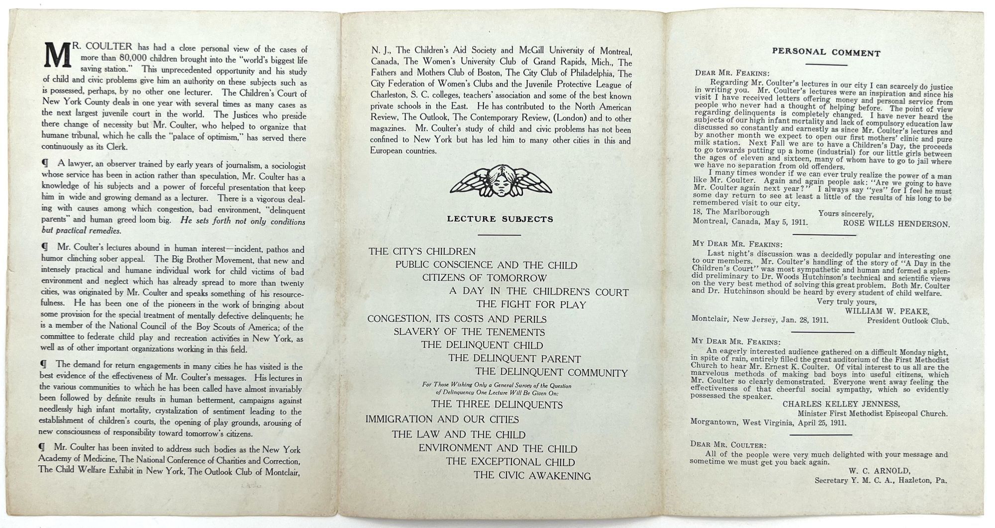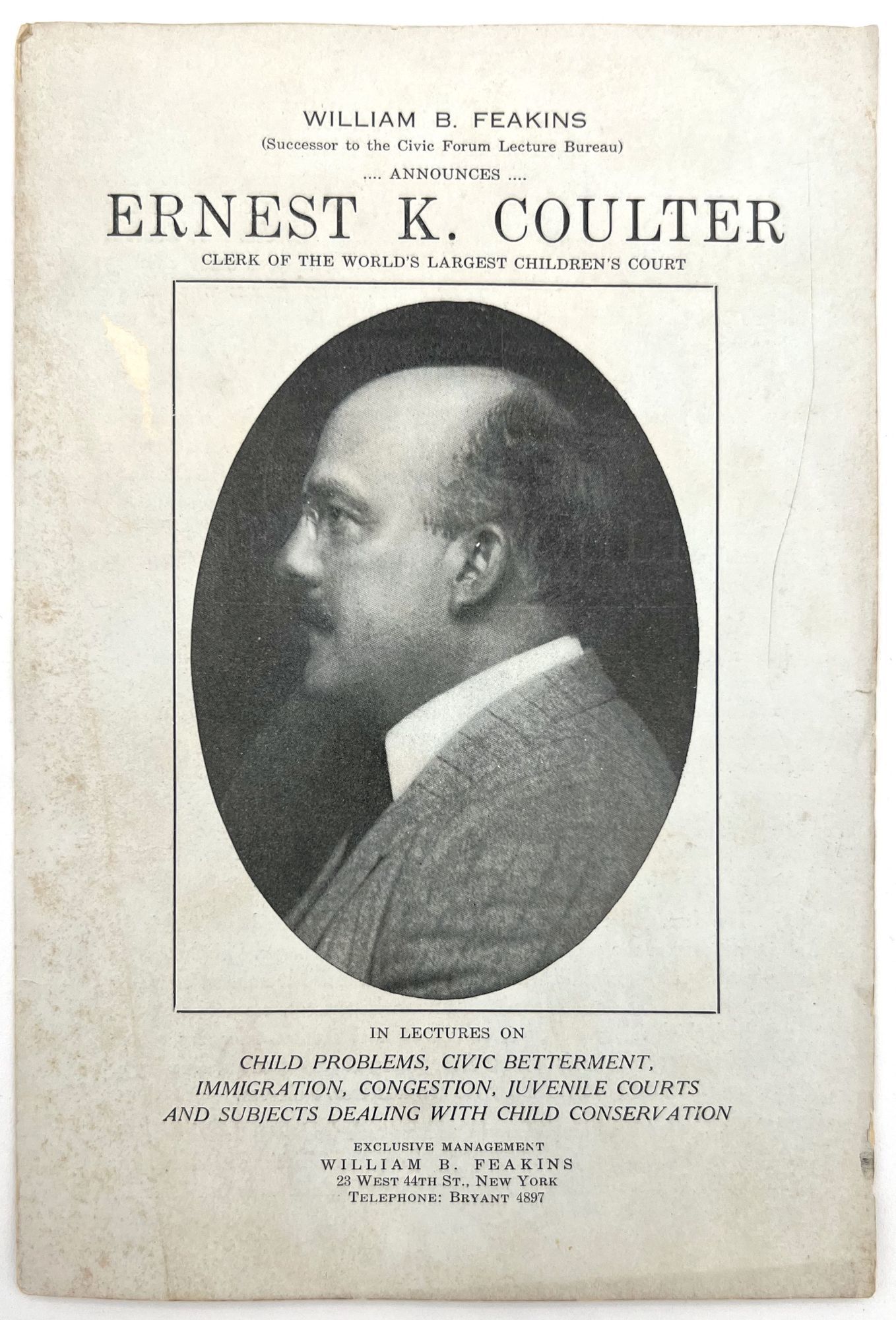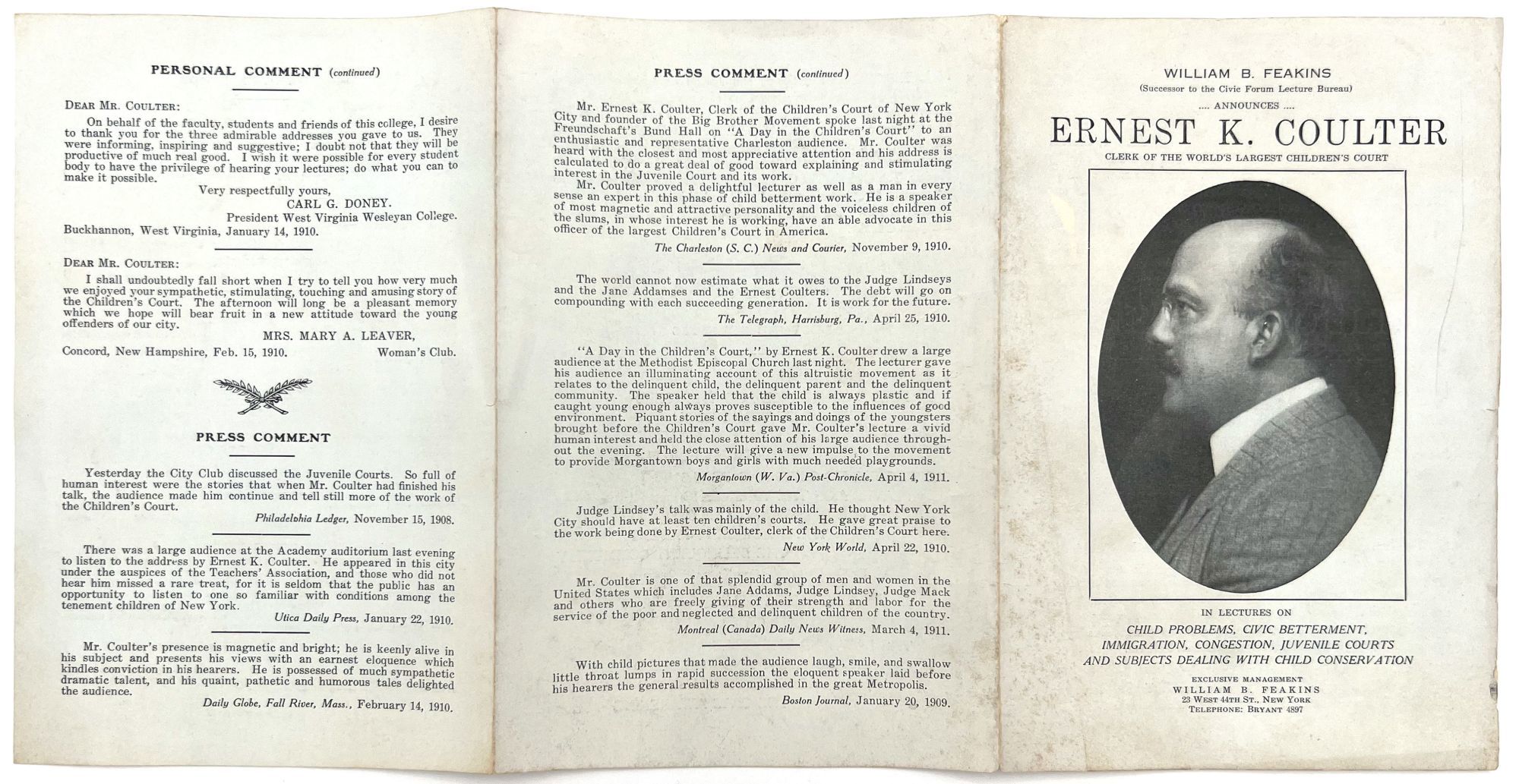 New York, New York, 1911. Good. Some spotting, dust soiling, minor wear to extremities. Short tears to folds.. Printed program announcing lectures given by journalist and child welfare advocate Ernest Kent Coulter (1871-1952). The program promotes Coulter as the "Clerk of the World's Largest Children's Court" whose lectures "abound in human interest--incident, pathos and humor clinching sober appeal". It also notes the fact that he originated the "Big Brother Movement" (referred to today as Big Brothers and Sisters of America), "that new and intensely practical humane and individual work for child victims of bad environment and neglect". Coulter's lecture topics here are listed as "Child Problems, Civic Betterment, Immigration, Congestion, Juvenile Courts and Subjects Dealing With Child Conservation". Testimonials are offered under the heading "Personal Comment". Tri-fold pamphlet (7.5" by 5" closed) with photographic portrait of Coulter on title-page.